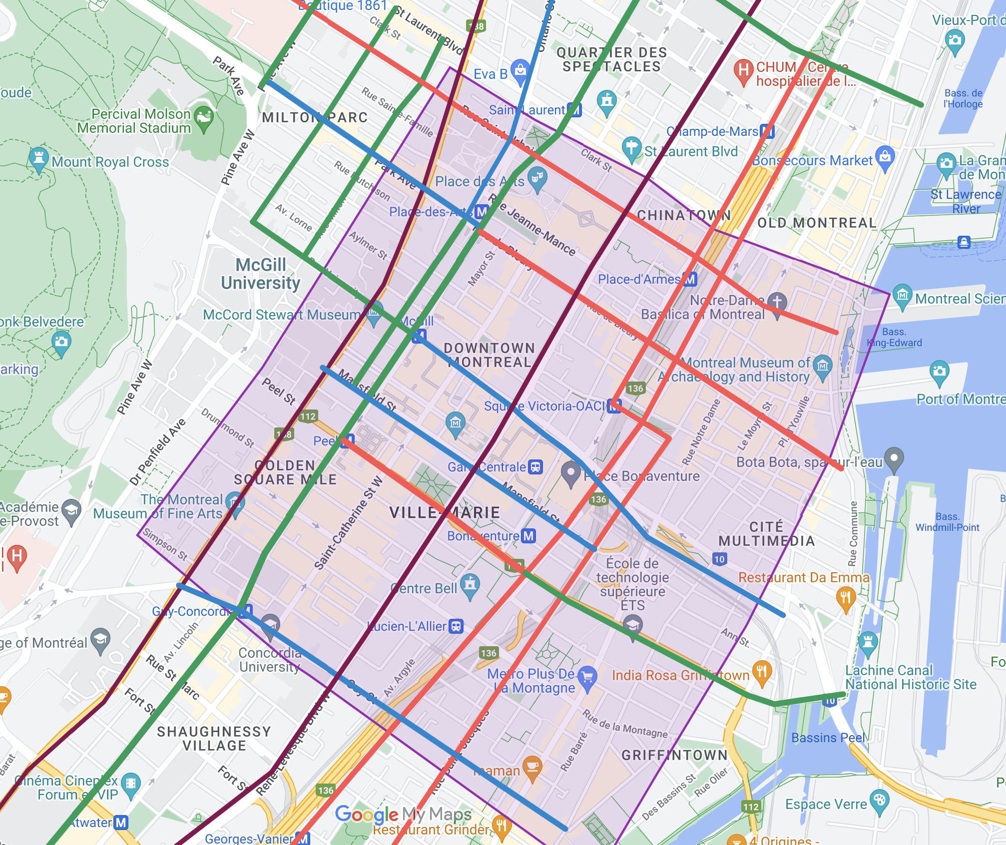 Pour le Centre-Ville, quelques idées, approximatives. Même si certains axes ne sont pas structurants (ex. Mansfield), ils permettent quand même de connecter le réseau et éviter de grands détours.