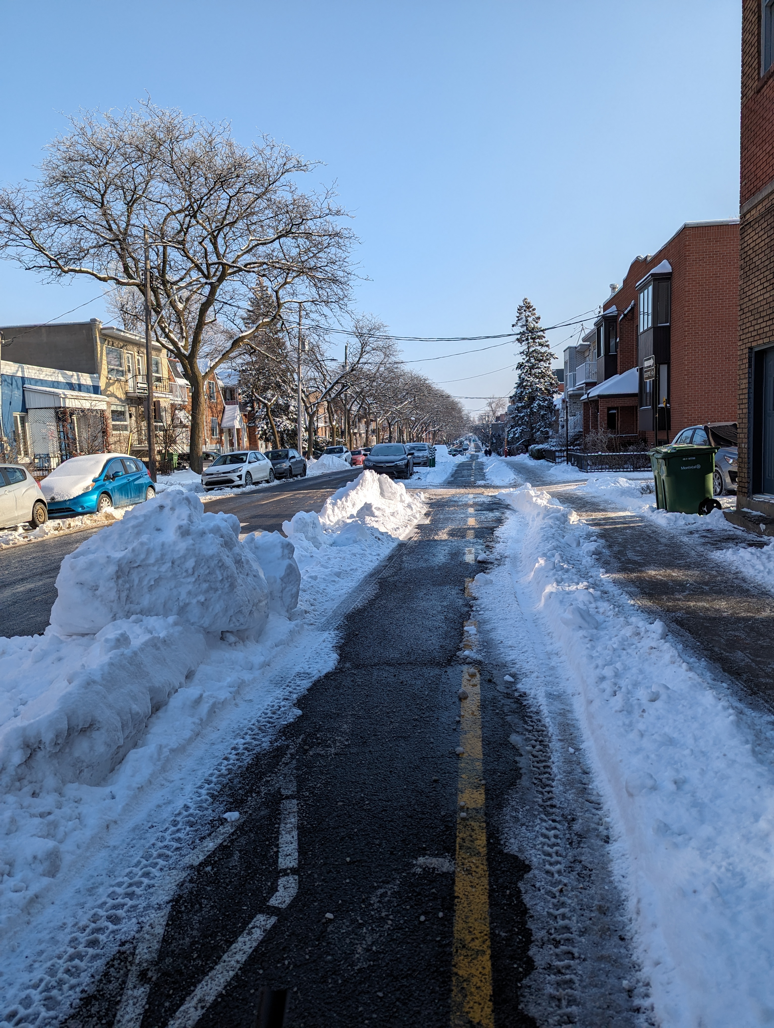 En été, une voie si étroite serait très dangereuse, mais en hiver quand il n’y a pas beaucoup de cyclist·e·s qui l’empruntent et quand les cyclist·e·s roulent plus lentement, je trouve que ce n’est pas un problème. Ça ne dure jusqu’à la fin des opérations de déneigement, ou quelques jours. ![]()