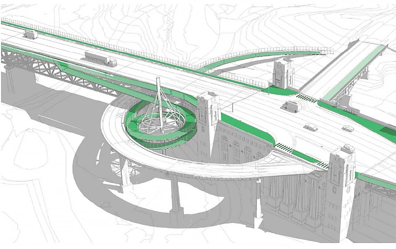 Enlever les piétons de la piste cyclable actuelle aiderait beaucoup déjà ! Tout ce qu’on a besoin c’est de mieux indiquer qu’il y a un trottoir du côté est., avec un passage sous le tablier du pont pour rejoindre le parc.