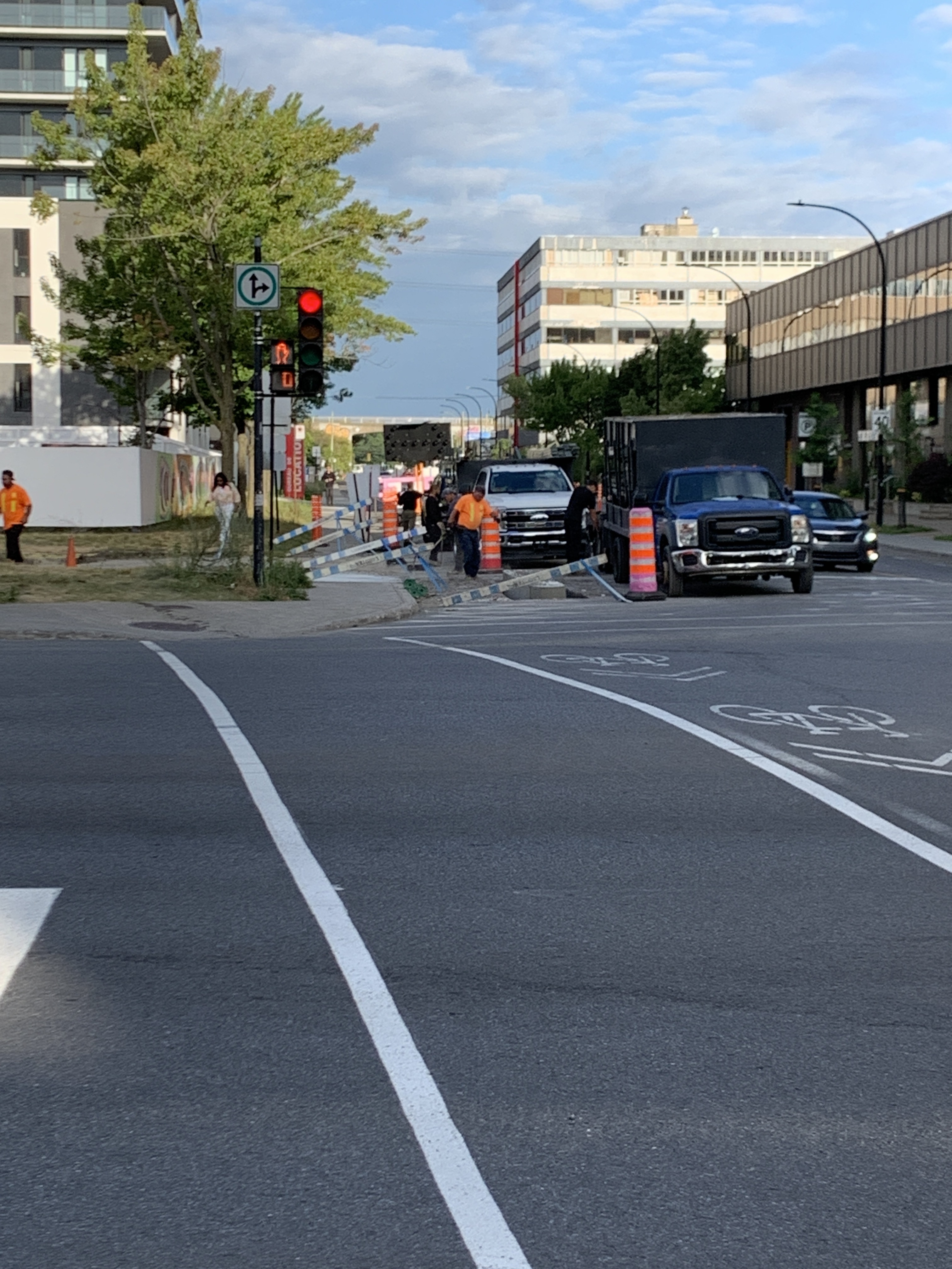 Un séparateur en béton est en cours d’installation au coin Meilleur / Chabanel.