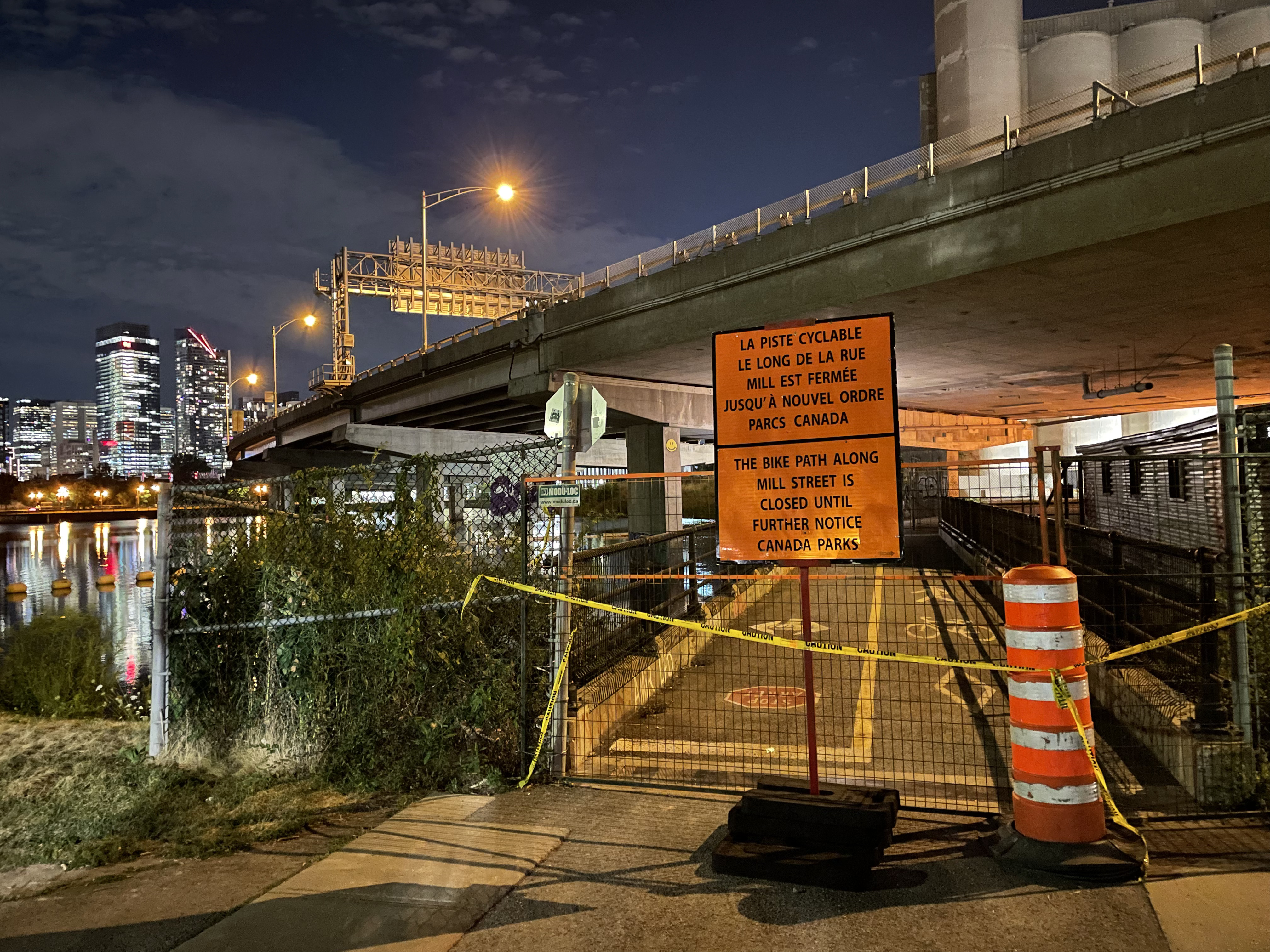 J’imagine que cette fermeture d’une durée indéterminée est liée à l’incident de délit de fuite qui a eu lieu récemment, et qui a été médiatisé. Vu que le problème est un petit tunnel qui ne sera pas facile à reconstruire, et que Parcs Canada semble incapable de bien gérer les pistes du canal, la ville devrait faire une piste sécurisée sur la rue Mill.