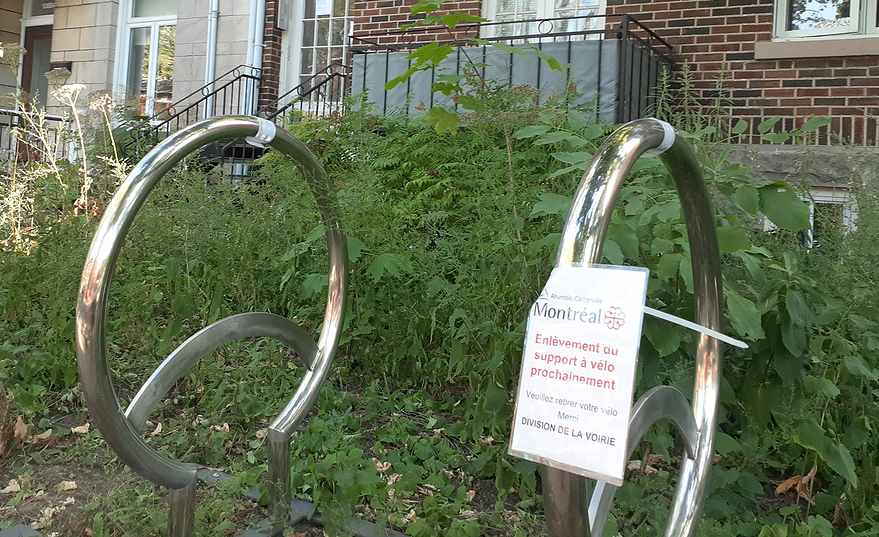 À notre arrivée, une affichette indique que ce support à vélo « sera enlevé prochainement ». Renseignements pris auprès de l’arrondissement, l’objet du délit est installé sur la partie appartenant à la Ville, devant l’édifice et non pas sur la partie privative du terrain.