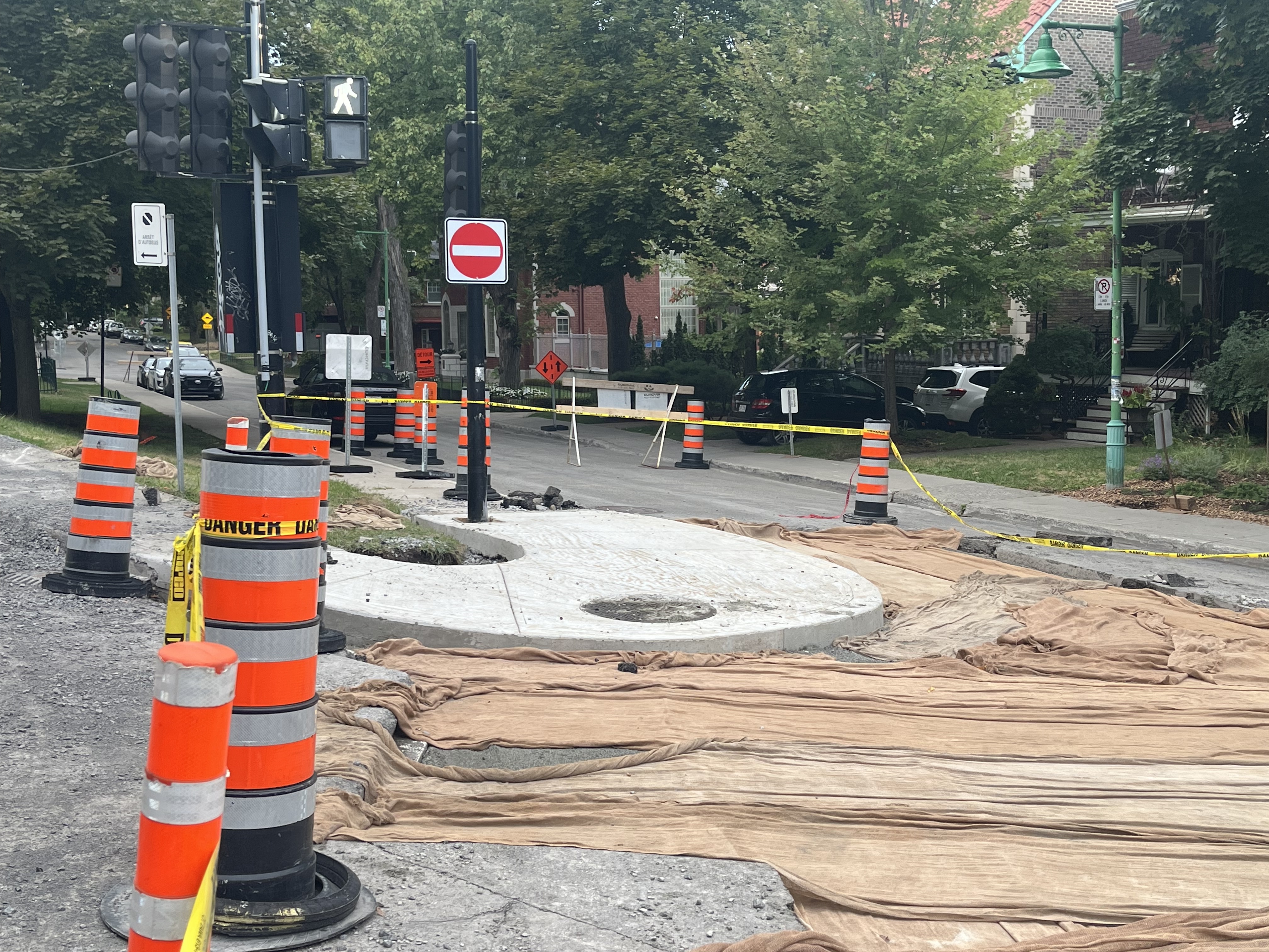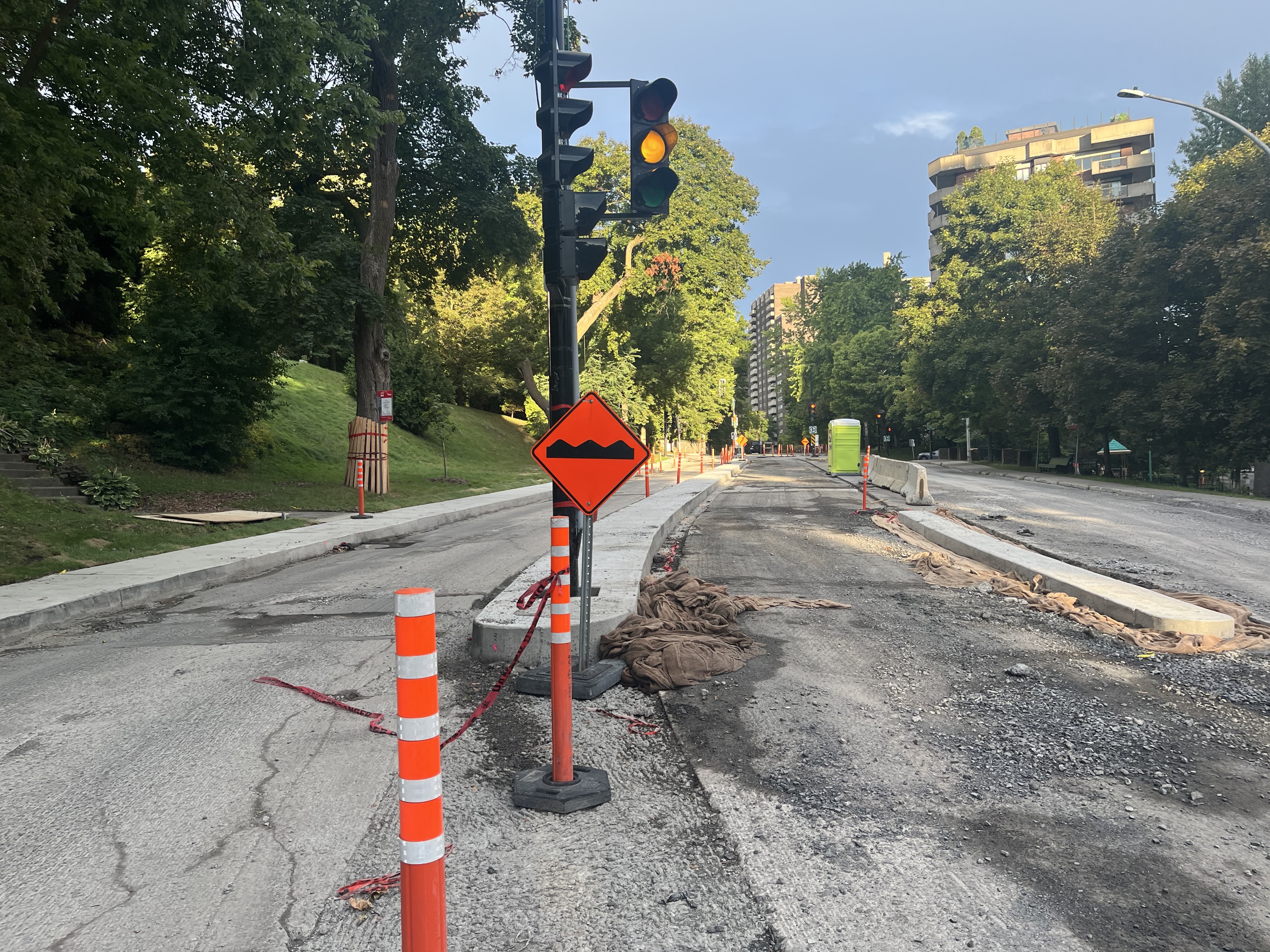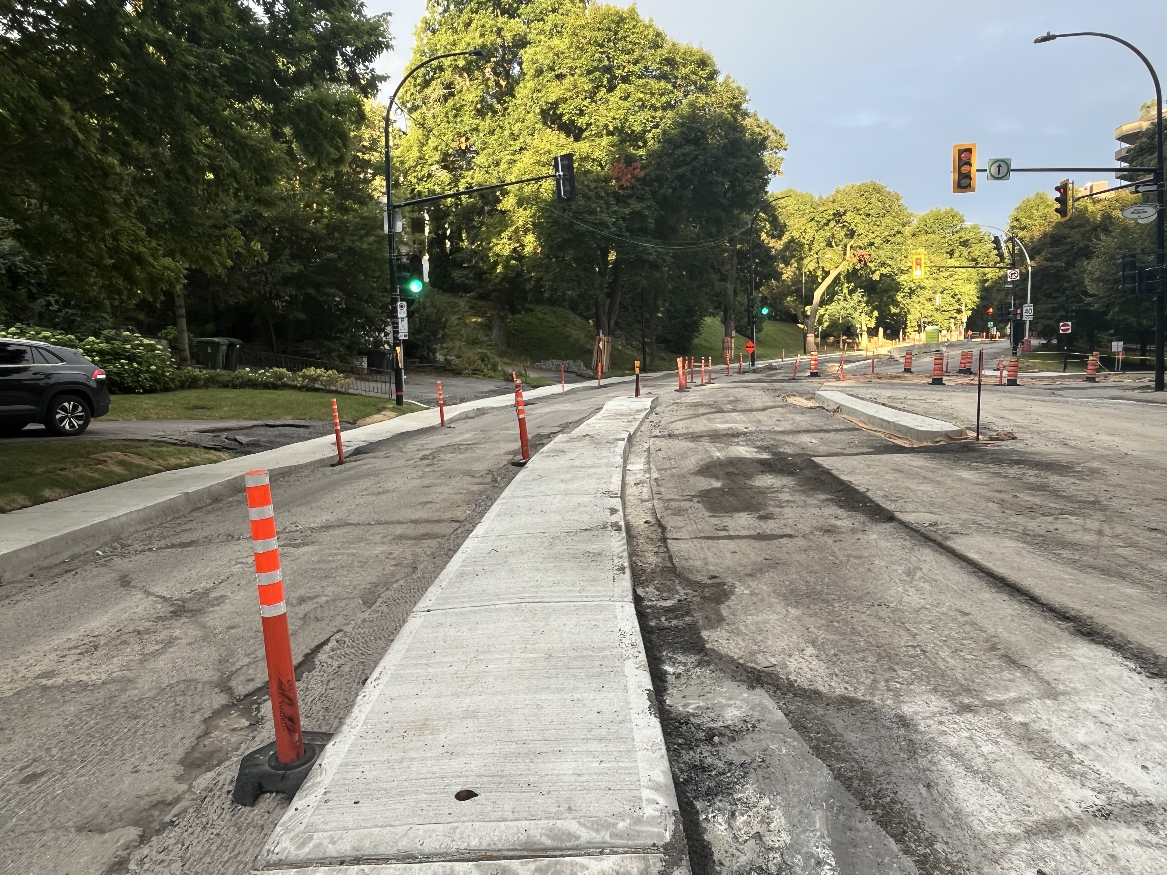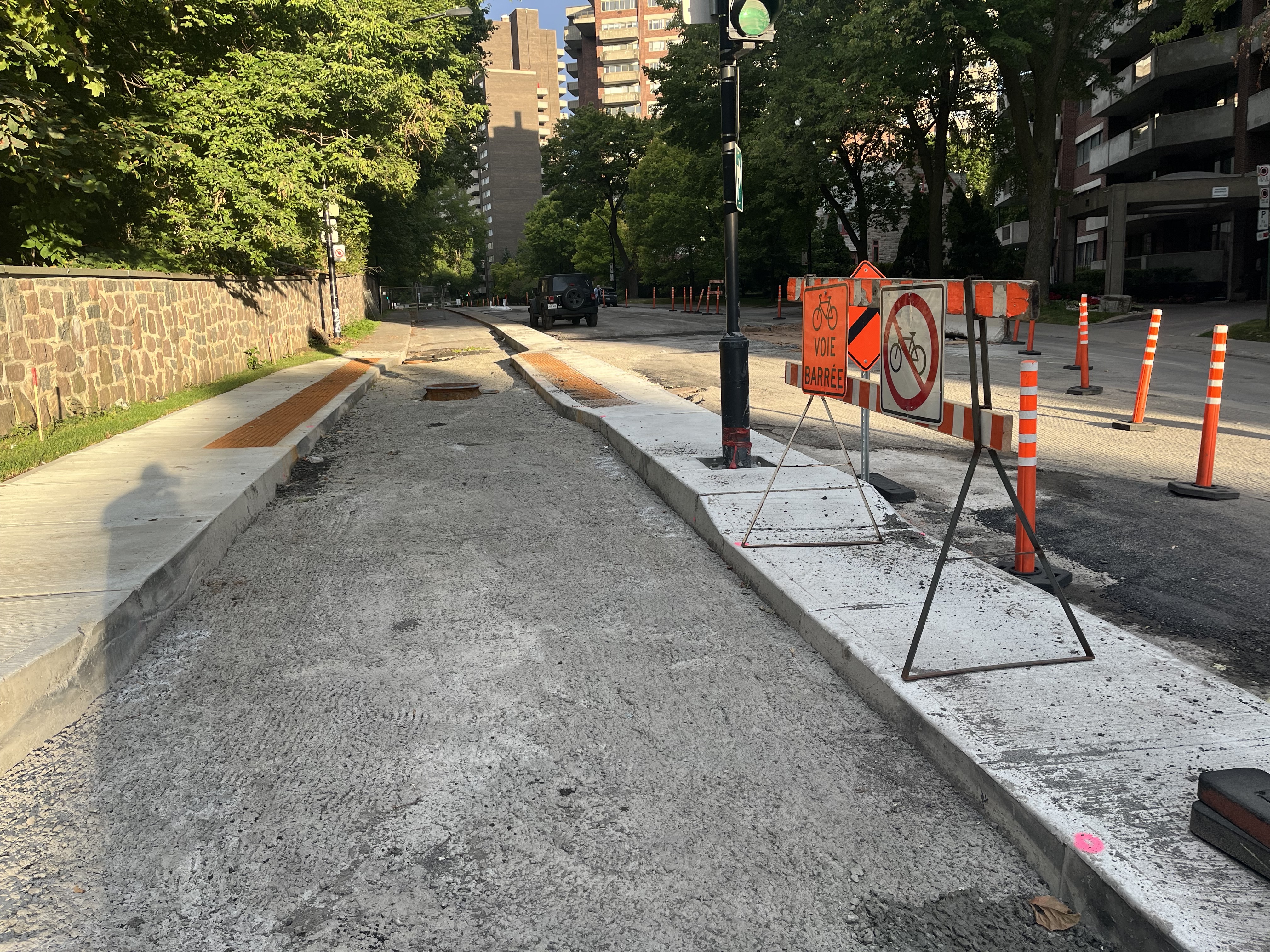 Côte-Sainte-Catherine ce matin. Les trottoirs sont terminés ainsi que les protections de béton aux traverses piétonnes.