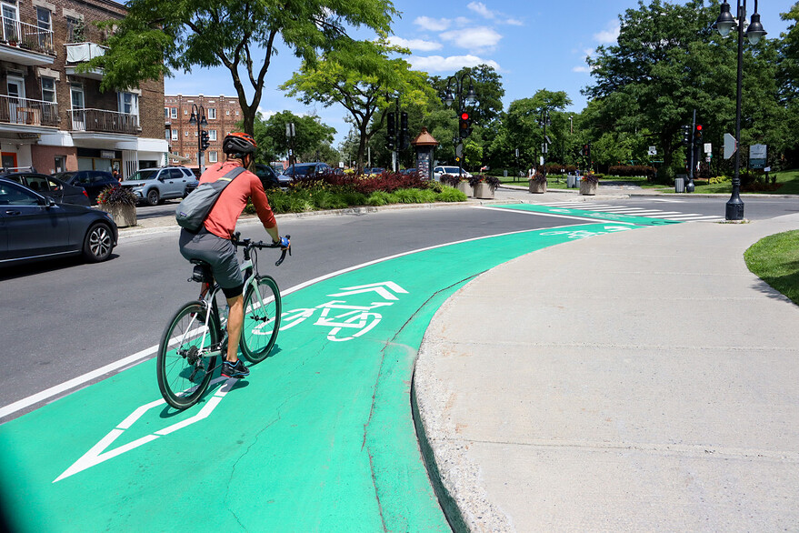 la Ville a décidé de modifier la configuration en direction est afin d’optimiser la sécurité de la circulation : le stationnement sera déplacé le long du trottoir, et la bande cyclable sera désormais située entre le stationnement et la voie de circulation des véhicules.