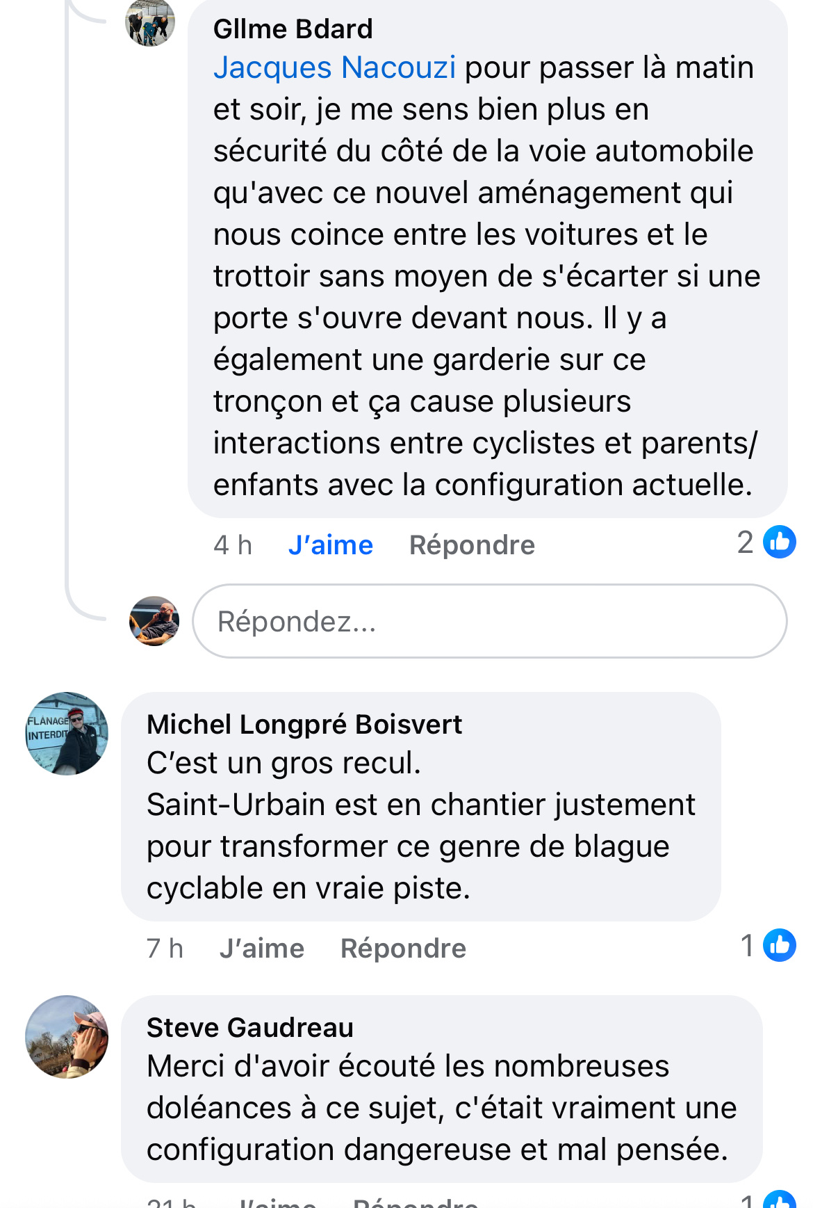 Soit ils ont fait la piste cyclable trop étroite entre les voitures stationnées et le trottoir et ça rendait effectivement ça non sécuritaire pour les cyclistes.