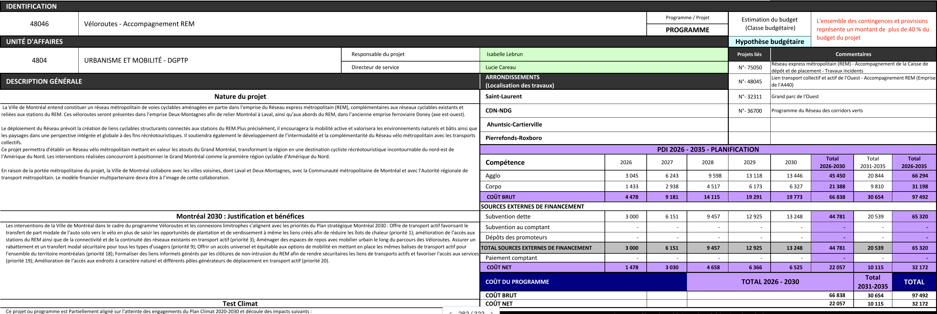 Mme Martinez Ferrada et l’équipe d’Ensemble Montréal concentreront davantage les sommes pour les «véloroutes» qui connecteront le réseau cyclable aux stations du Réseau express métropolitain (REM). Les budgets alloués à ces véloroutes passent de 44 M$ pour la période 2026-2029 ans à 47 M$. Le total sur 10 ans passe de 67,4 M$ à 97,5 M$.