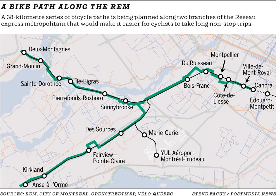 Si on veut faire un réseau cyclable utilitaire complémentaire, il faudrait surtout faire des pistes reliant les stations aux quartiers environnants, pas juste suivre le tracé du REM…