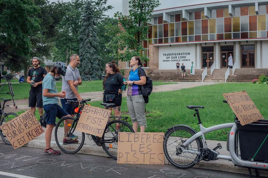 Afin de dénoncer l’occupation de cette bande pour vélos, souvent encombrée par des fidèles qui y stationnent leurs véhicules le jour de la messe, plusieurs cyclistes ont participé à un sit-in dimanche matin, orchestré par le collectif Vélorution Montréal.