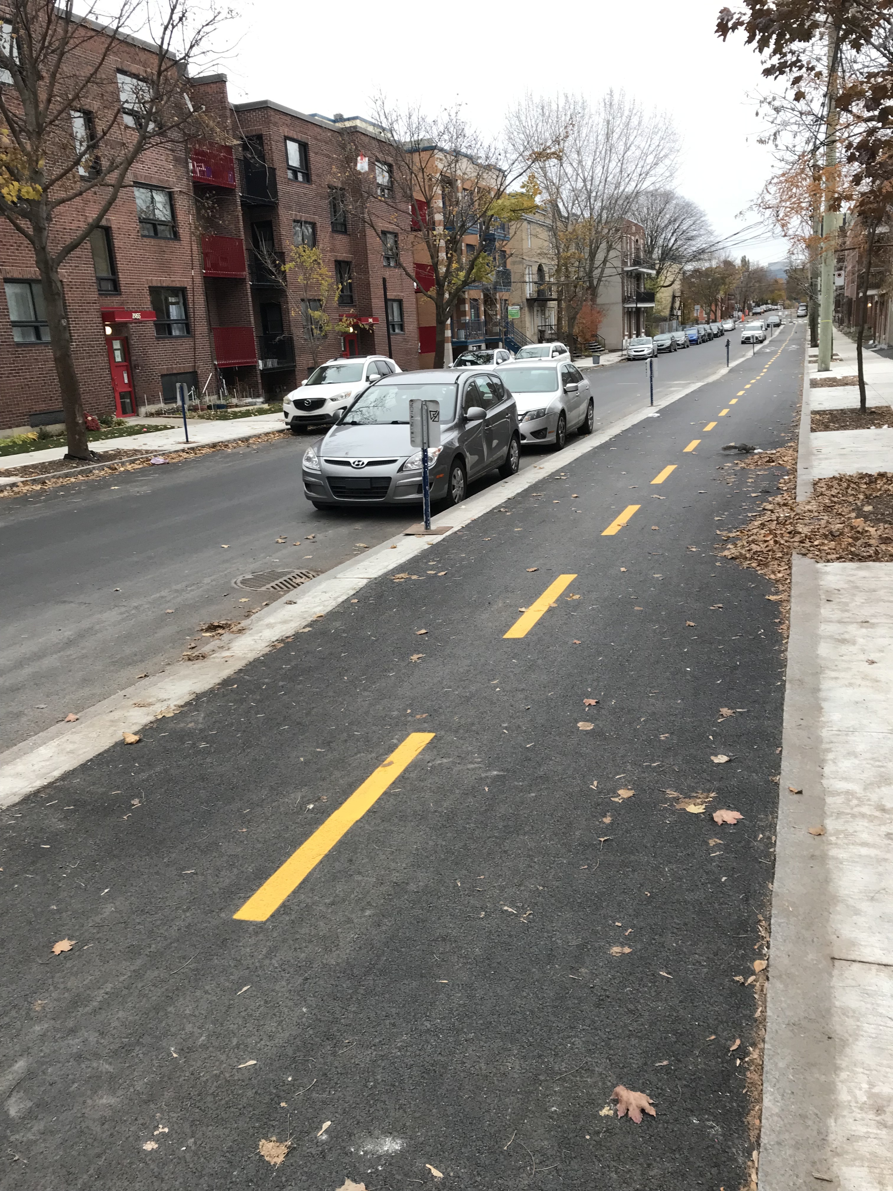 Pour Legendre je ne sais pas quel aménagement permanent serait idéal. Le secteur est très enclavé et il y a le centre de transport et les activités industrielles, donc pas simple au niveau de la circulation. Une bidirectionnelle sur Legendre, ça viendrait fort probablement avec un sens unique pour les véhicules. Il y a aussi les vélo-rues avec piste contresens que Villeray semblent apprécier; le stationnement pourrait être conservé et même amener les gens à respecter le 30km autour de l’école et des parcs.
