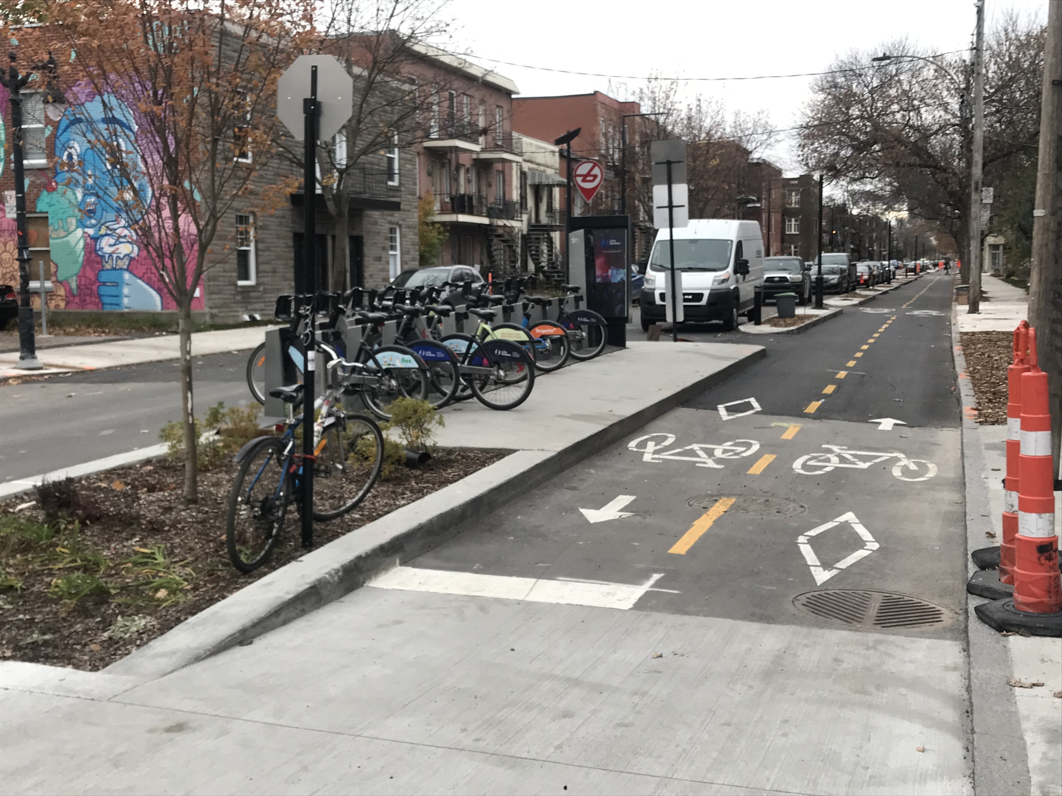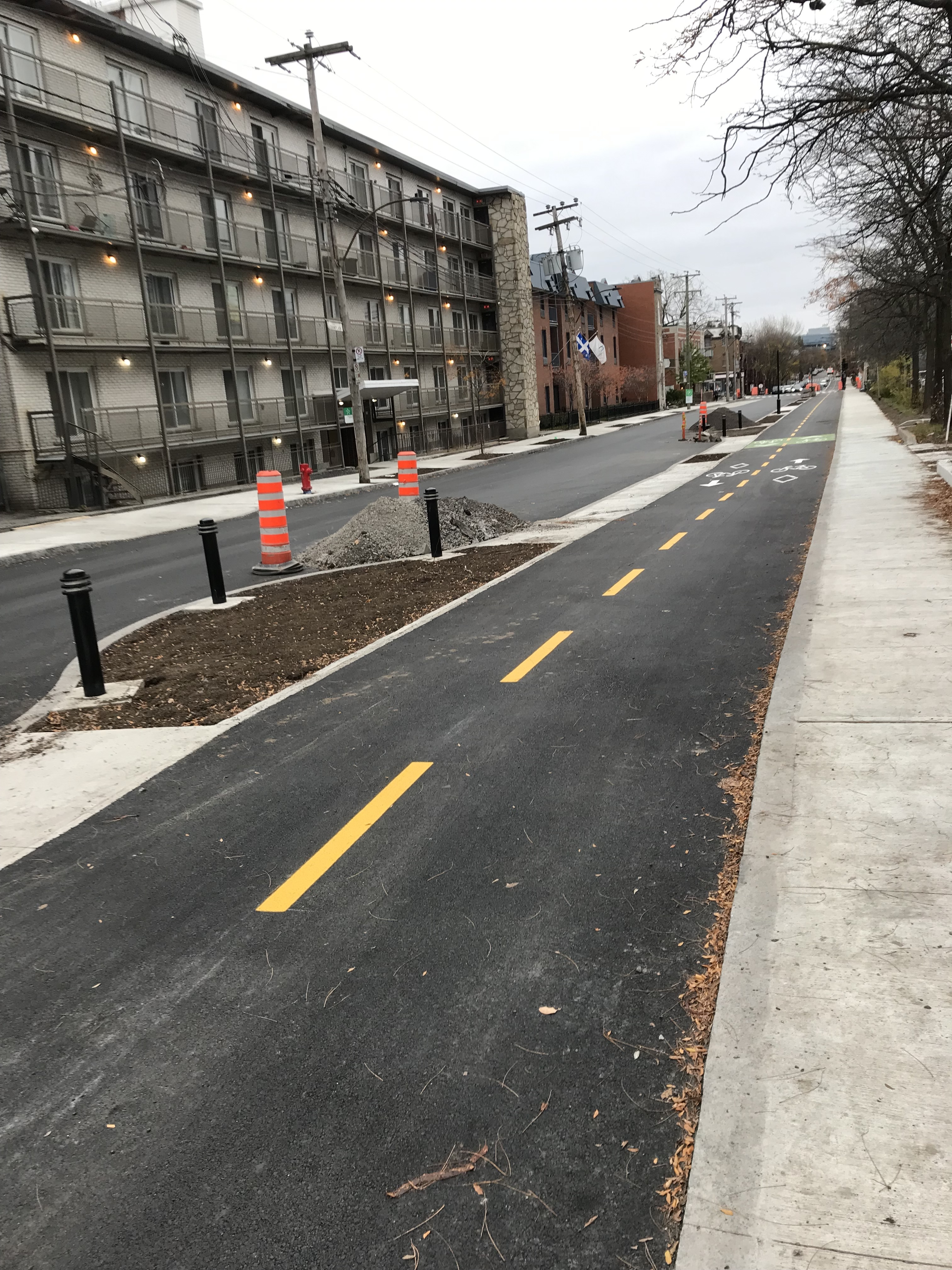 Manque les luminaires et les arbres/plantes. Remarquez qu’au Sud de Ontario la ville a privilégié le stationnement côté Ouest à du verdissement. Pourtant la moitié des cases ne sont pas utilisées côté Est et anyway, il y avait ZÉRO stationnements pendant 2 ans…