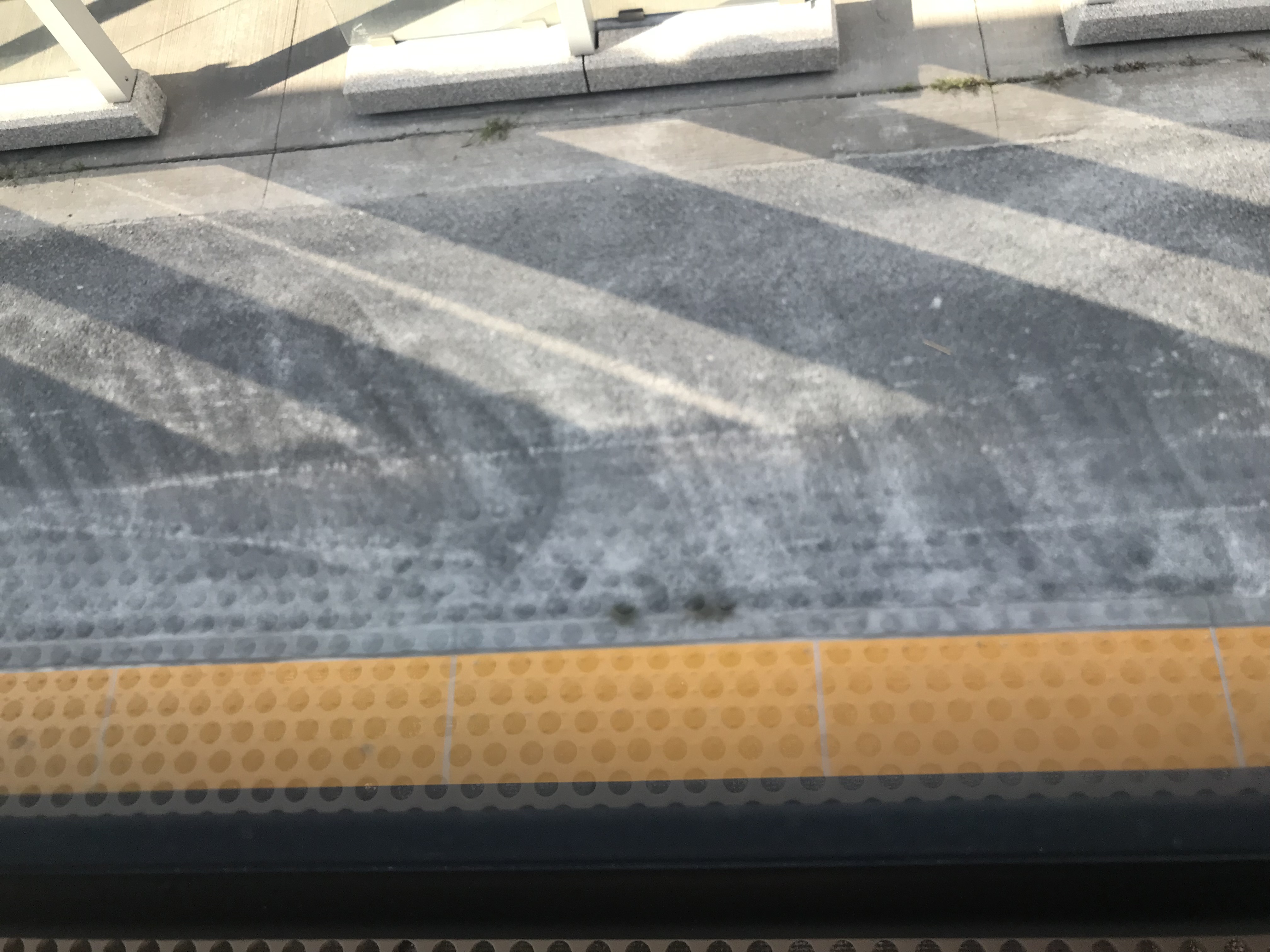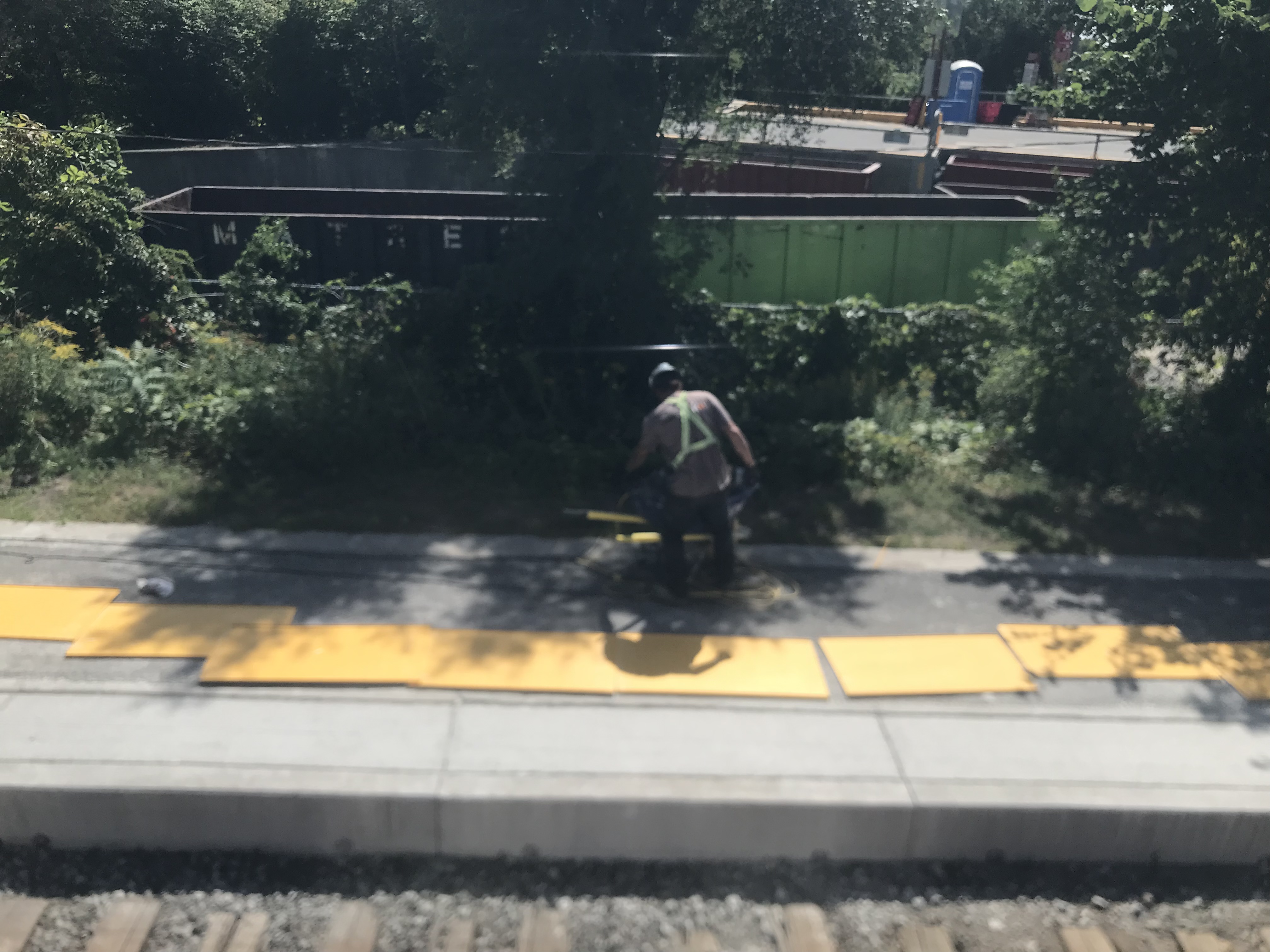 Des travailleurs installent de nouvelles tuiles tactiles à Bois-de-Boulogne. Excusez les photos de très piètre qualité…