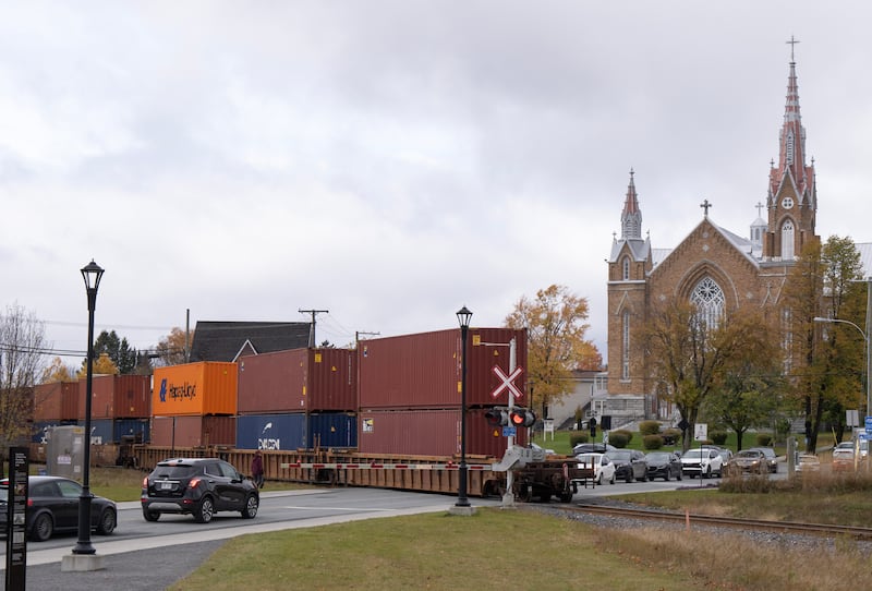 Un train traverse le centre-ville de Lac-Mégantic, au Québec, le mercredi 16 octobre 2024. (Ryan Remiorz/Archives La Presse Canadienne)