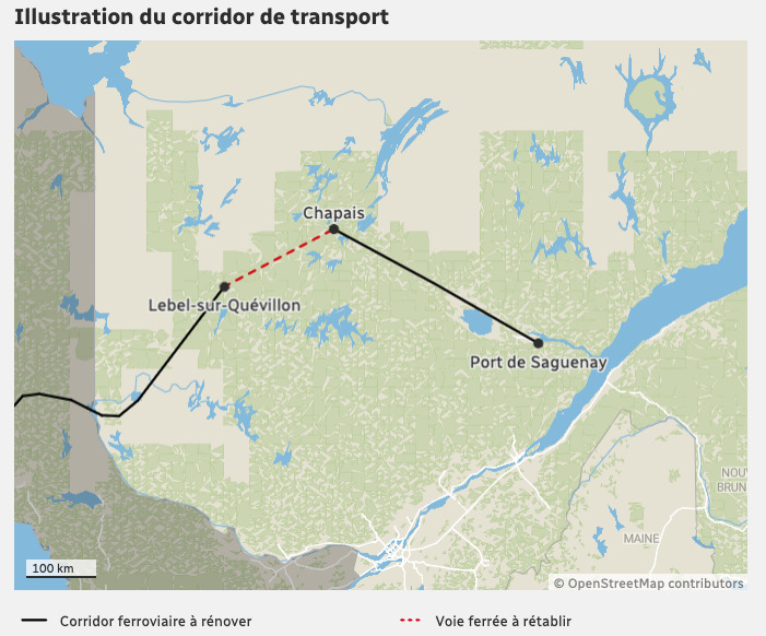 L’idée est d’utiliser le réseau ferroviaire existant en le mettant à niveau et d’en développer une partie manquante de 160 kilomètres pour acheminer les minéraux stratégiques du nord de l’Ontario et du nord du Québec vers le port en eau profonde de Saguenay.