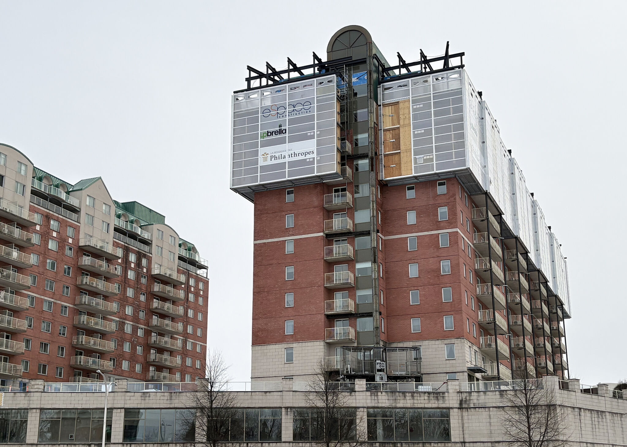 Nous présentons usuellement des photos des projets réalisés ou en fin de chantier; à ce projet, nous suivrons tout le déroulement pour les réfections des façades de ces 2 tours de 12 étages. Ci-jointes : la première photo à notre visite sur le site et la deuxième image de la perspective des deux tours sur les plans de RÉGIS Architecture.