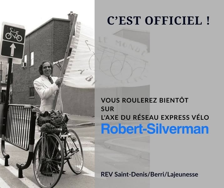 La mairesse de Montréal, Valérie Plante, et la conseillère associée à la mobilité et au Plan vélo, Marianne Giguère, sont fières d’annoncer leur volonté de nommer l’axe Berri-Lajeunesse-Saint-Denis du Réseau express vélo (REV) « piste Robert-Silverman ». Cette nouvelle dénomination d’une infrastructure emblématique du réseau cyclable de la métropole vise à reconnaître la contribution de Robert Silverman à l’évolution des politiques de mobilité durable à Montréal.