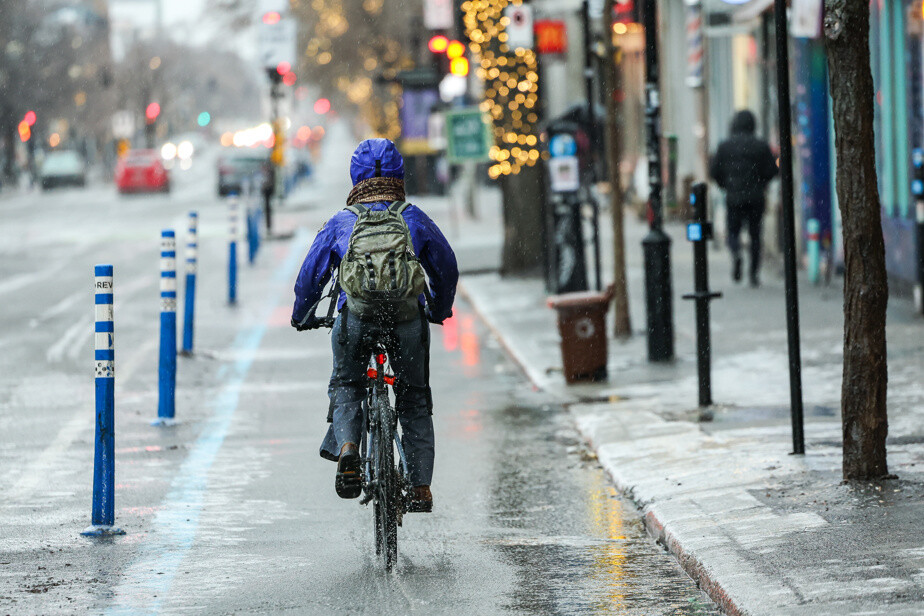 Observation rigoureusement scientifique dans la neige, ce matin. La plupart des cyclistes en direction sud sur le REV 1 tournent à droite sur des Pins, plutôt que de continuer tout droit (et potentiellement vers le viaduc Berri).