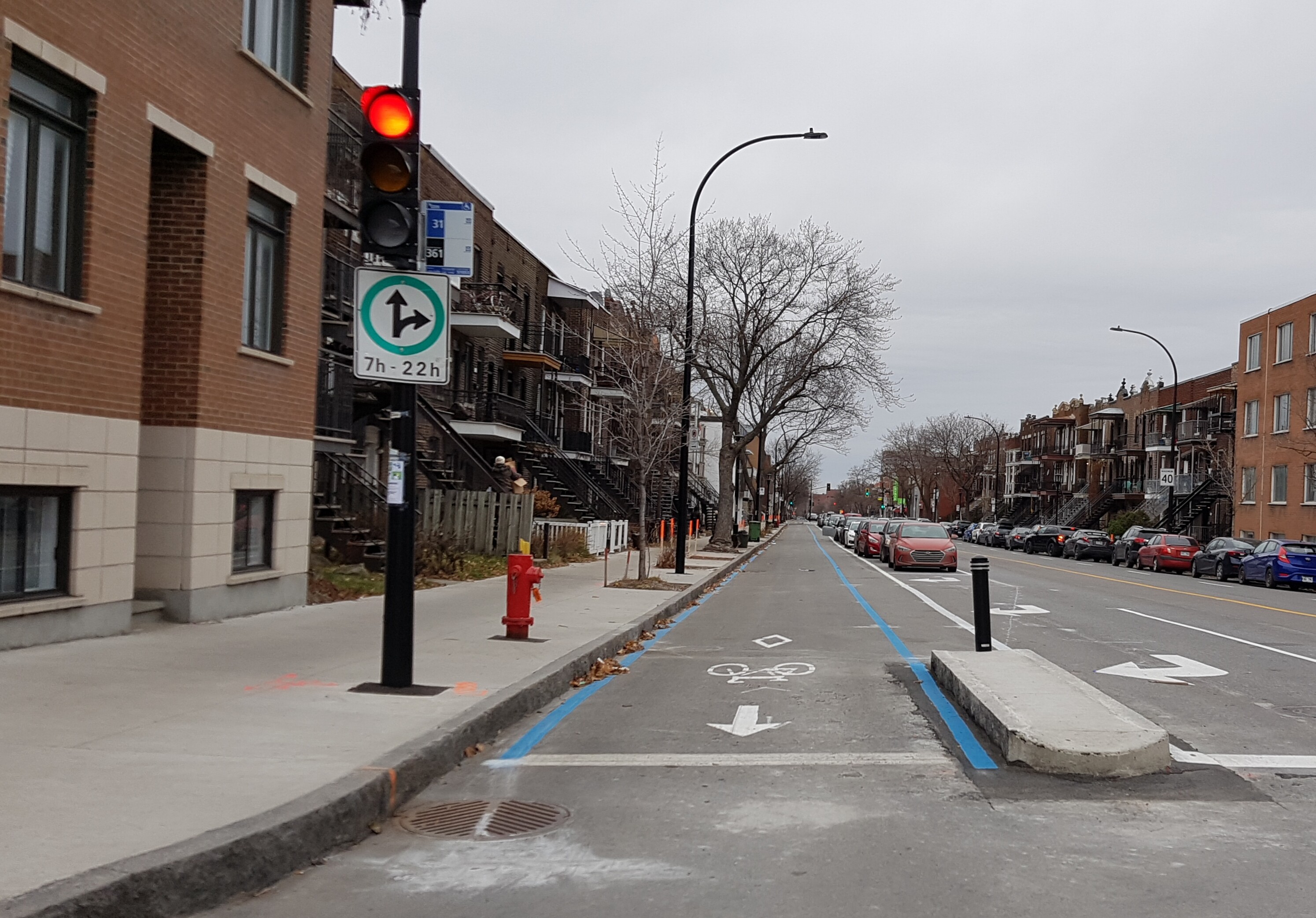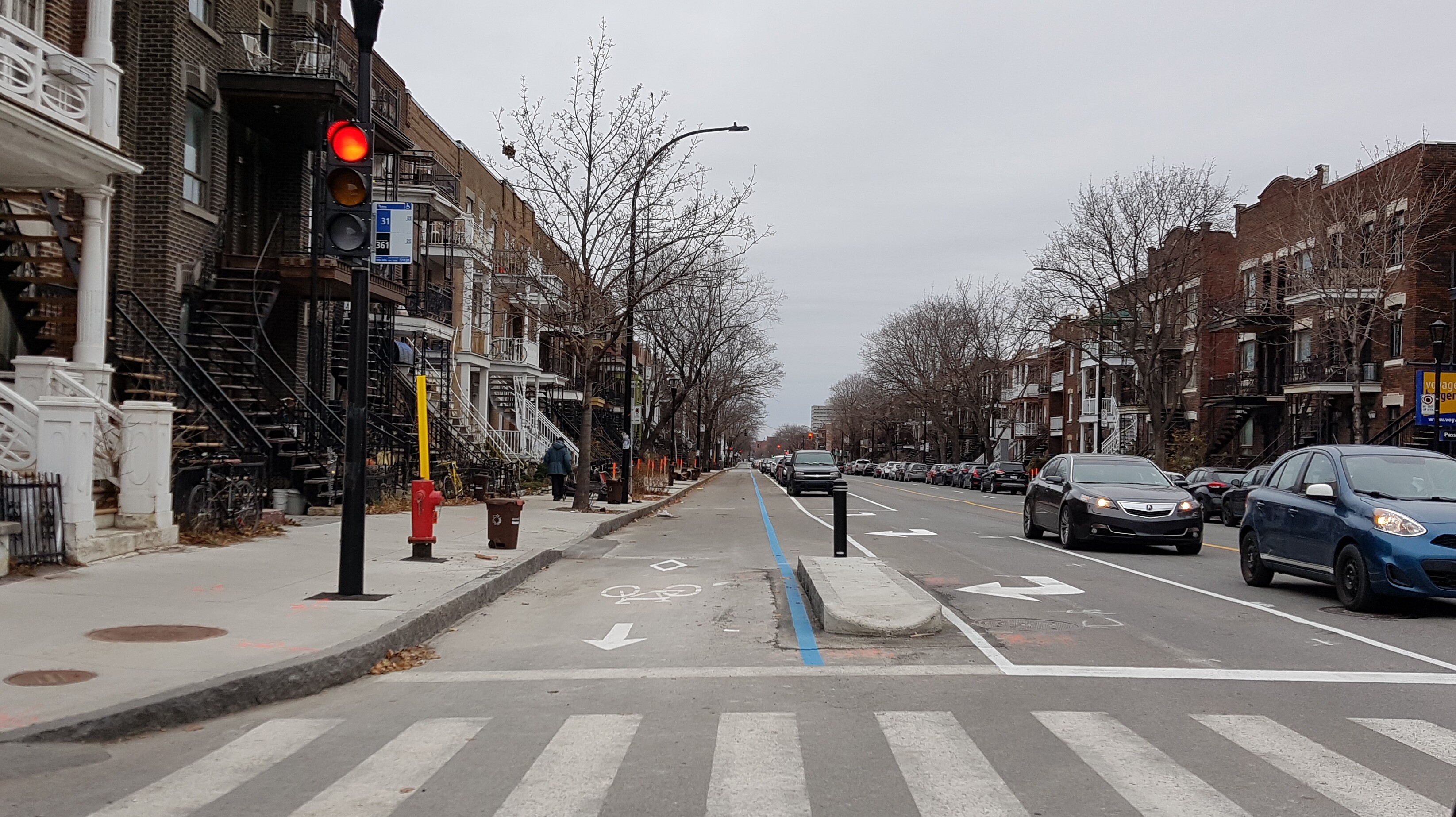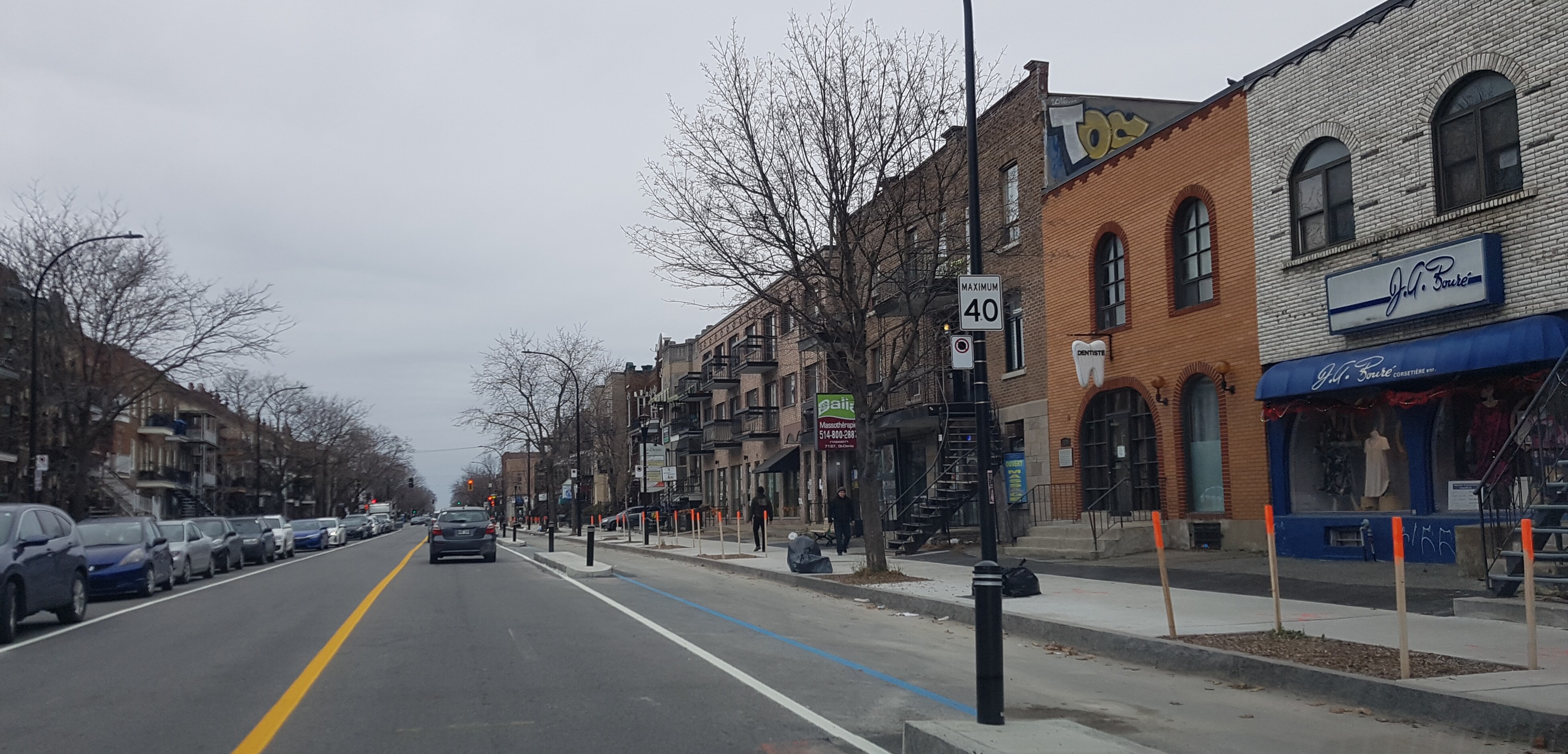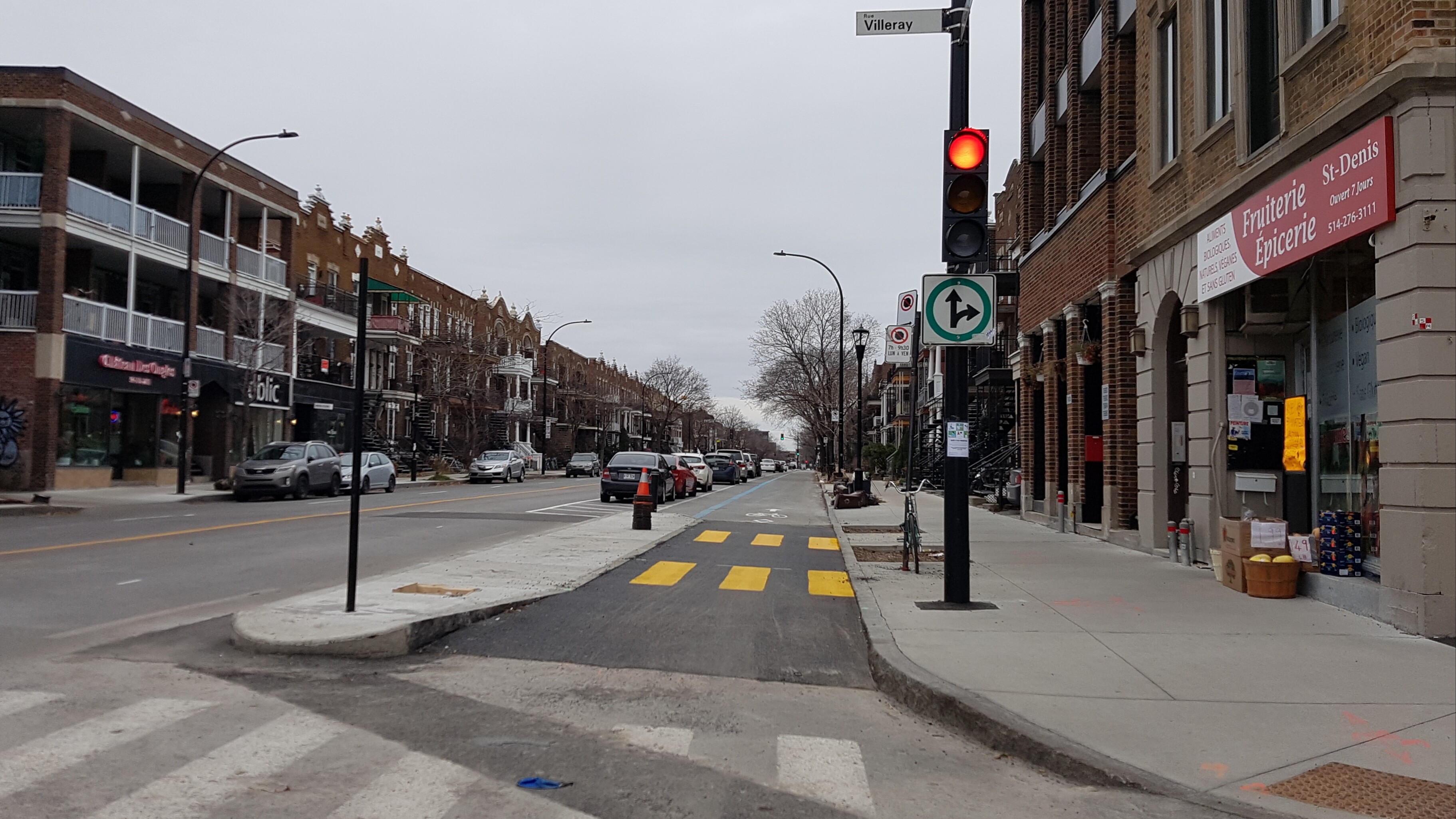 J’ai l’impression que le marquage a été fait au hasard, c’est vraiment pas bon comme effort. J’imagine qu’il sera refait au printemps. Je ne serais pas surpris non plus si on met des bacs à fleurs dans les zones triangulaires pour éviter le stationnement illégal.