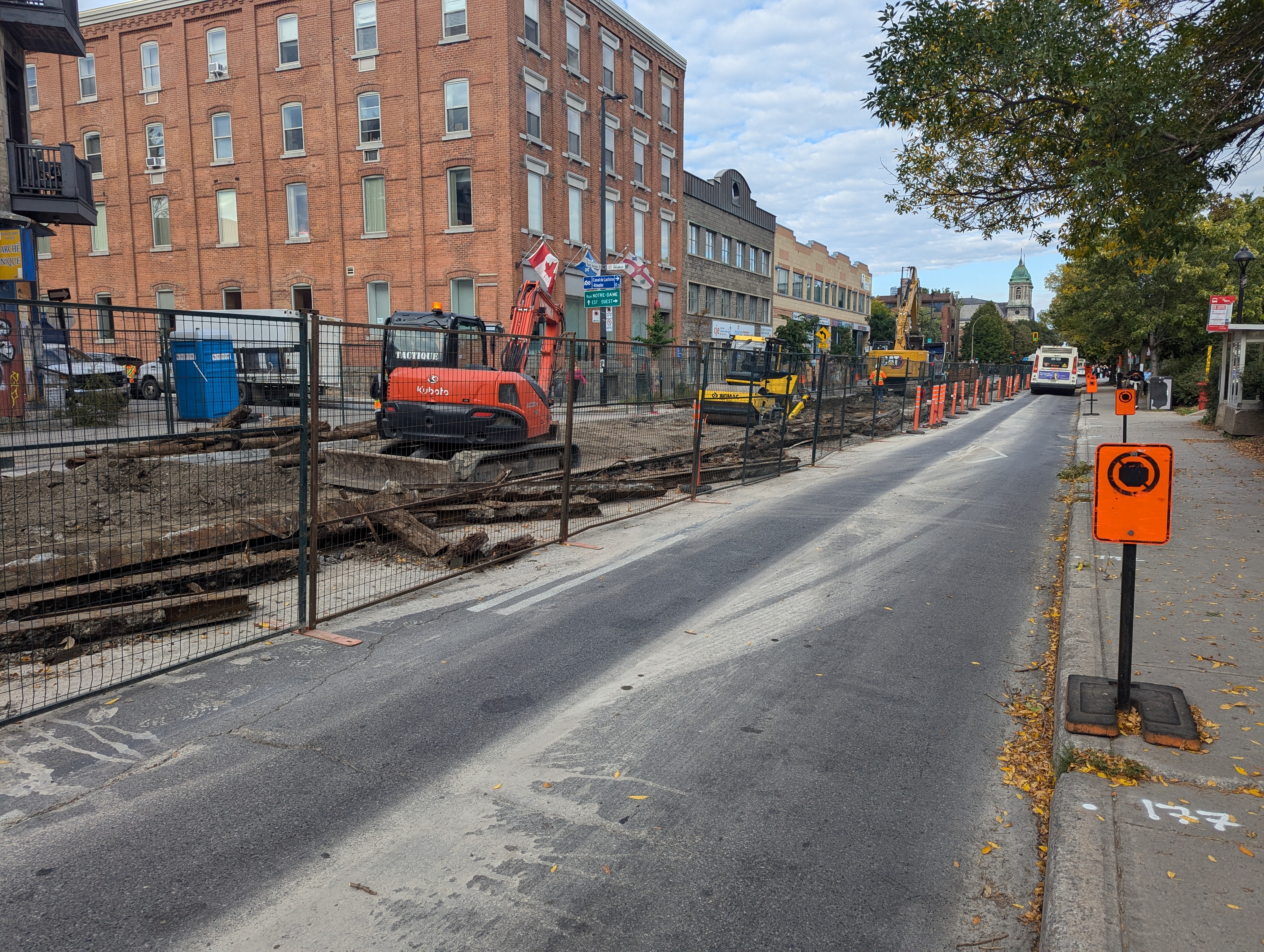Ce ne sont pas des travaux de repavage sur la rue Saint-Jacques entre Greene et Atwater, mais des travaux pour enlever les rails! Il y a un tas de bois et de métal au coin de Greene