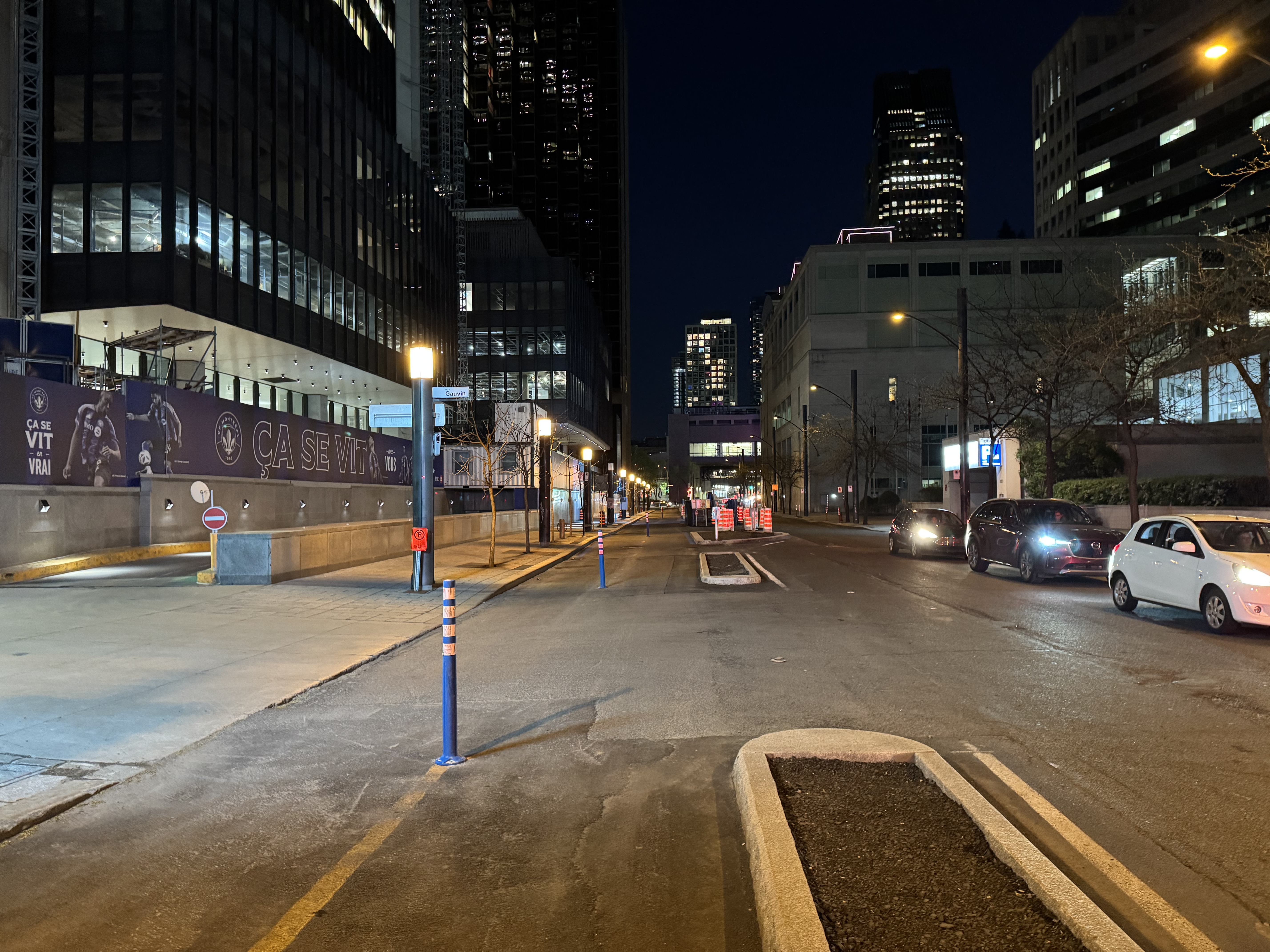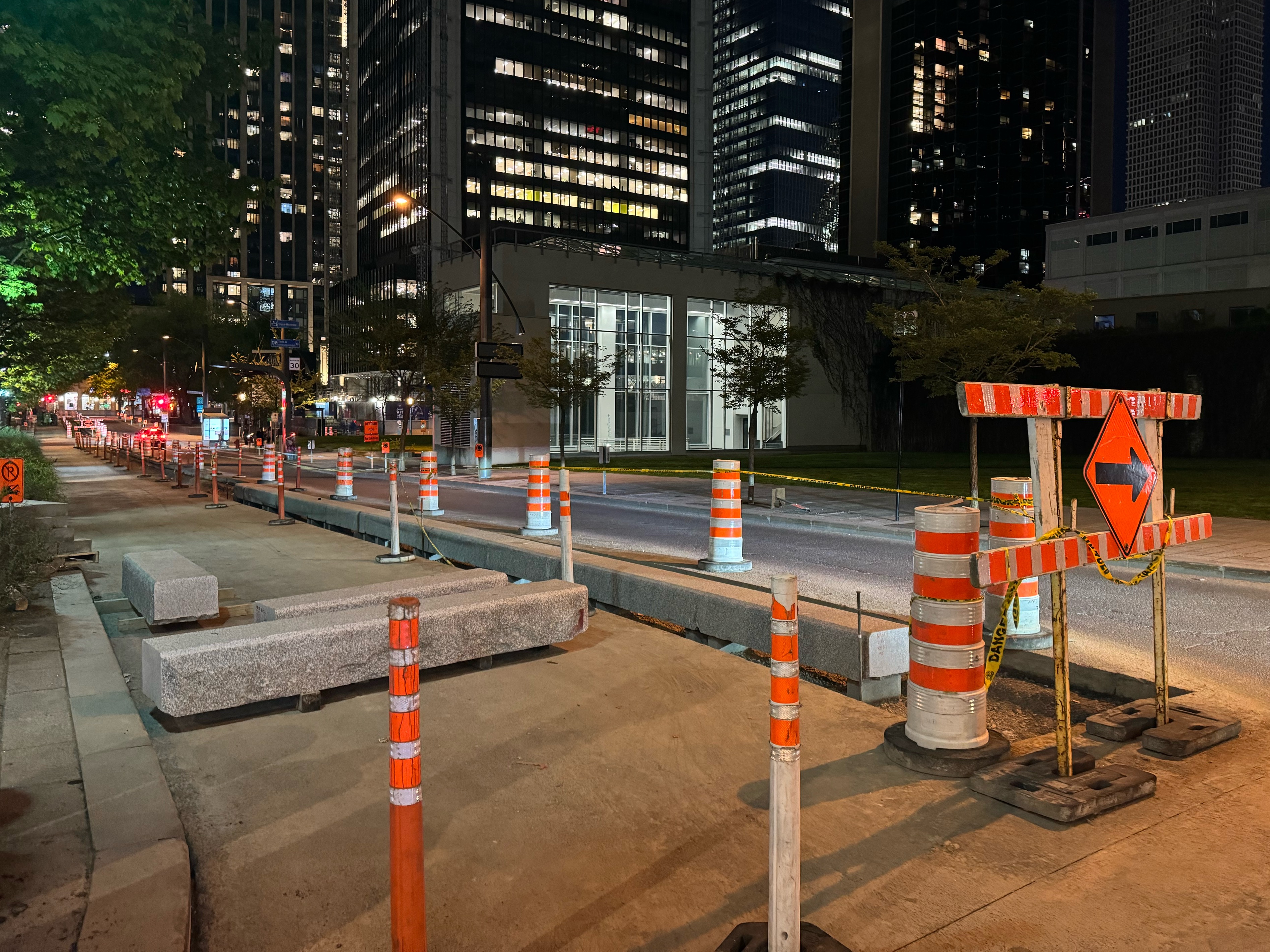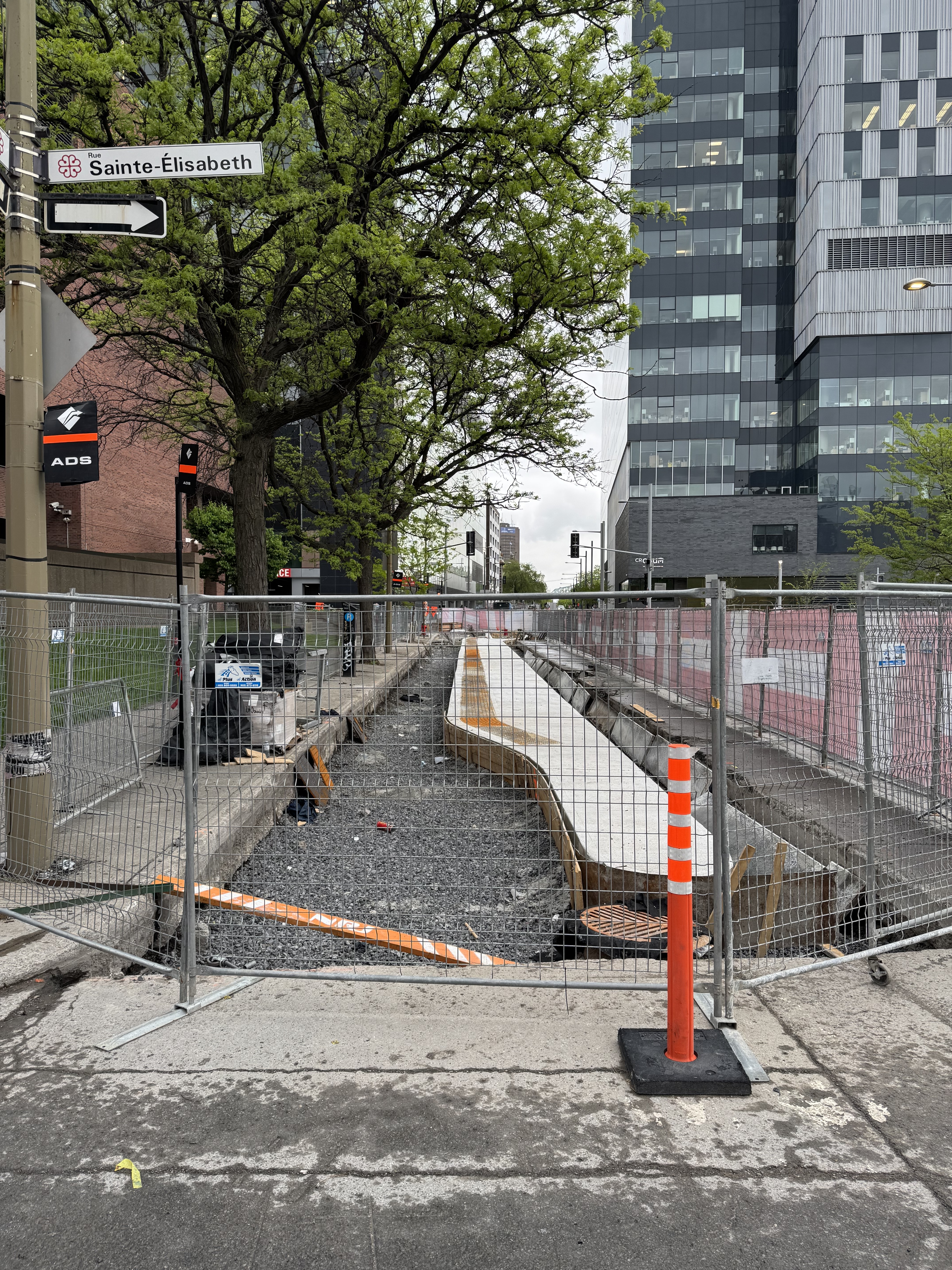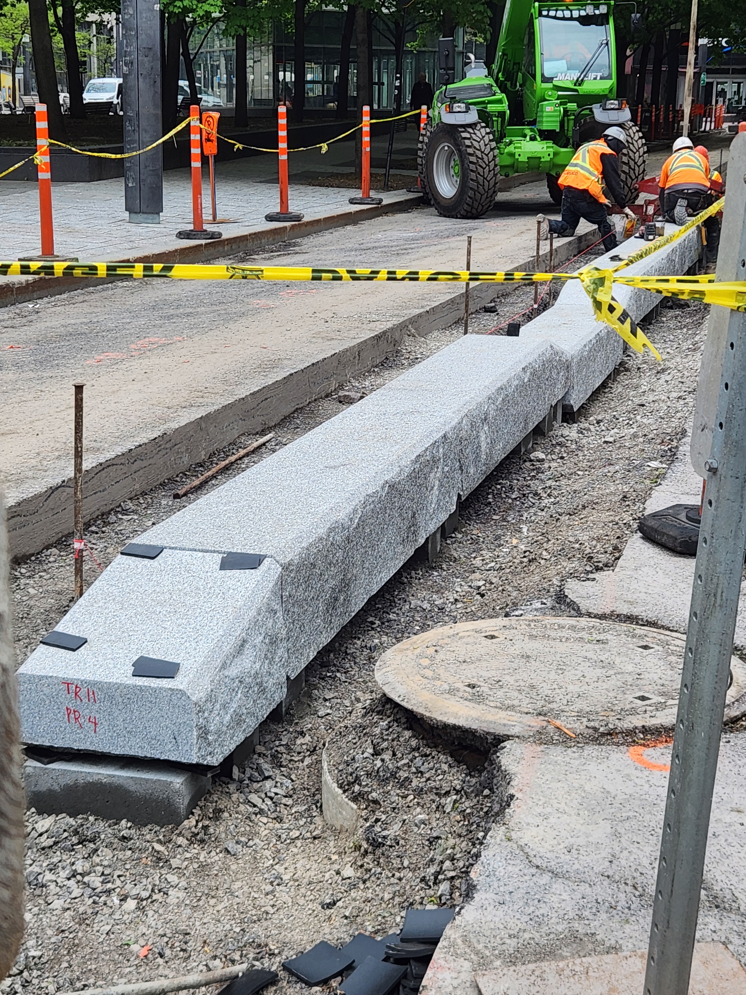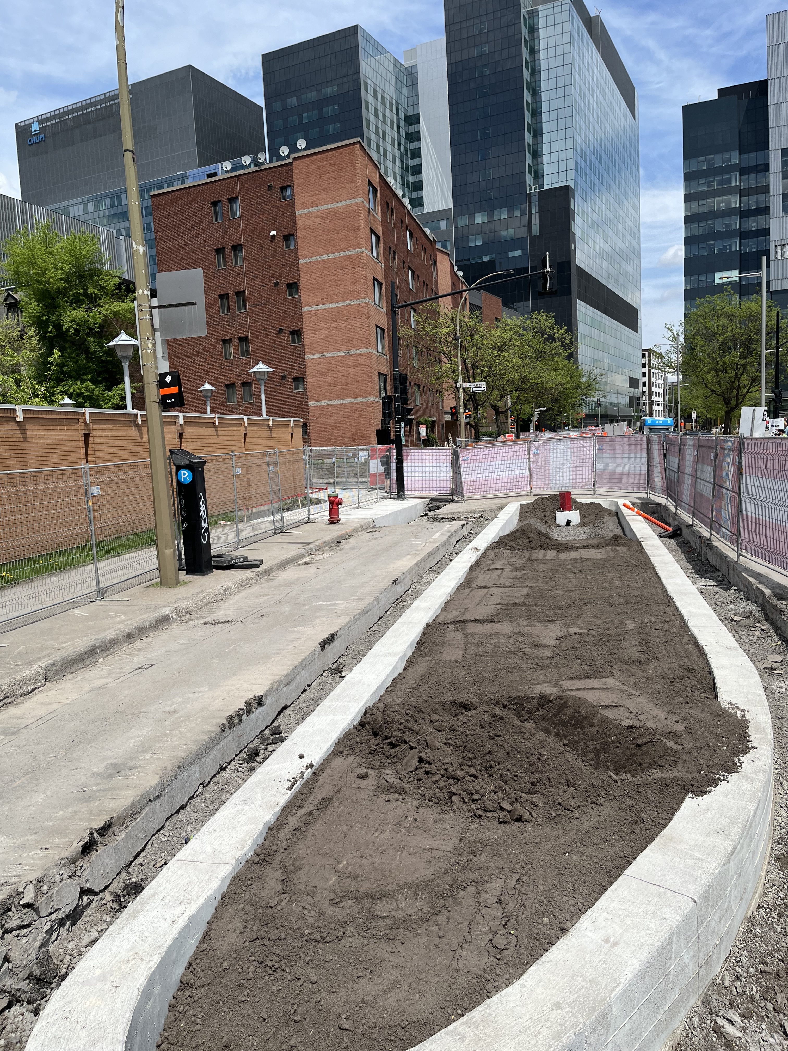 Le granit s’installe et des poteaux bleus ont été mis au centre de la piste sur toute sa longueur entre McGill et Robert-Bourassa.