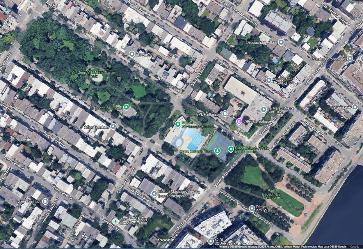 Sinon, la rue Saint-Ambroise coupe deux espaces verts. Il y a un bassin de rétention sous le parc Gédéon-de-Catalogne