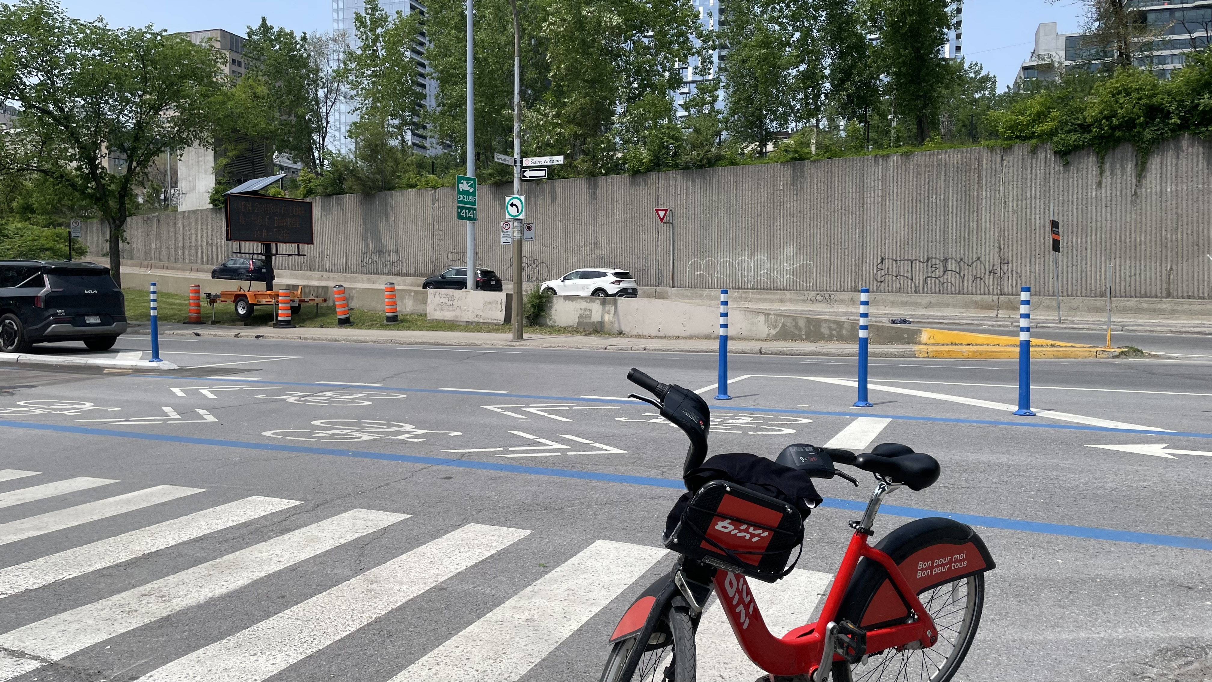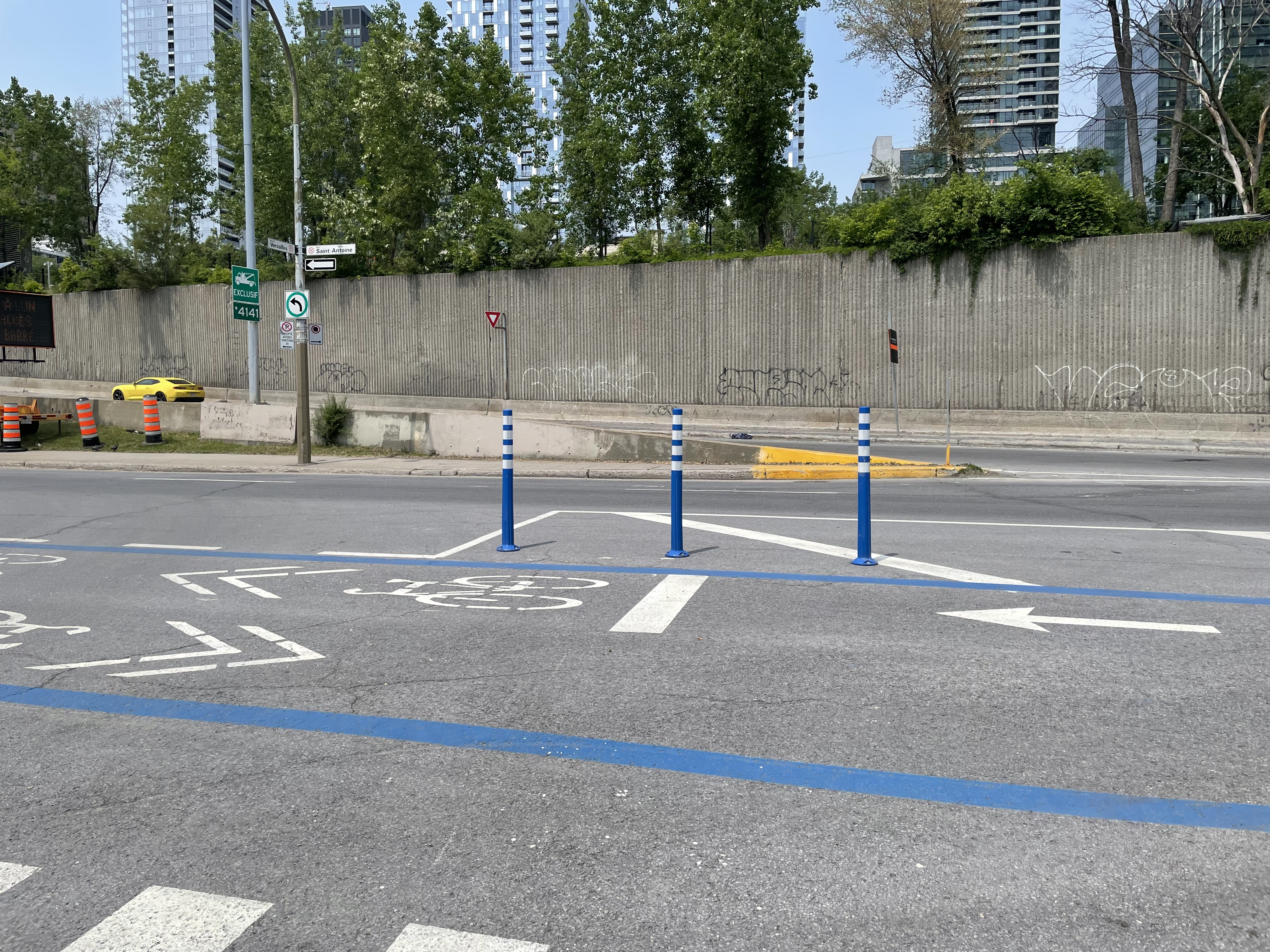 L’intersection Versailles/Saint-Antoine avec des bollards qui vont jusqu’au milieu de l’intersection