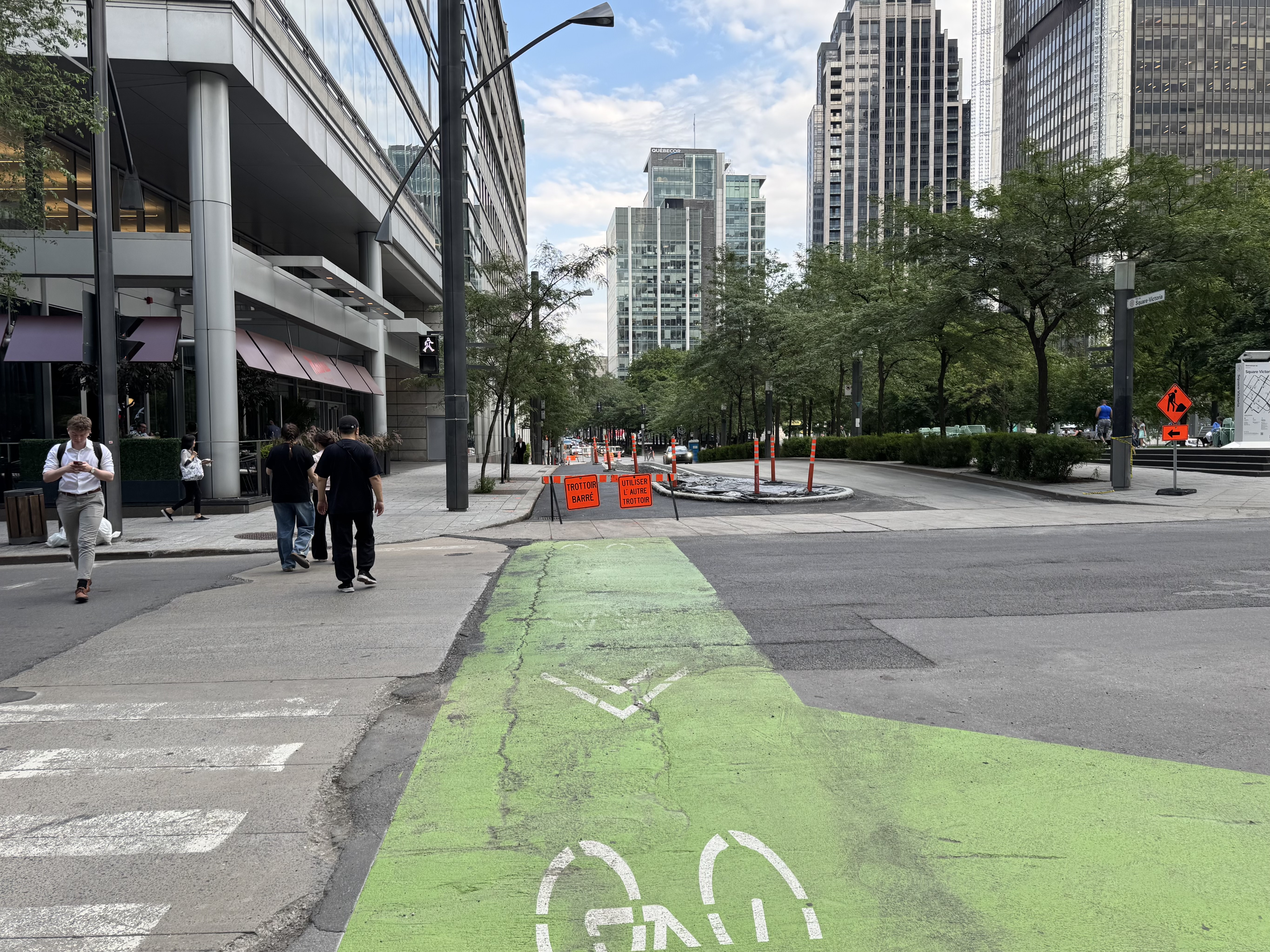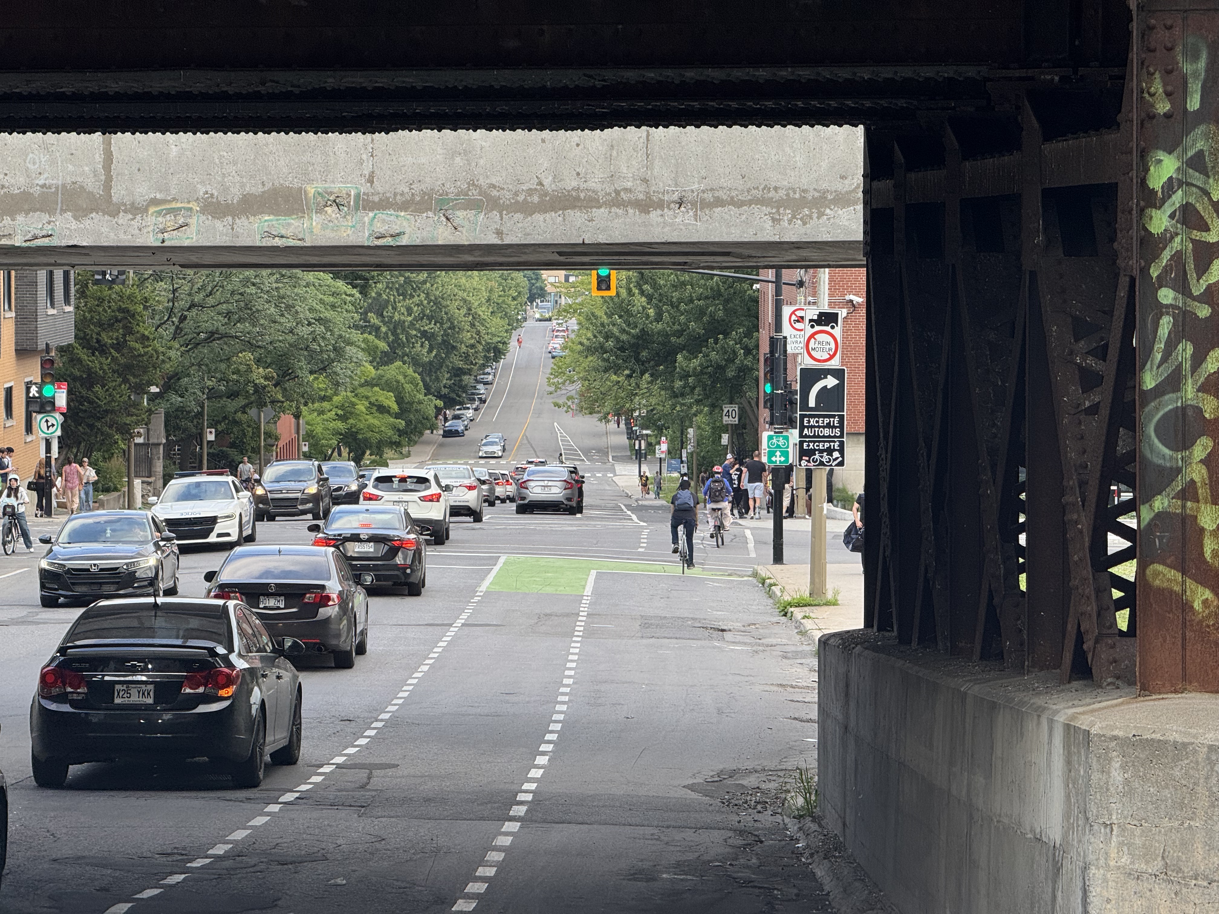 Je crois que c’est une partie du trafic cycliste de la piste du Canal. Plusieurs personnes tournent vers le Sud à Peel