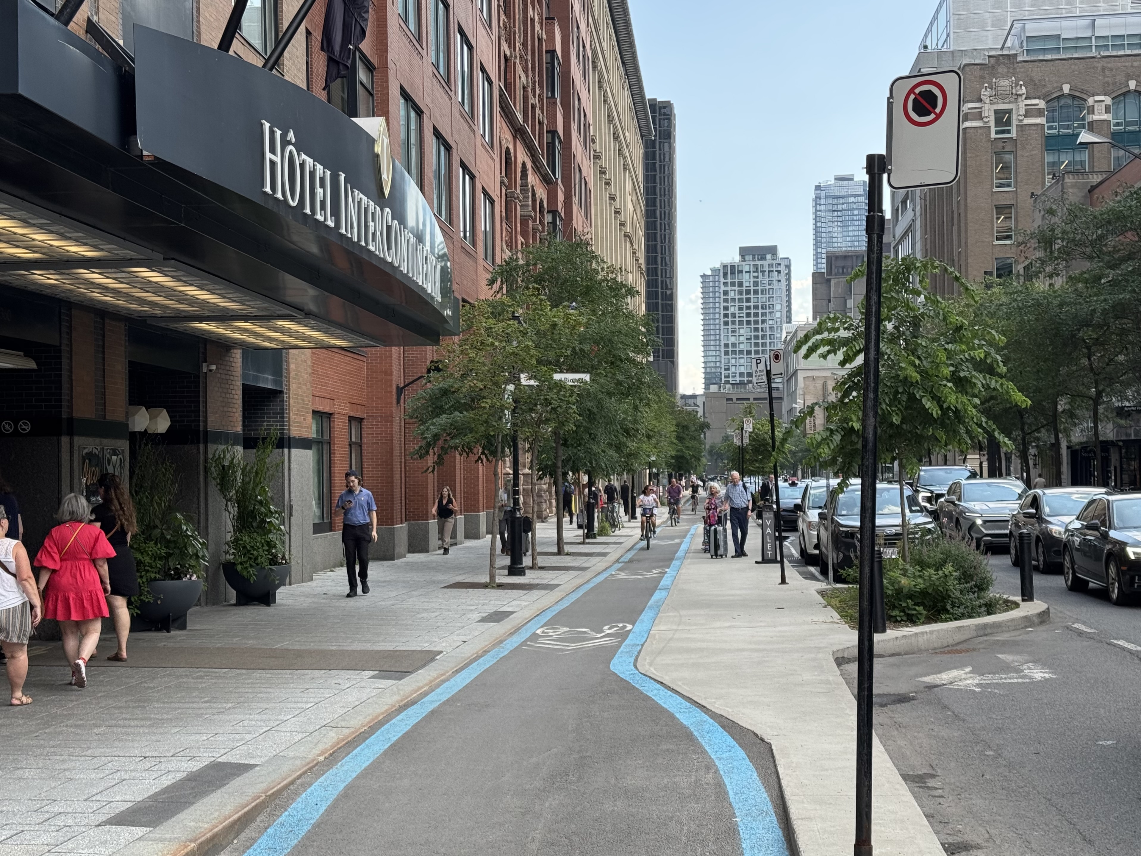 Comme l’îlot a une bonne largeur, les clients de l’hôtel peuvent organiser leurs valises là-dessus et éviter de le trottoir ou la voie cyclable. Ça leur permet aussi d’attendre un moment opportun pour traverser sans devoir se faufiler entre les piétons.
