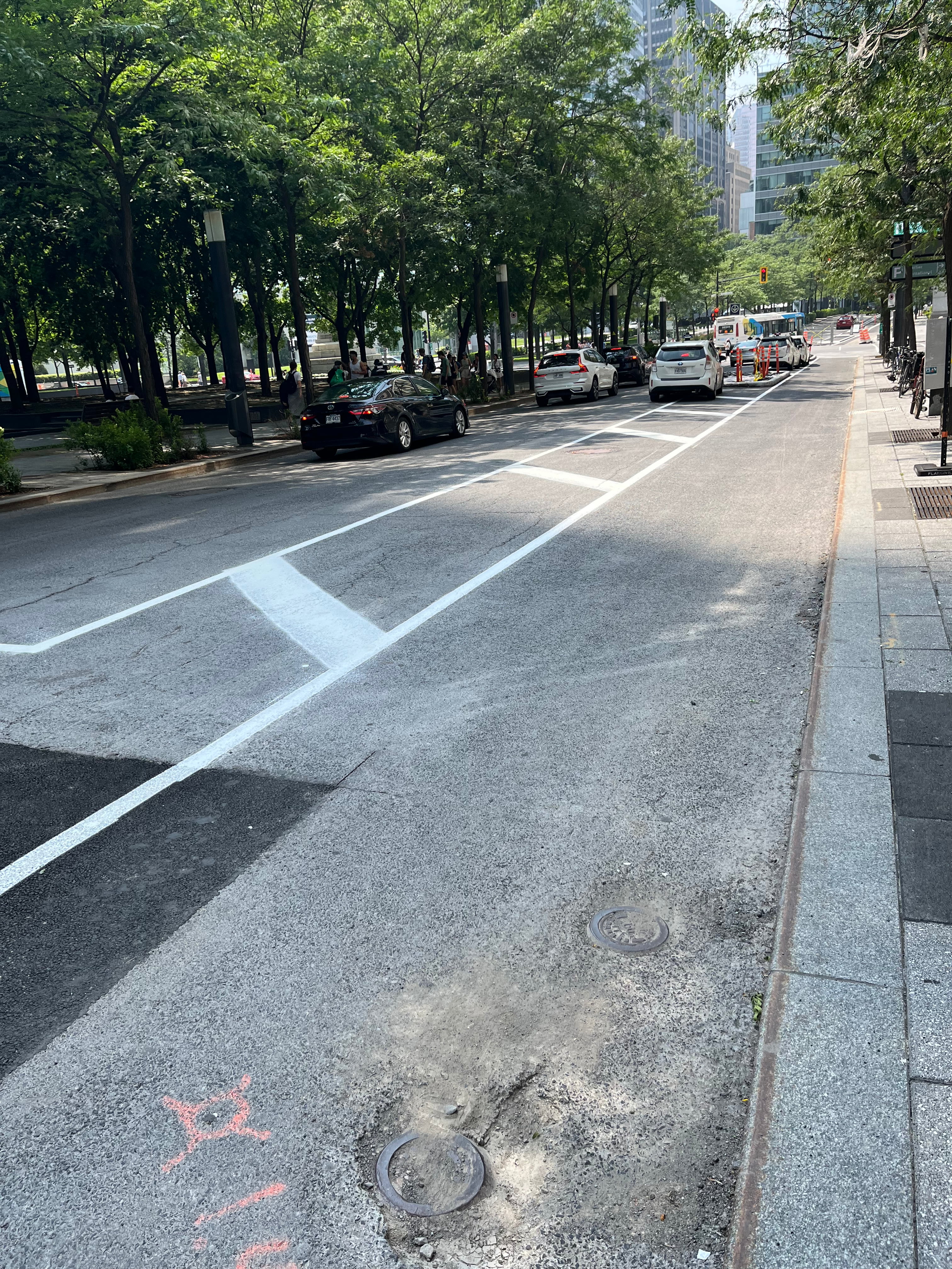 3- Sur Viger, vers l’ouest, passé le Square, des cycliste continuent tout droit jusqu’à Robert Bourassa. La ligne droite est plus facile que de descendre récupérer Saint-Antoine…