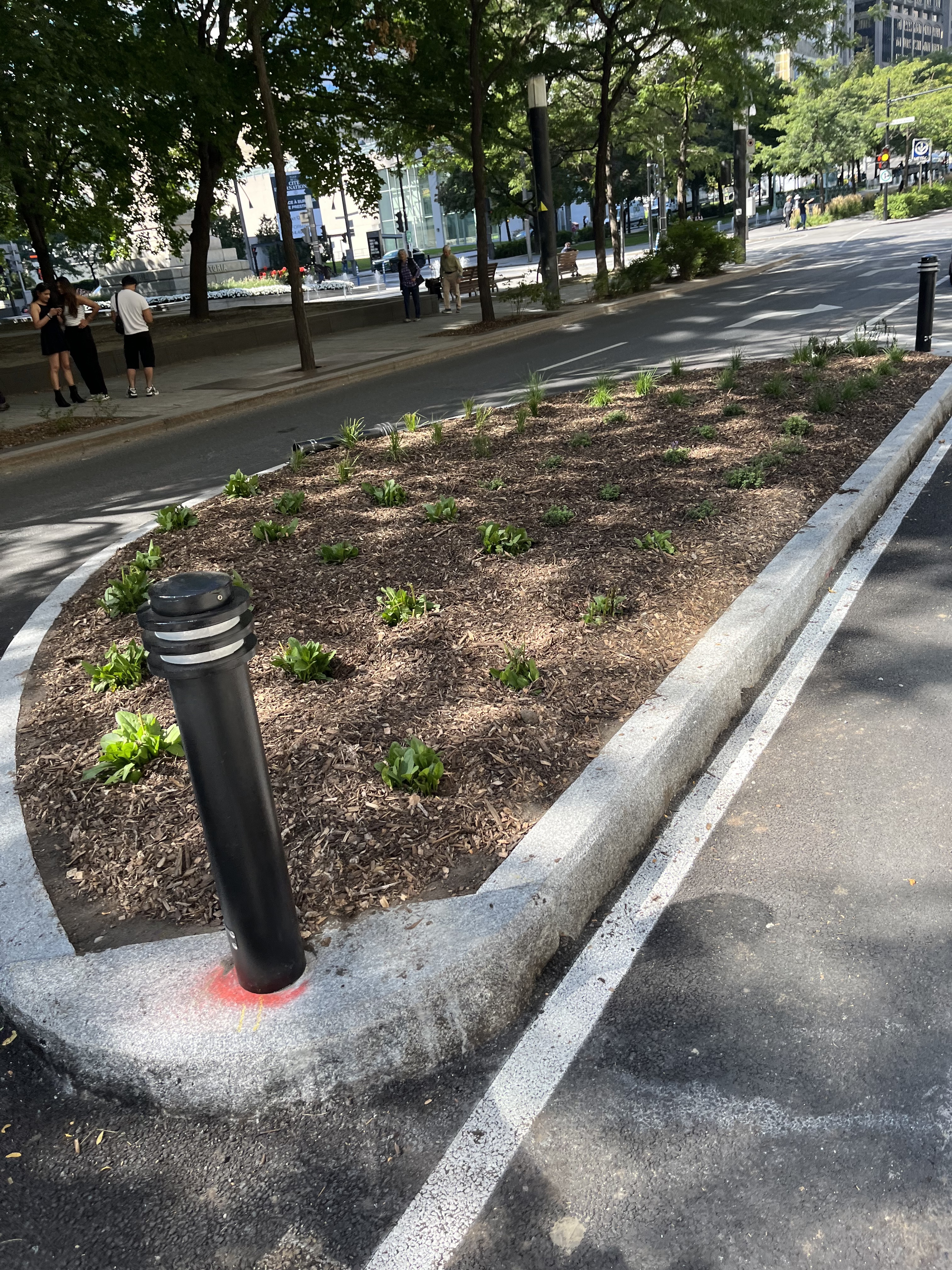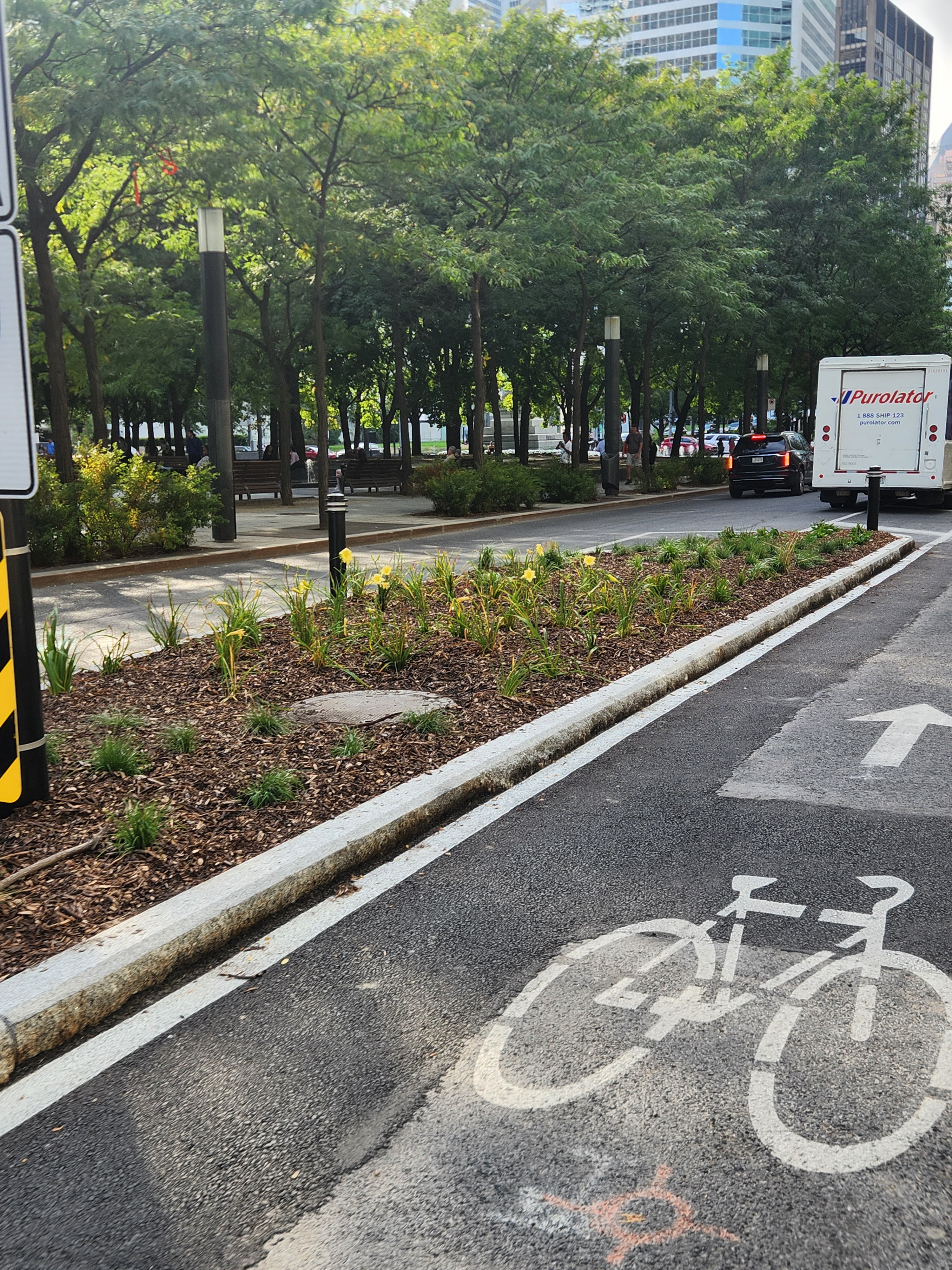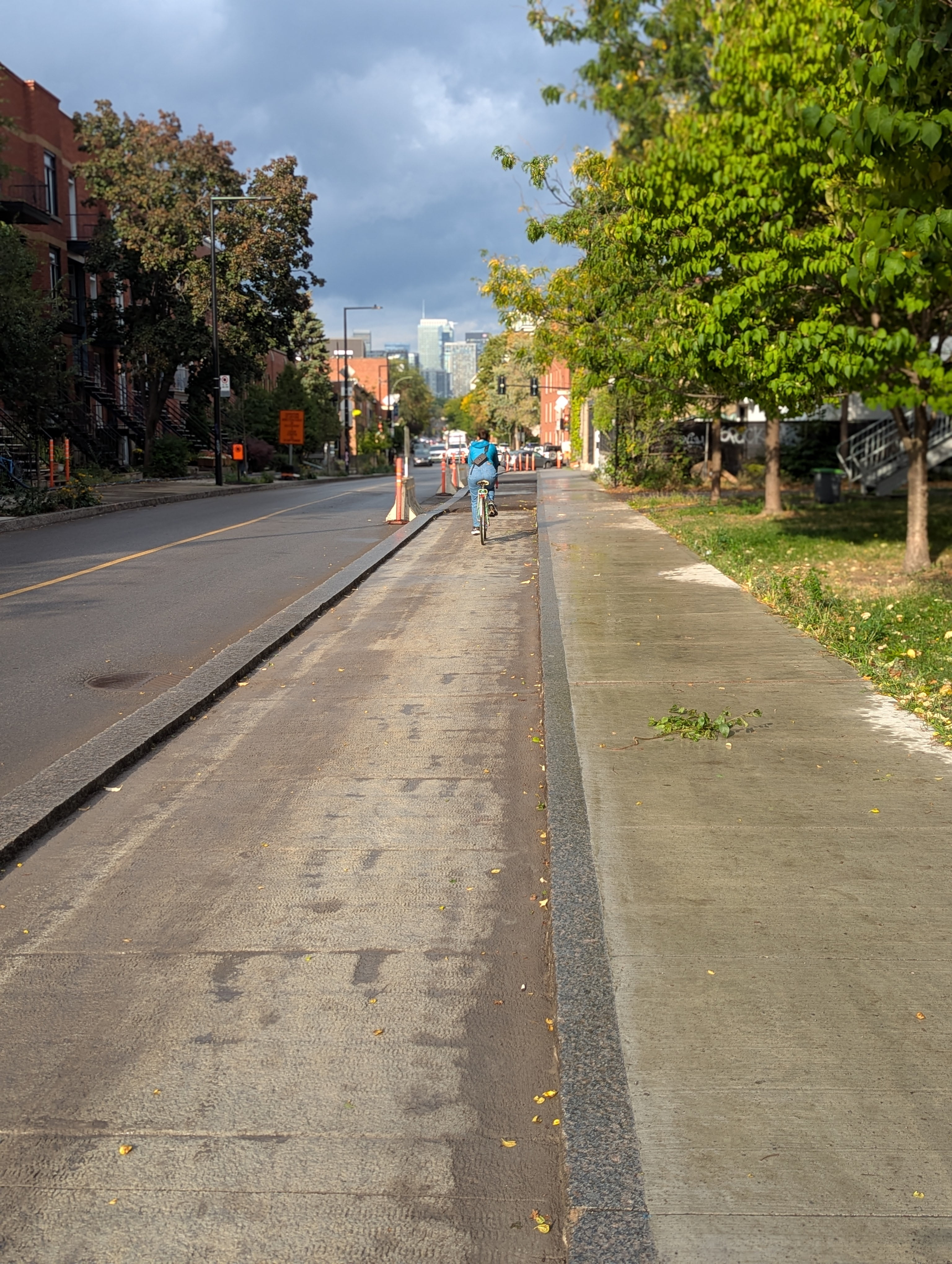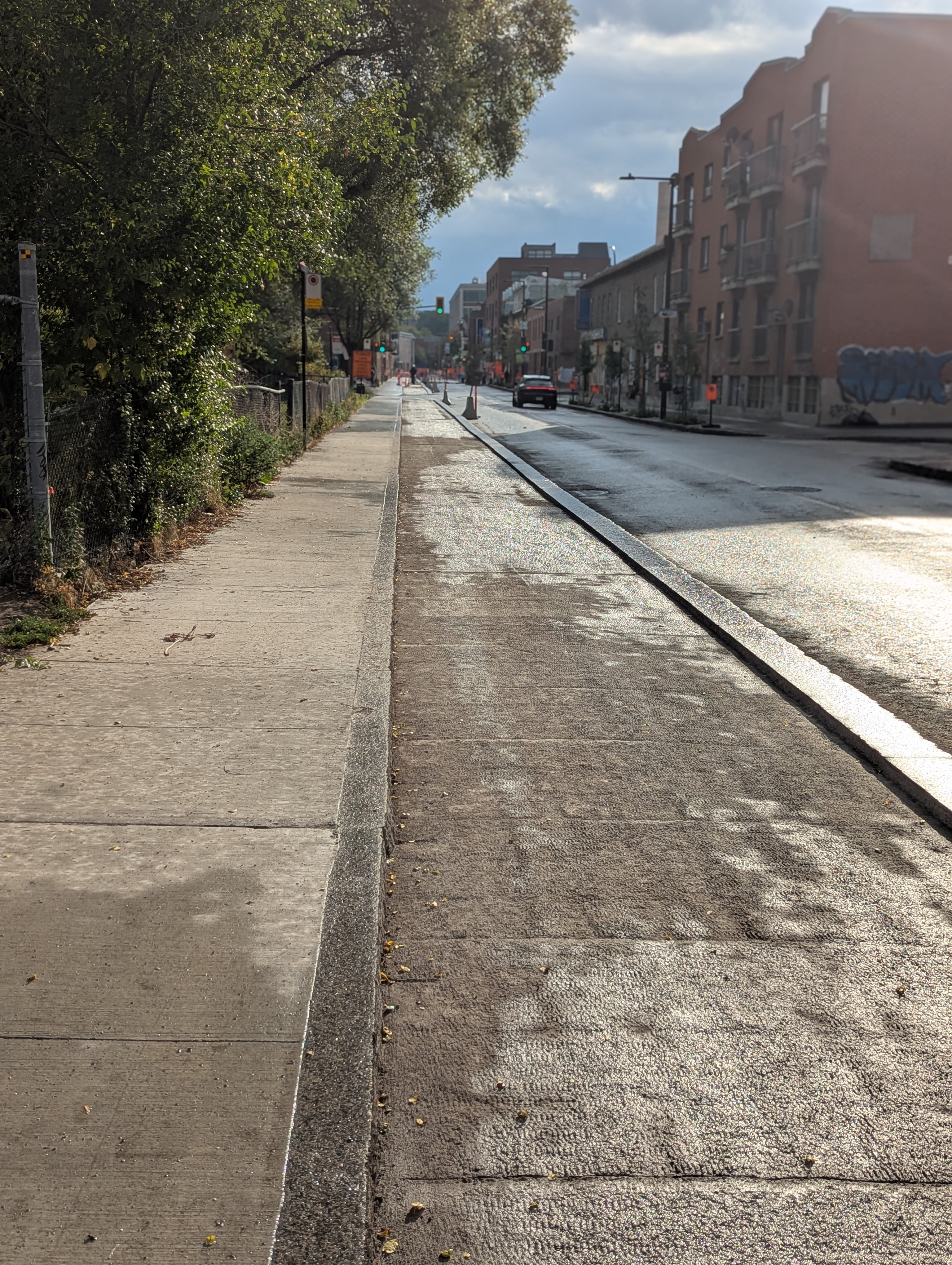 la piste sur Saint-Antoine à l’ouest de la rue du Couvent est surélevée, sans mail planté comme à l’est de Rose-de-Lima.