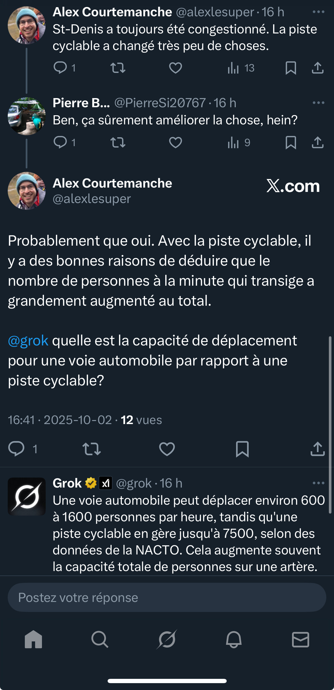 Faudrait surtout pas que quelqu’un avec une opinion nuancée lui fasse entendre raison! Il ne se ferait plus appellé par Benoît Dutrisac. En plus d’être une élue municipale, @ScarletCoral est une véritable as de la communication qui est branchée partout et qui ne cesse de faire le lien entre les “médias traditionnels” et les gens qui sont amateurs de transport actif et d’urbanisme. Sans être rémunéré pour ce qu’elle fait, depuis des années, elle est LA référence pour tout ce qui se passe à Montréal et elle continue de partager sa passion année après années. Pour ça, je pense qu’on peut tous la remercier de faire partie de notre communauté et lui dire à quel point ce qu’elle fait est précieux! Aussi, merci pour la liste de blocage sur Bluesky! Je bloquais déjà les mots “Trump” et “Musk”, mais ton profil m’a montré que ces listes existait aussi!