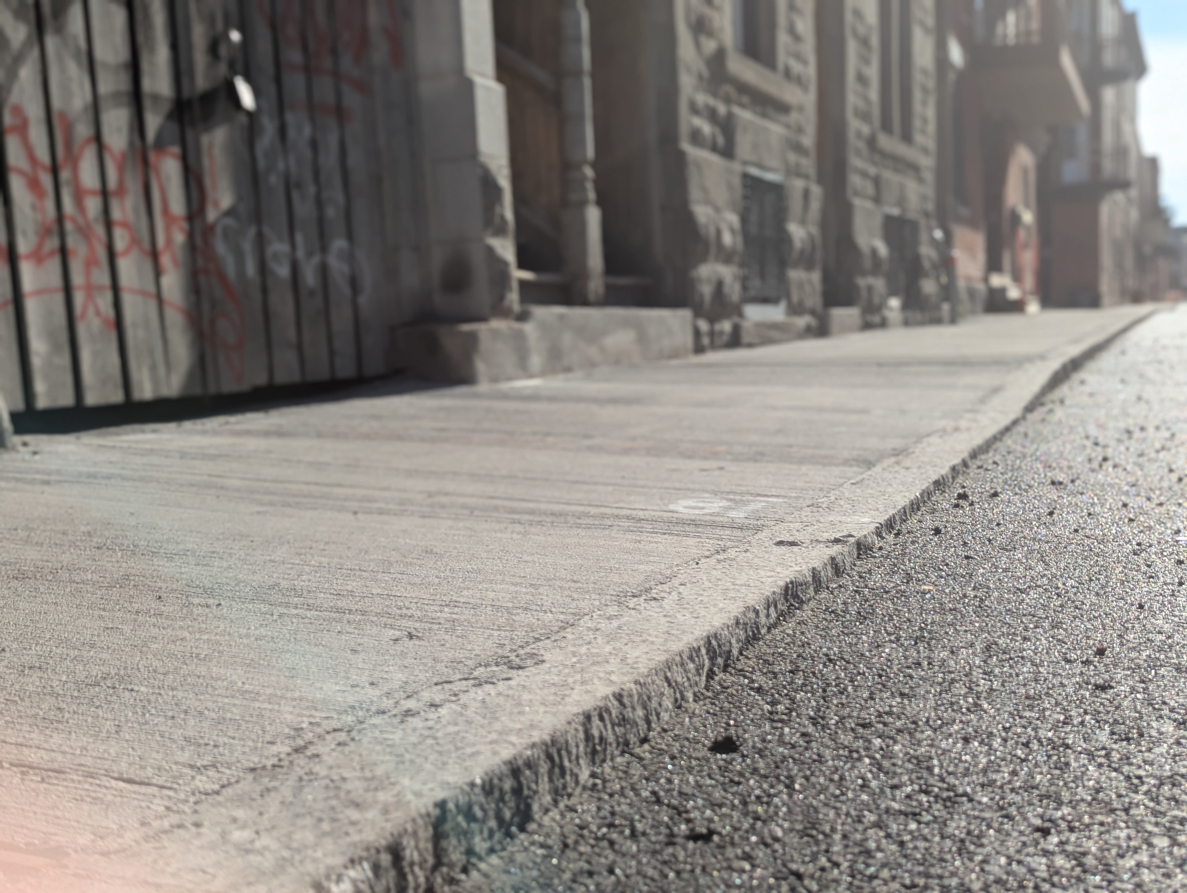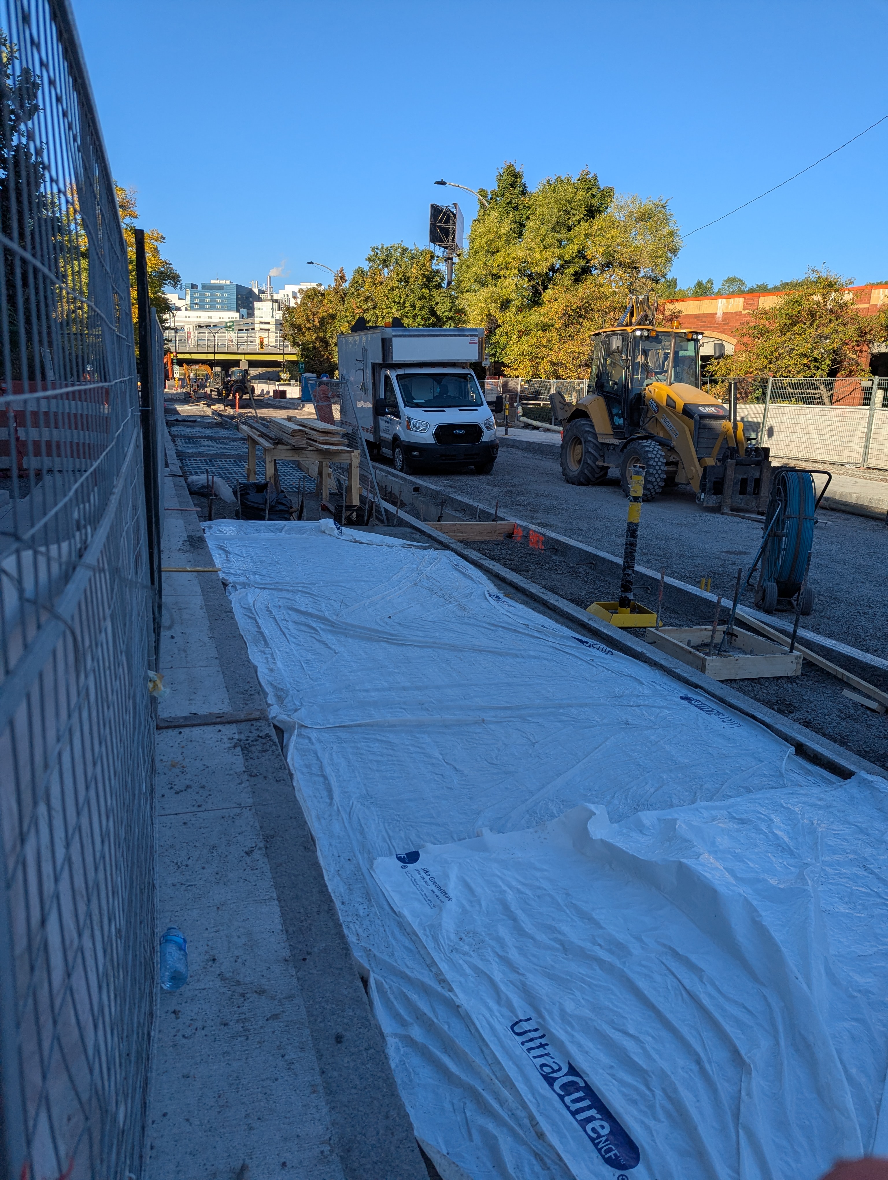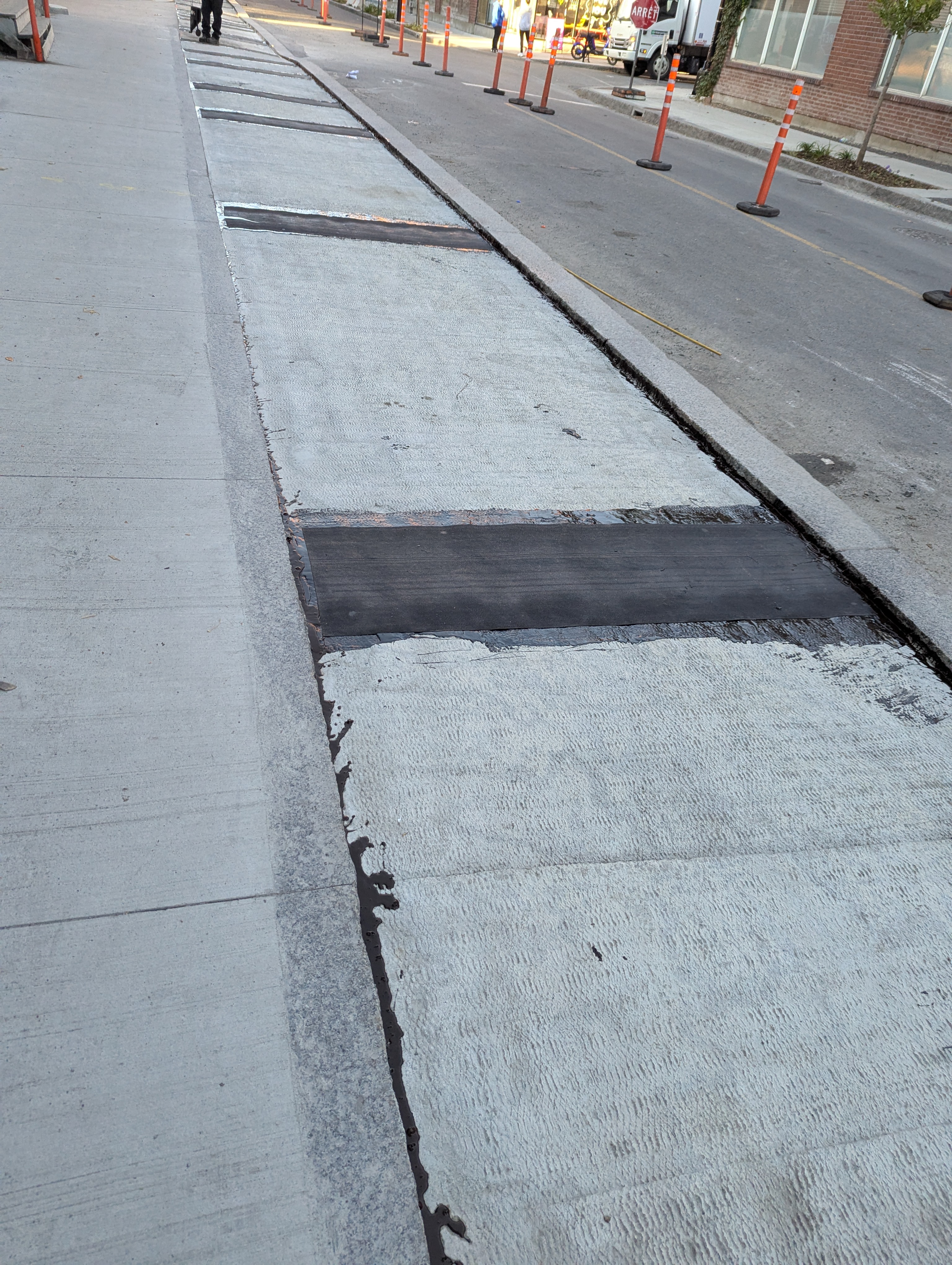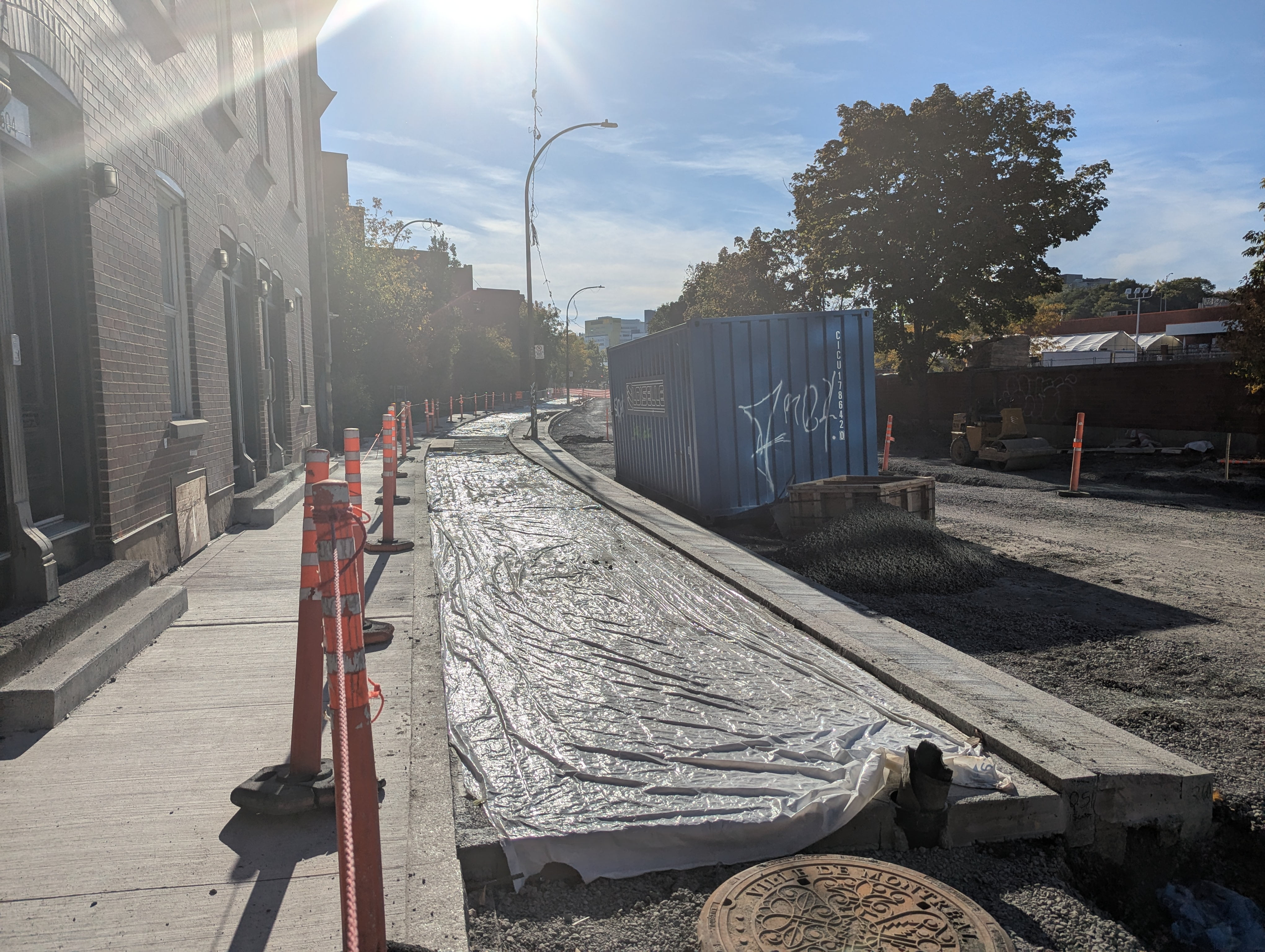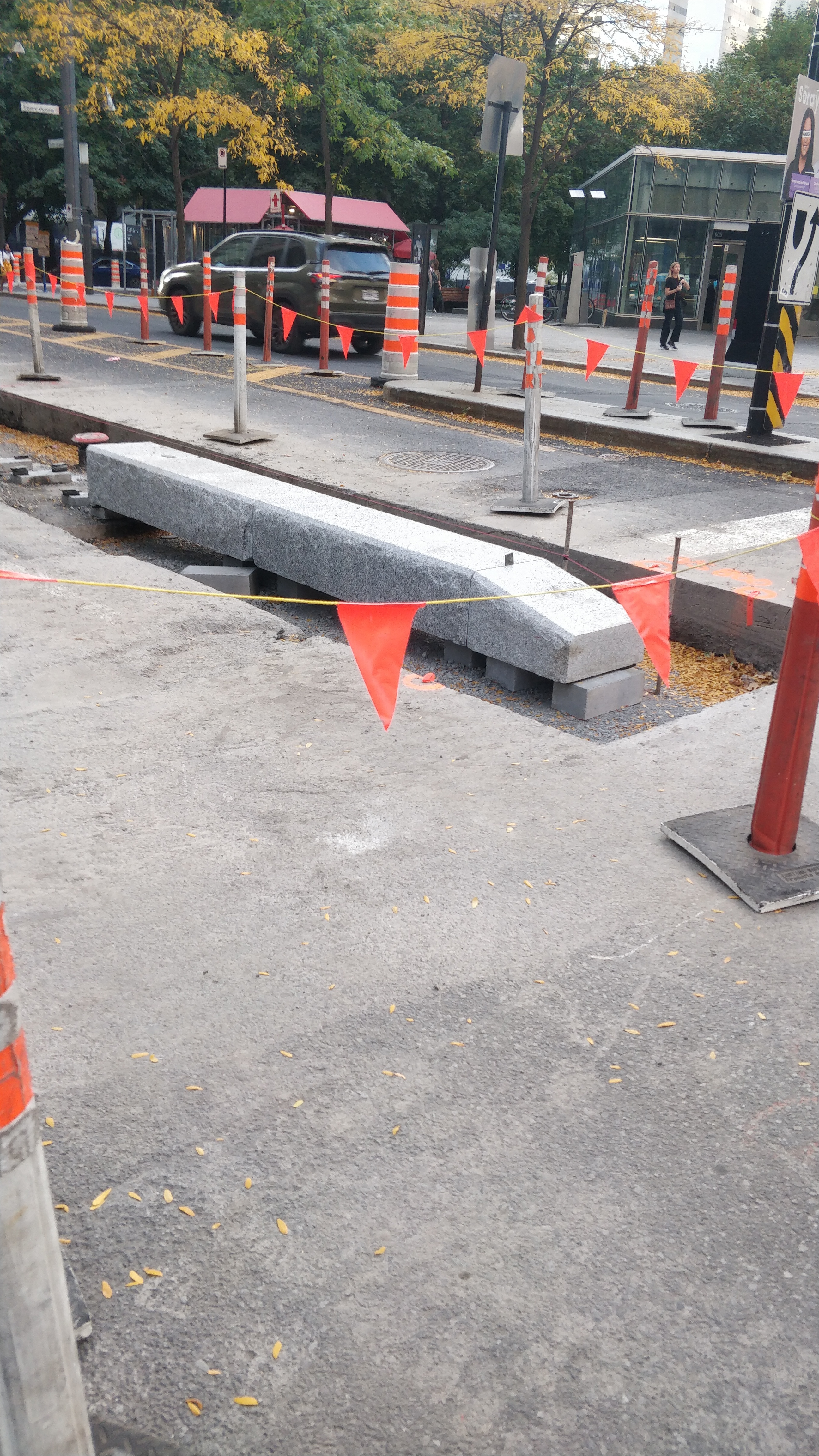 Installation des bordures en granite pour la dernière section de trottoir devant le CHUM ce matin!