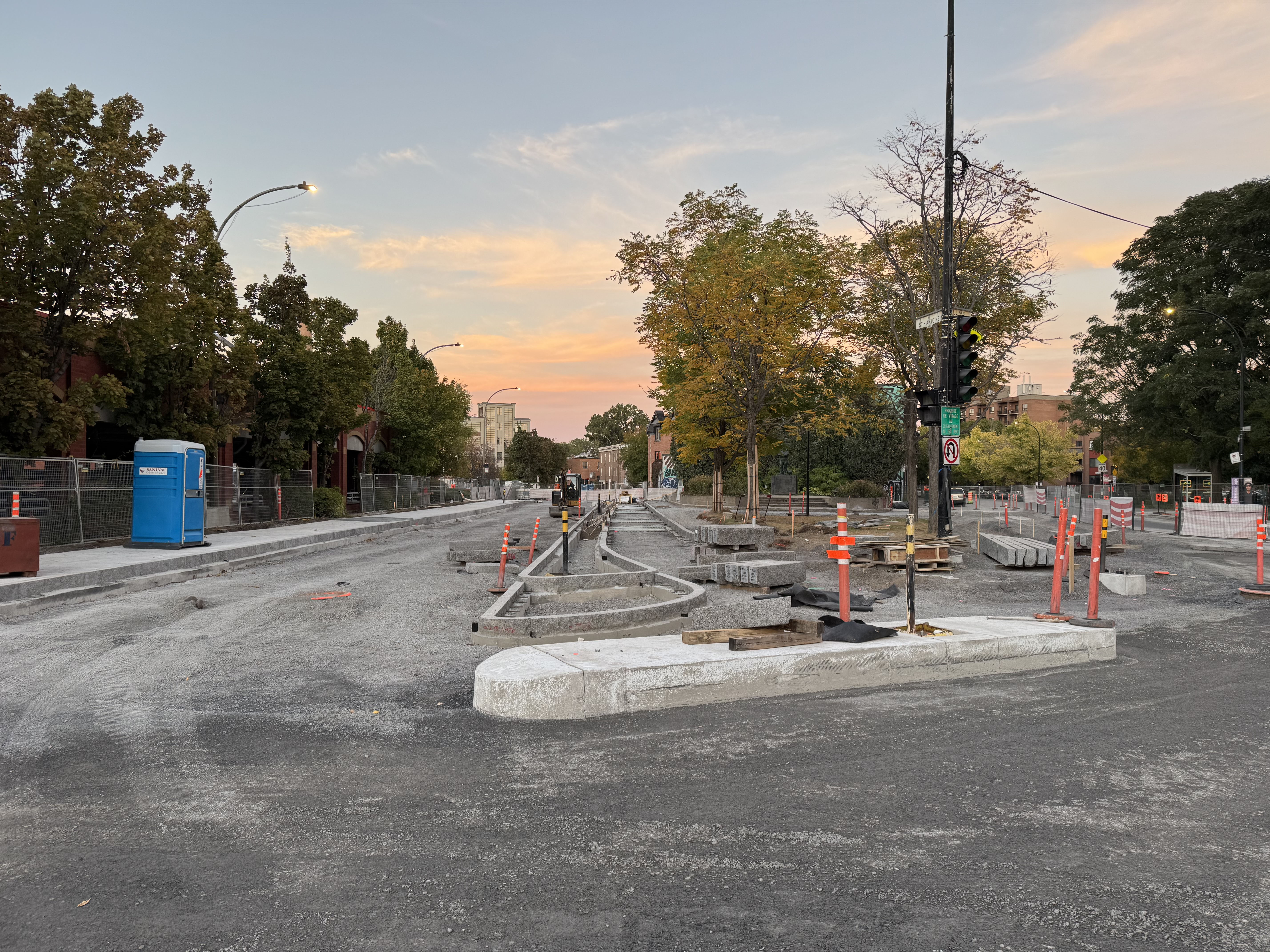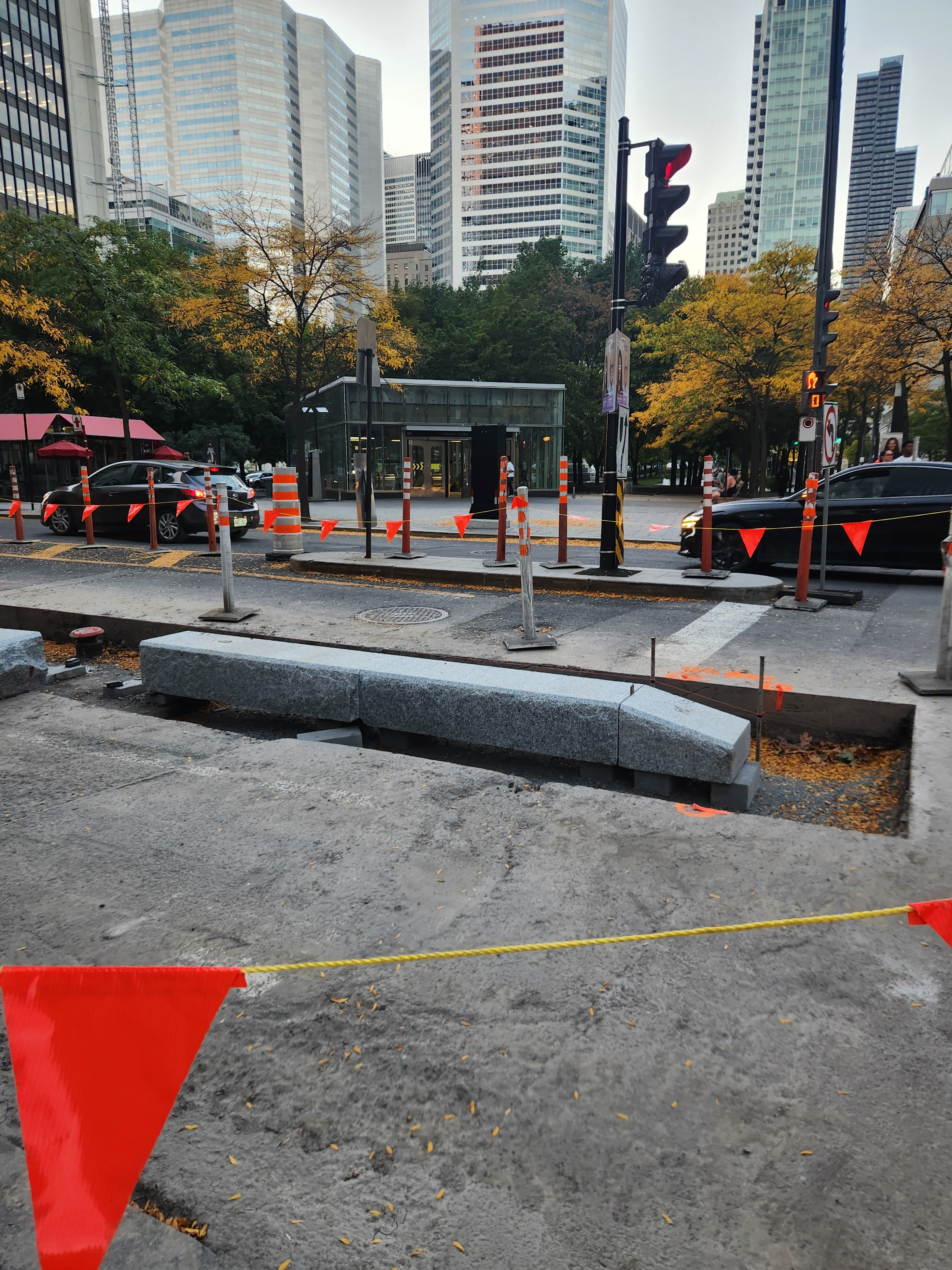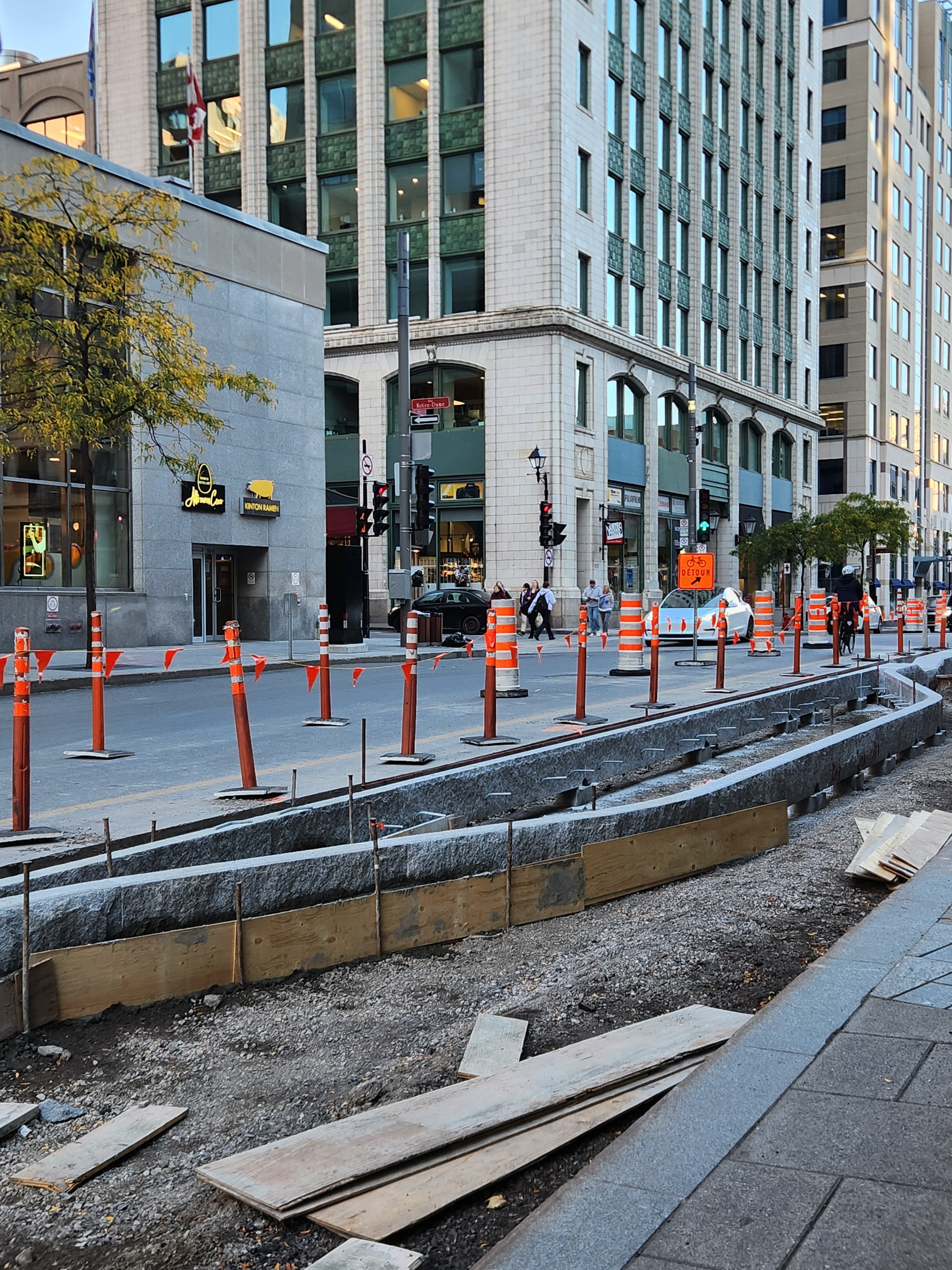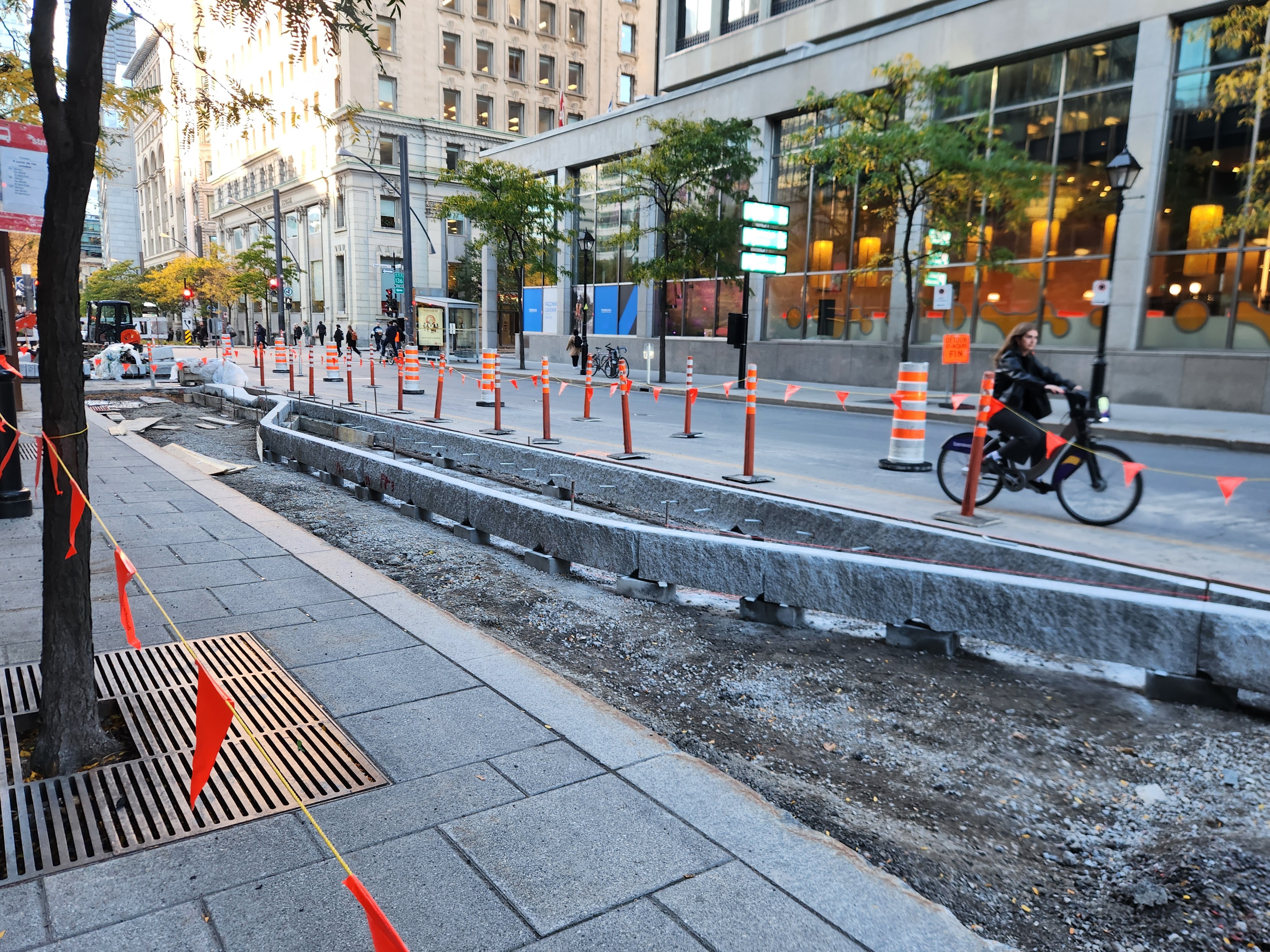 Les mails de béton protégeant le REV vont enfin être construits. Ce tronçon a été retardé en raison des échaffaudages autour du bâtiment au coin de Saint-Jacques et Greene