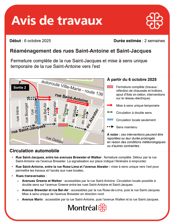 Il y a aussi cet avis pour la rue Saint-Jacques entre les avenues Brewster et Greene