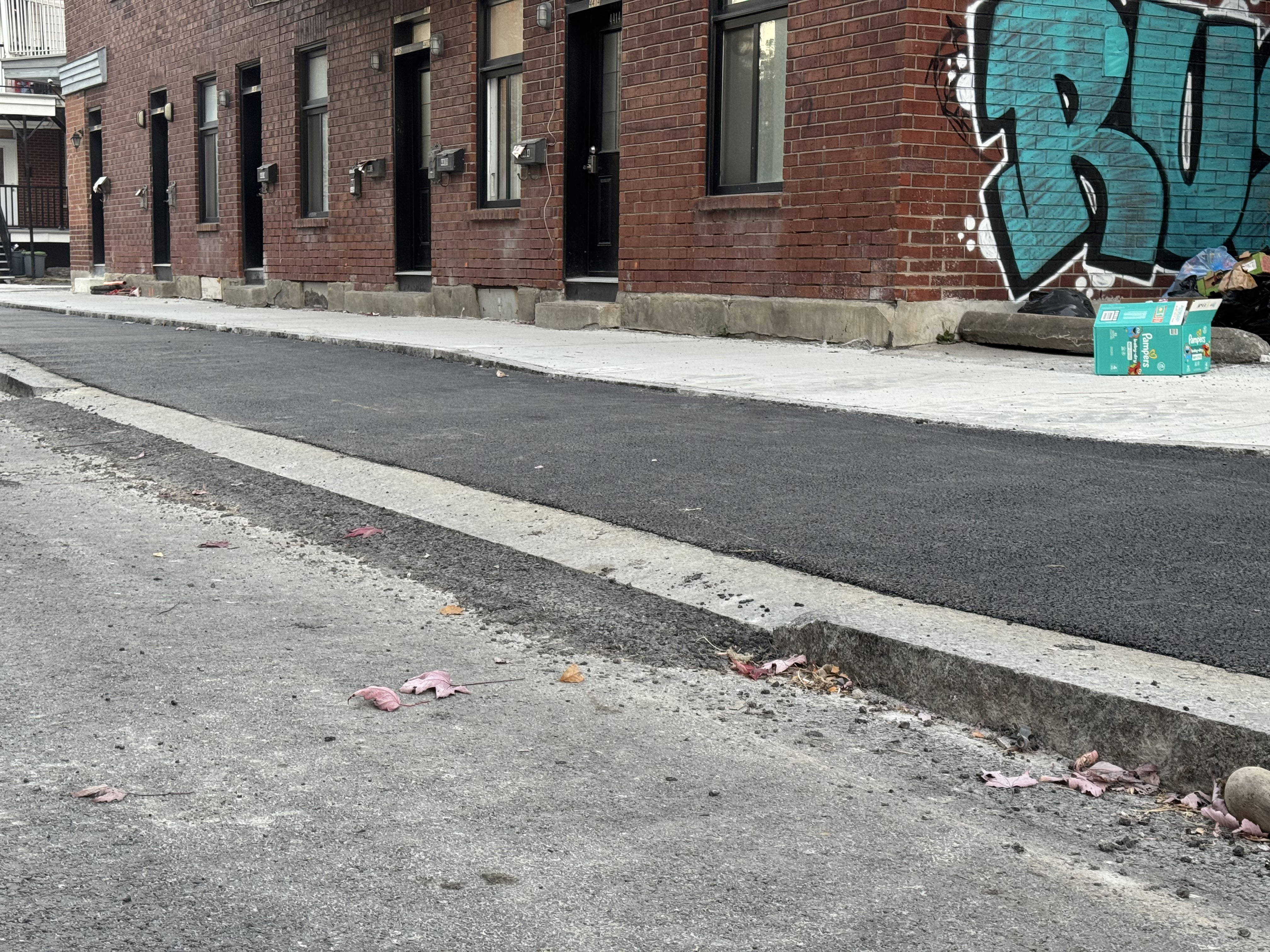 Je suis loin d’être un expert, mais j’imagine que c’est dû au fait qu’un côté du rouleau compresseur s’appuie sur la bordure de granit côté rue, ce qui empêche une compression idéale (ou dû au fait qu’il manque une légère quantité d’asphalte pour que ça soit compacté parfaitement juste un tantinet au-dessus de la bordure de granit)…