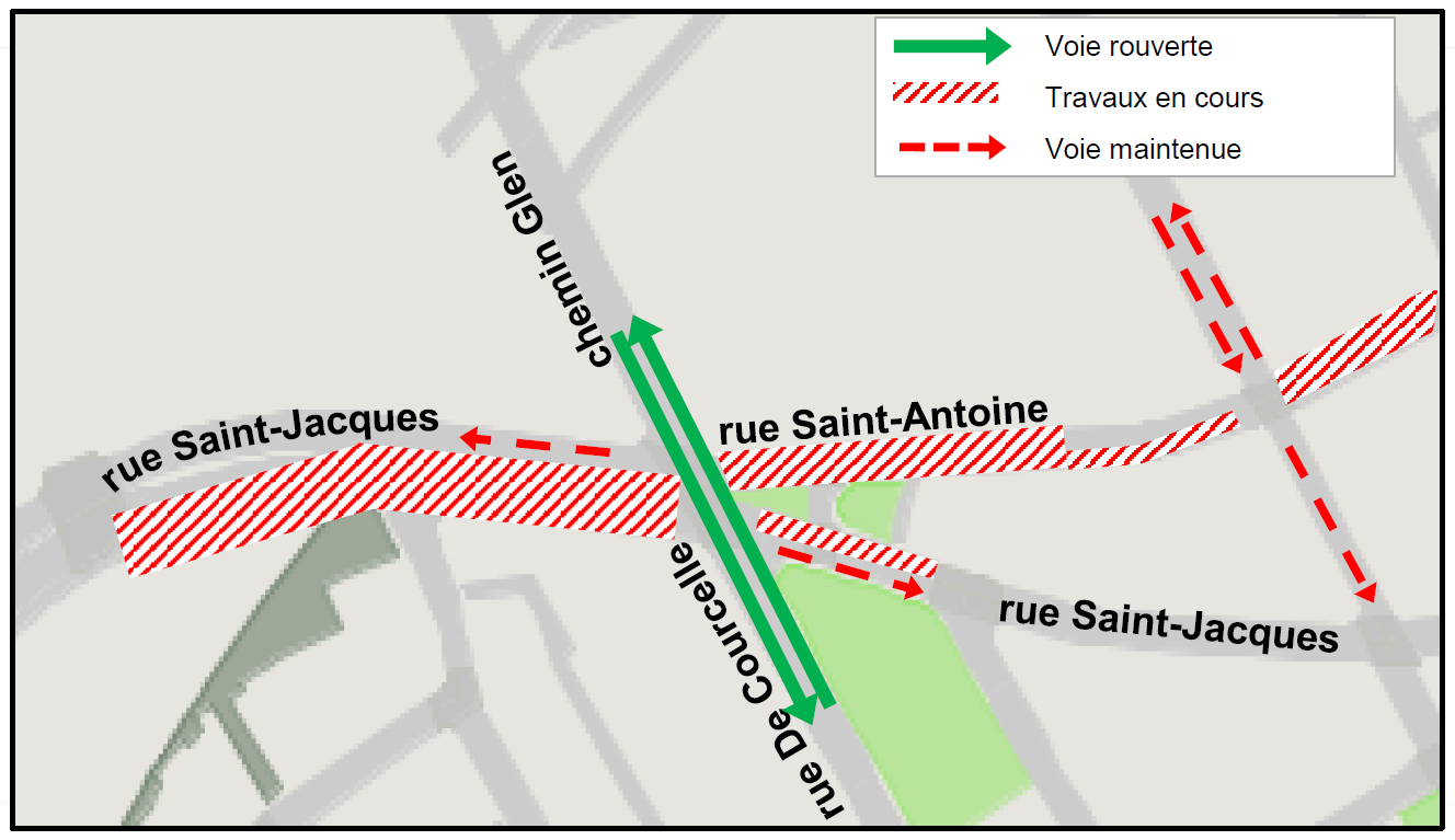 Réouverture d’une voie par direction à l’intersection du chemin Glen (rue De Courcelle) et Saint-Jacques
