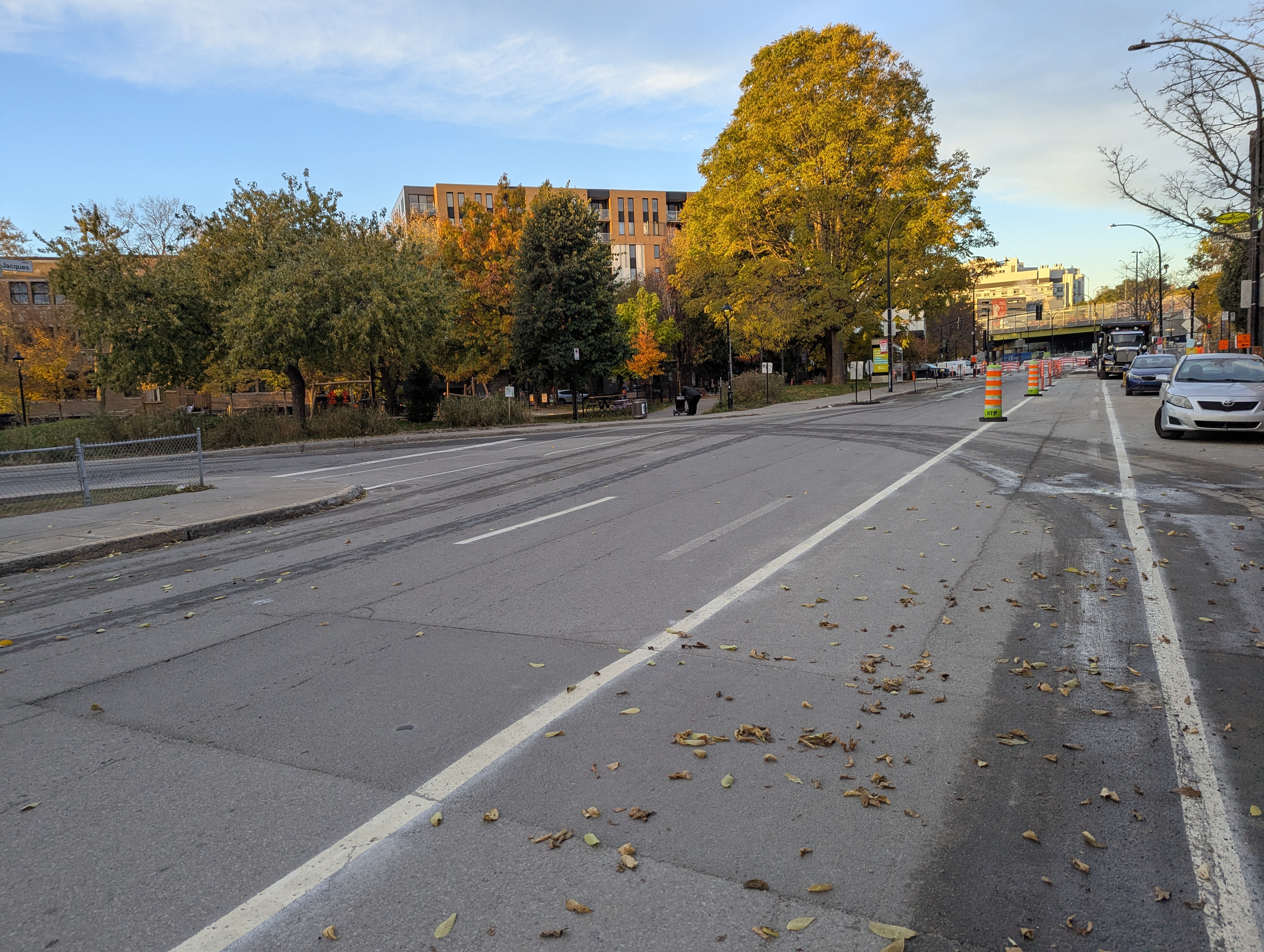 Et on t’a déjà expliqué pourquoi toutes les pistes n’ont pas la même largeur, ici-même dans ce fil. En plus, on est dans une logique d’aménagement transitoire sur ce segment, donc il est probable qu’une fois que la rue sera éventrée, on va reconfigurer la largeur de la piste (et des trottoirs). Voir mon message ici: