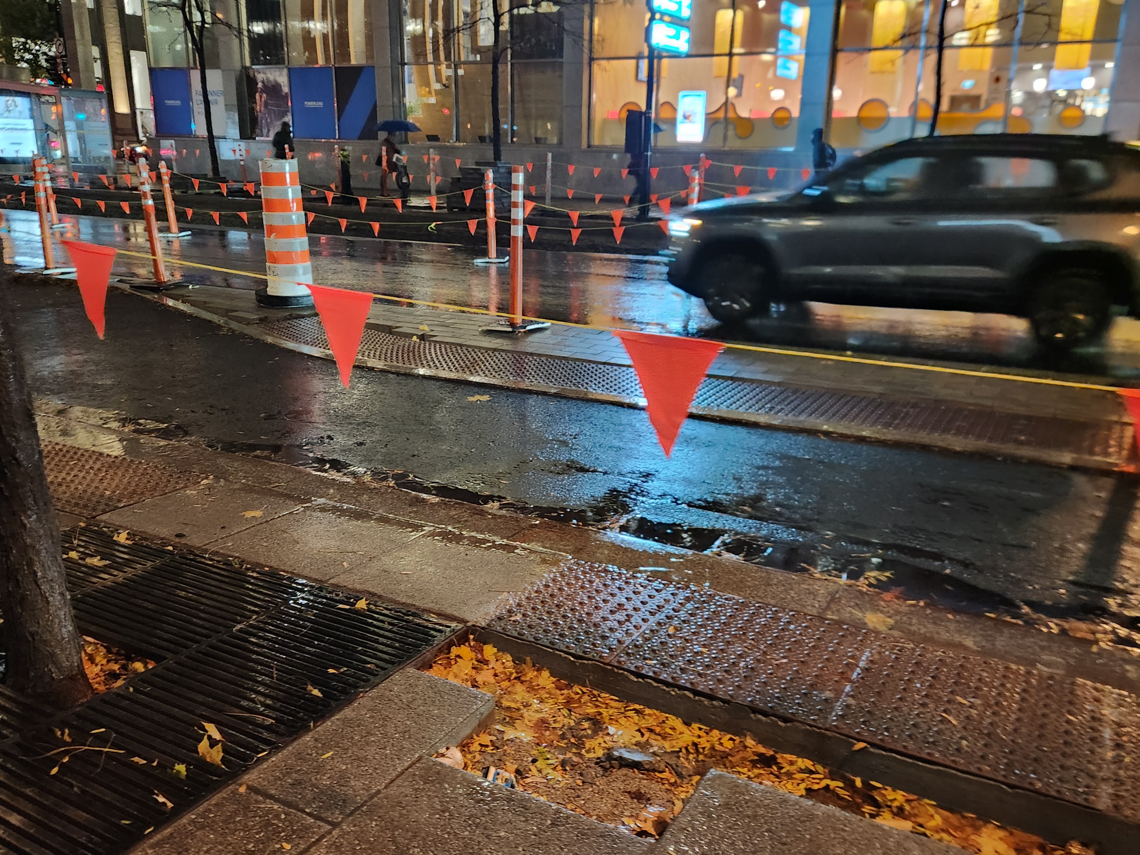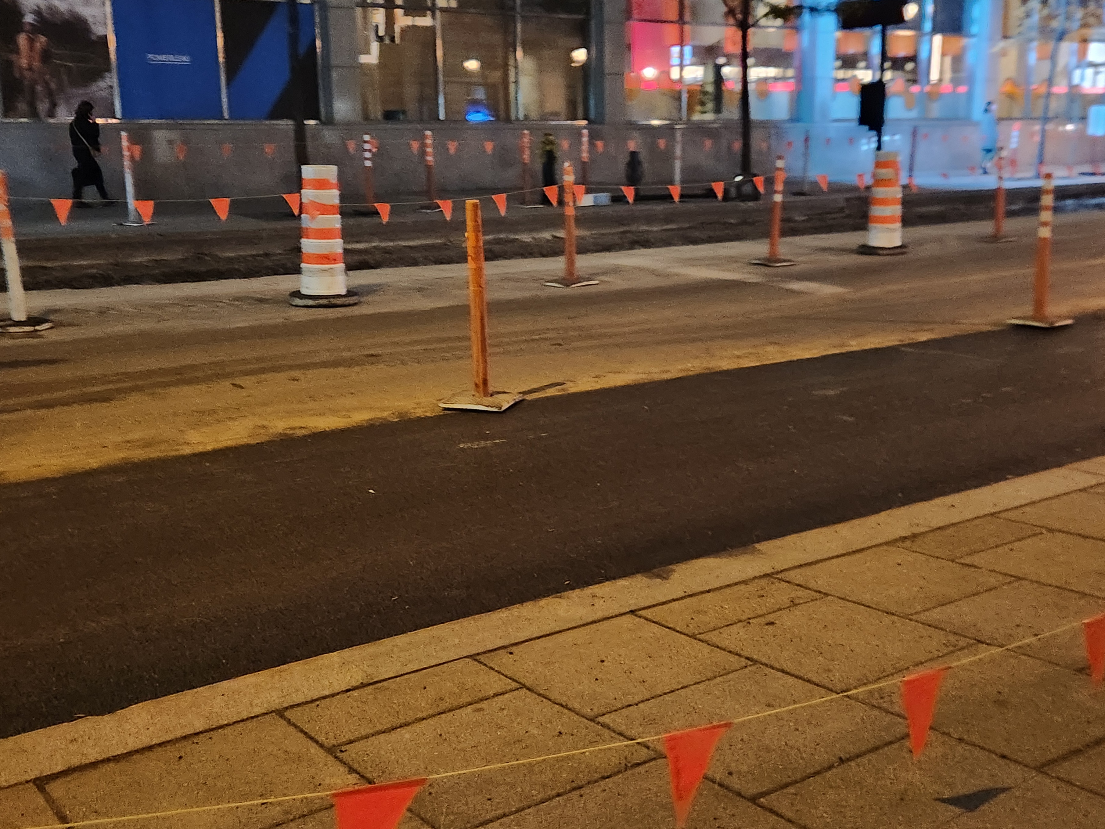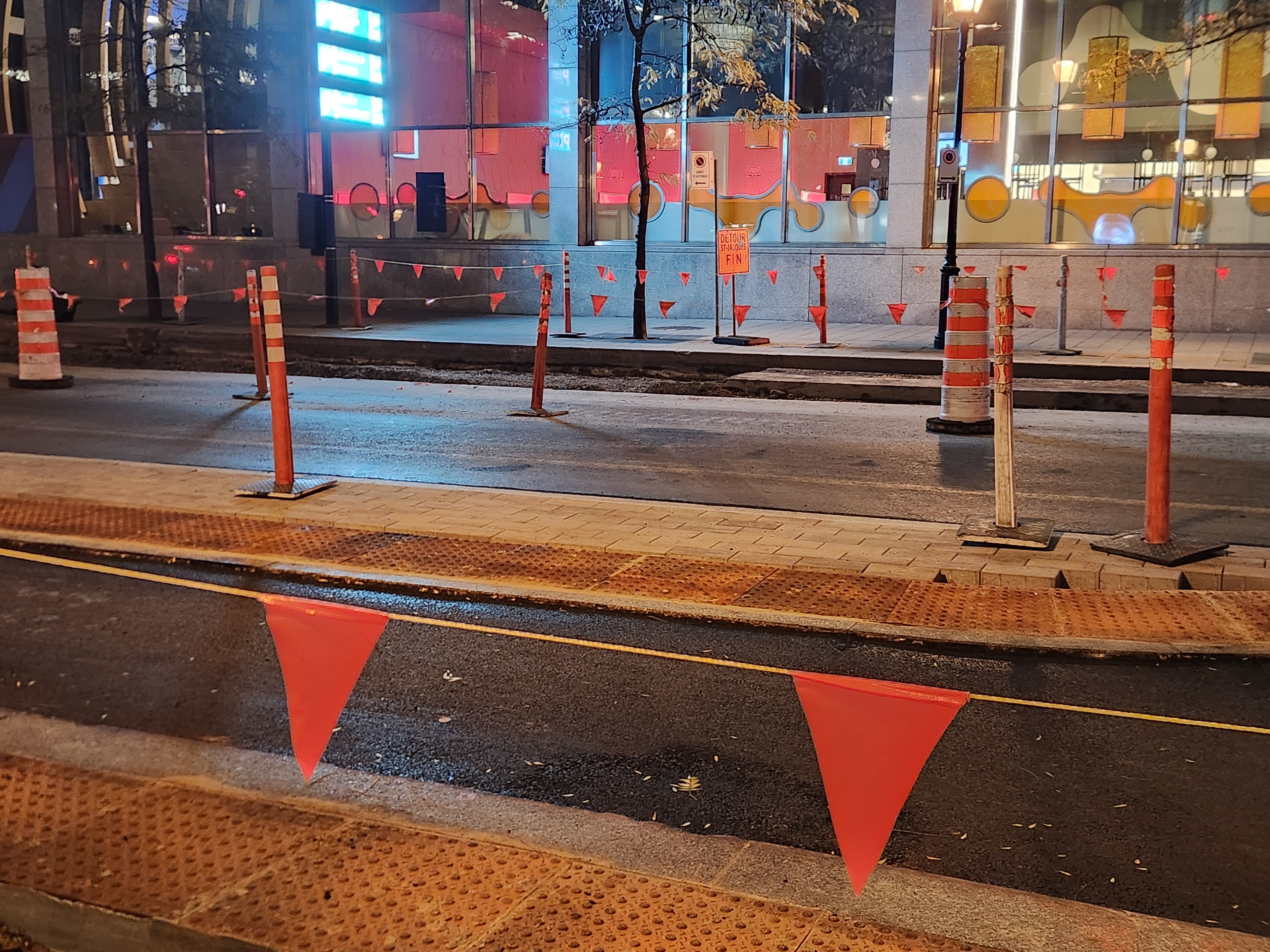Festival des fanions. On a débuté la construction de la voie cyclable sécurisée du côté est de la rue McGill.