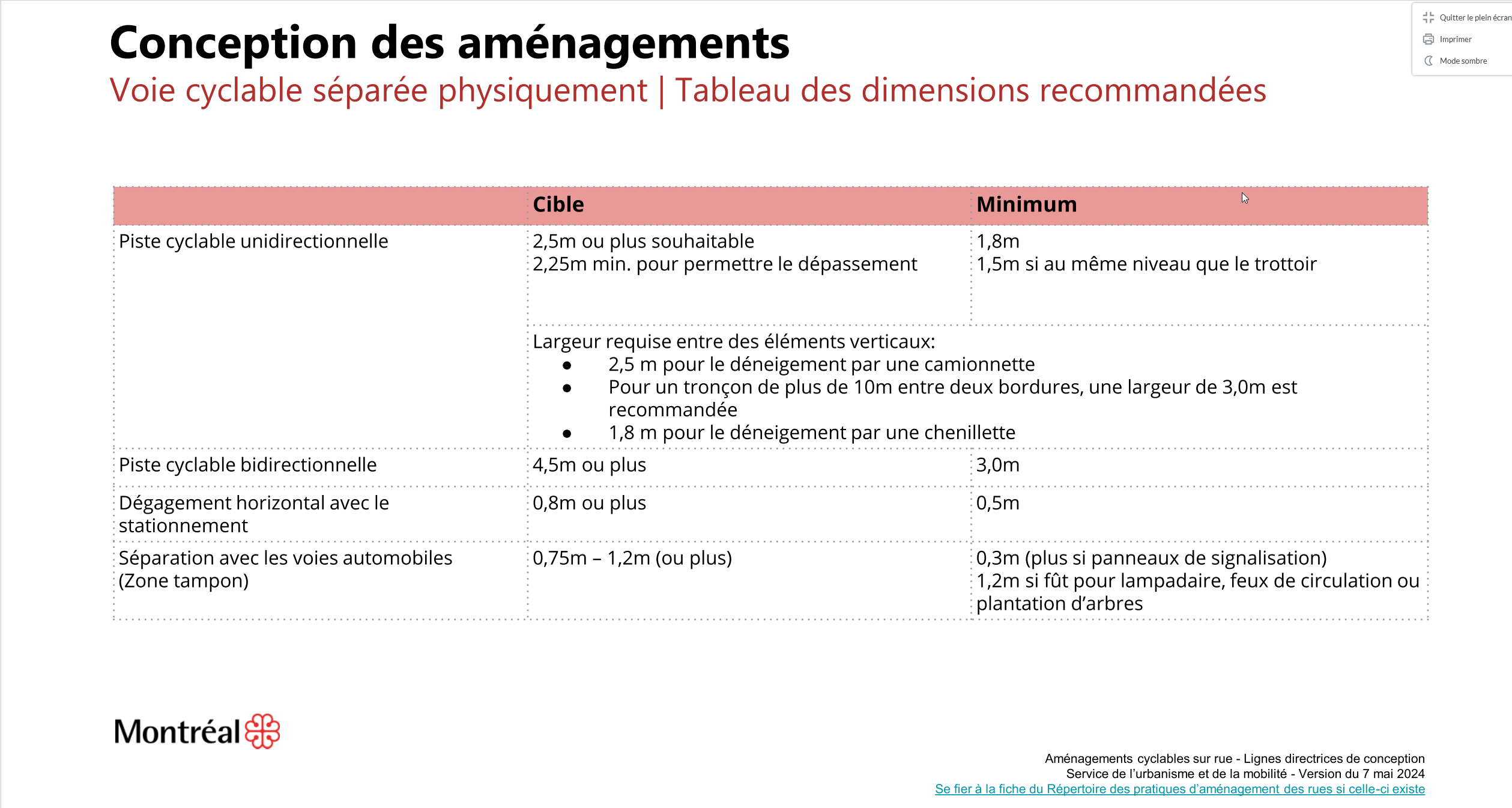 1- les largeurs sont définies de façon “minimales” et le standard existe déjà dans les manuels de la section vélo du PUM de la Ville. Tout est défini de façon claire. Ces standards sont des guides de bonnes pratiques.