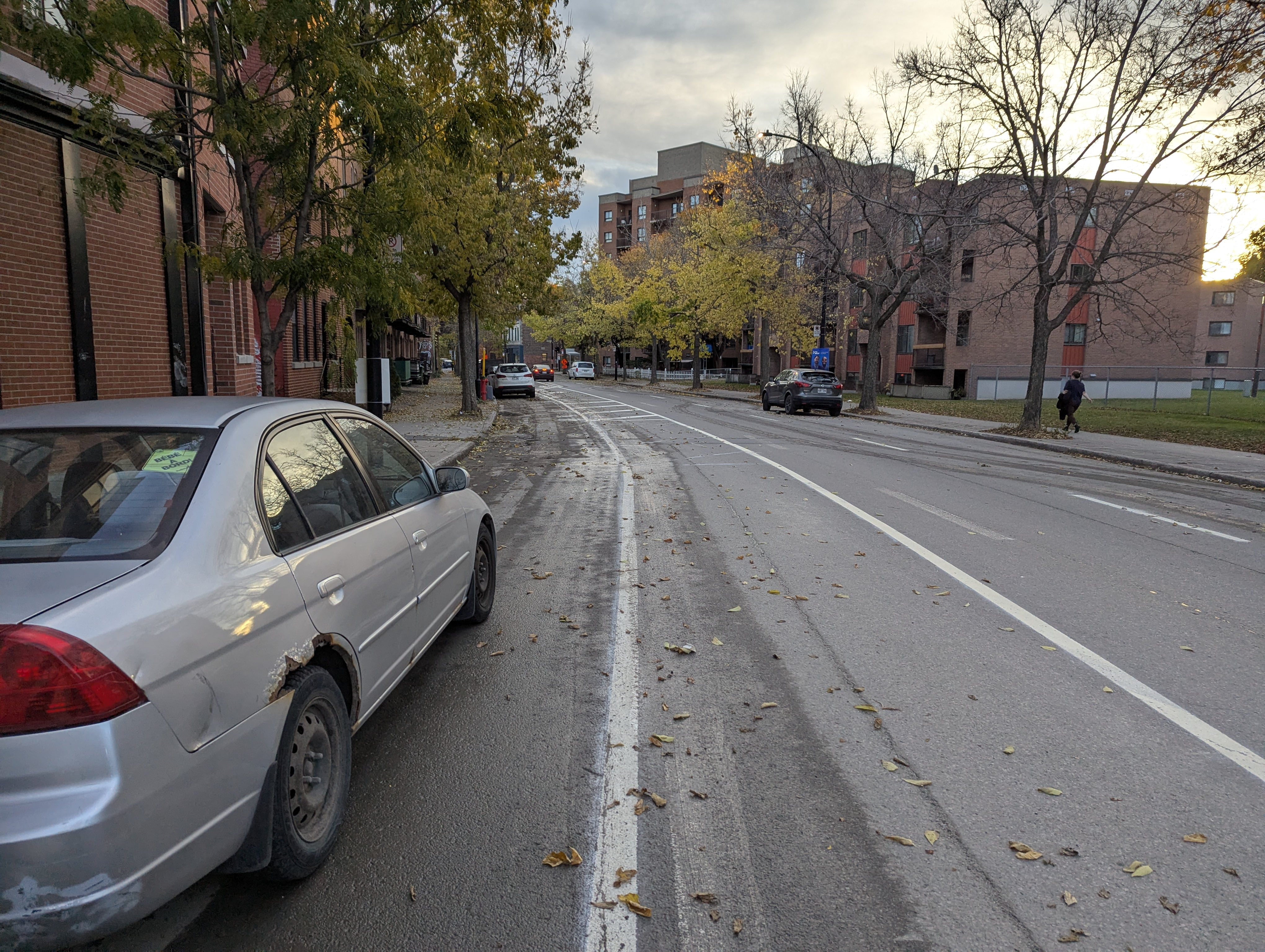 J’aimerais apporter deux précisions. D’abord, les voies véhiculaires ne sont pas plus standardisées que les voies cyclables. La première exemple qui me vient en tête est à René-Lévesque et Robert-Bourassa, où on passe de 4 voies à 3 mètres chacune à 3 voies, dont une à 3.5 m, une à 5.5(!) m et une à 3 m. Selon l’historique de Google StreetView, cette configuration date d’au moins 2007.