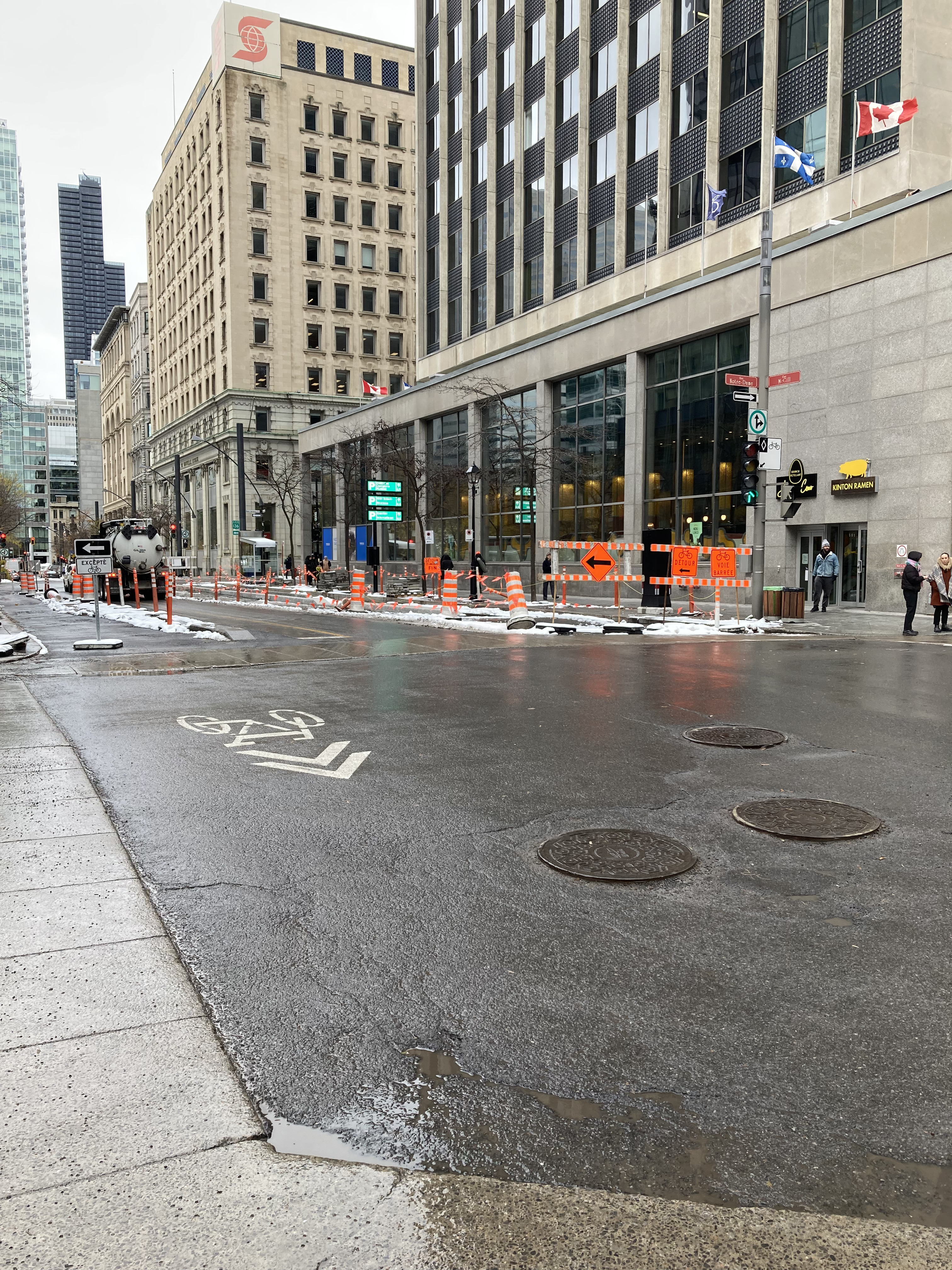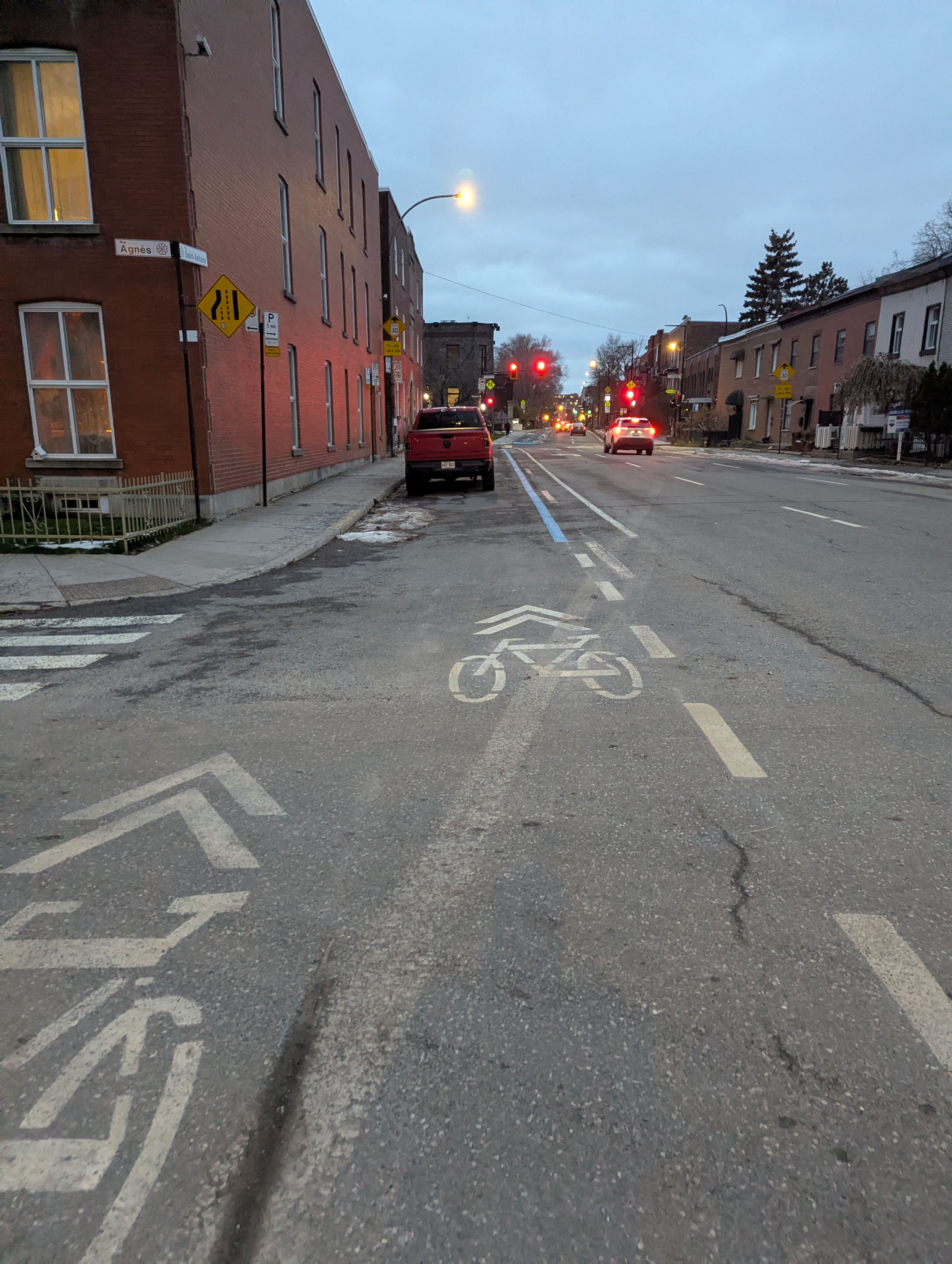 Tout le secteur Viger/Saint-Antoine est vraiment bizarre surtout quand le marquage au sol disparait c’est presque dangereux. Je pense notamment au segment entre RB et le centre Bell. En hiver et au printemps il n’y a plus de lignes au sol et on ne s’y retrouve pas.