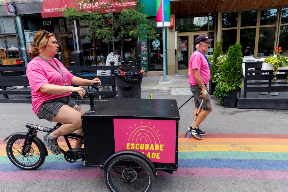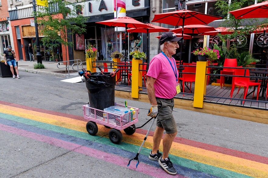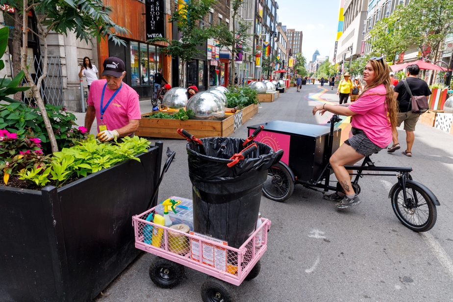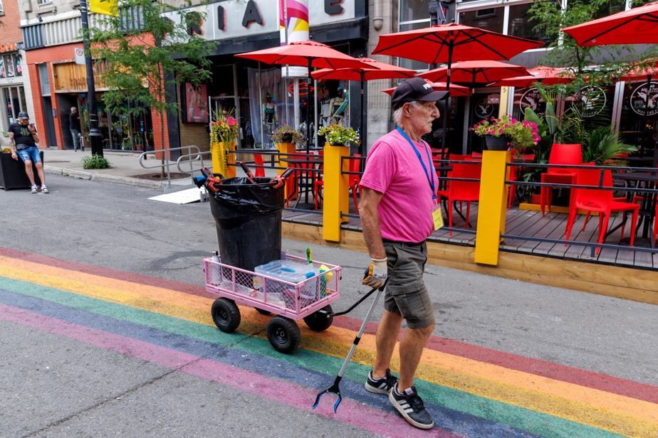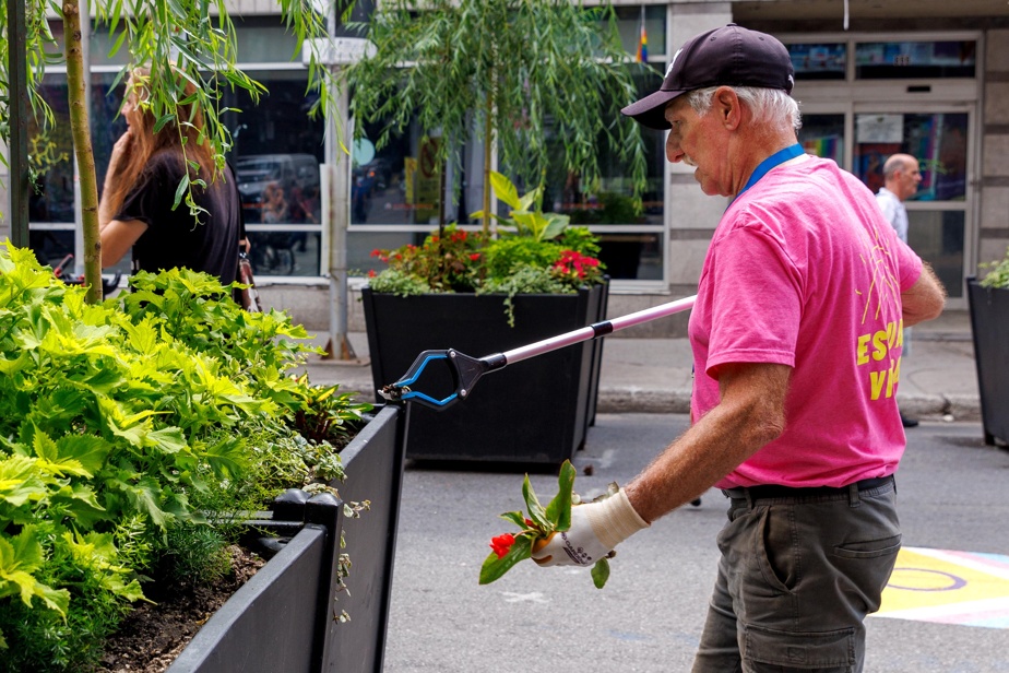 « Ce que je fais, je ne vois pas ça comme un travail. Je ne vois pas le temps passer », témoigne Claude Poirier, qui fait partie de l’une des quatre équipes formées par la Société de développement commercial (SDC) du Village en mai, au début de la piétonnisation de la rue Sainte-Catherine.