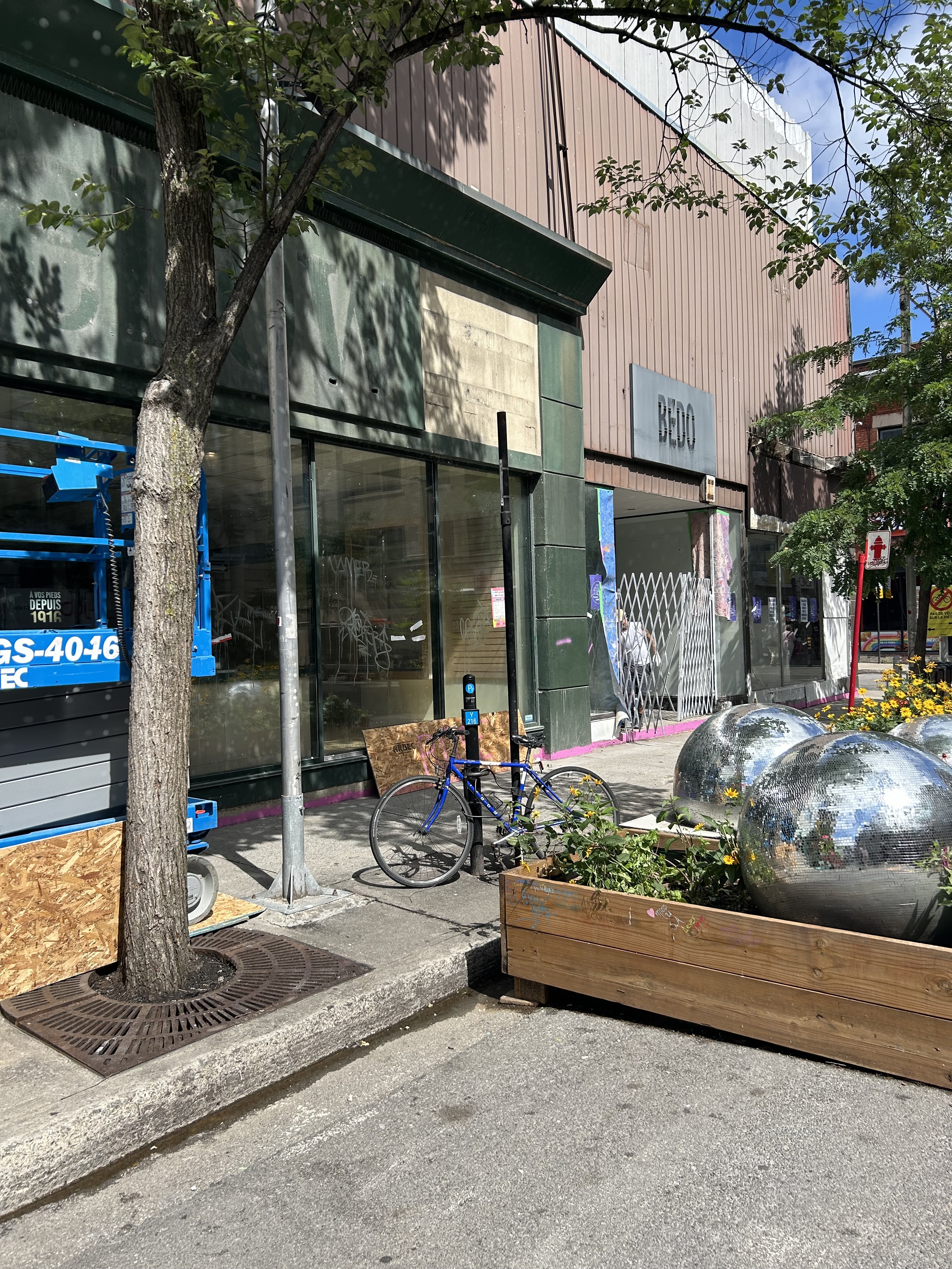 Lundi matin, dans le Village. Quelques déchets jonchent le sol, quelques éclopés de la vie dorment, accotés sur les boules disco géantes qui décorent la rue Sainte-Catherine, tandis que d’autres se préparent une dose de drogue et que des travailleurs se rendent au boulot.