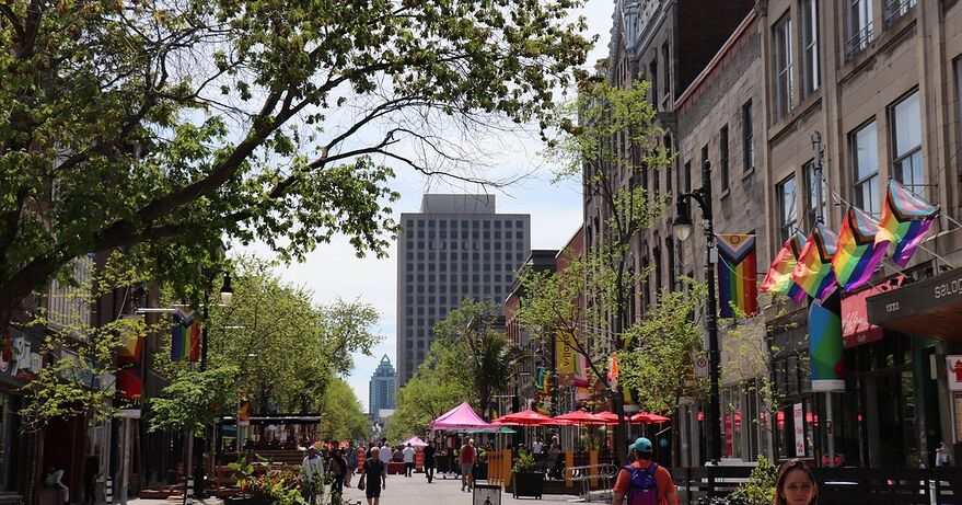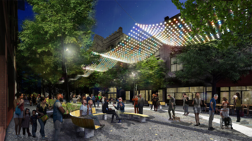 Un rendu de la rue Saint-Catherine Est une fois piétonnisée, avec un plafond lumineux.