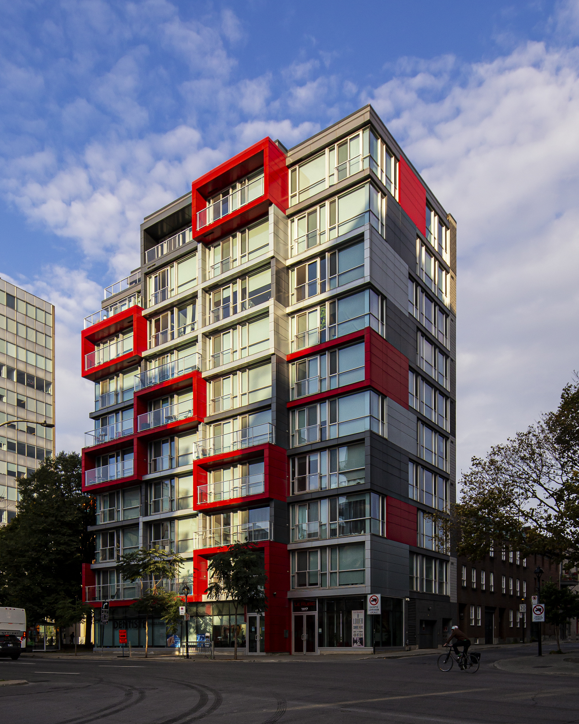 C’est futile, mais cette idée de documenter l’architecture montréalaise récente me fait sortir de chez moi à l’heure la plus agréable du jour; ça me fais jouer à nouveau avec mon appareil photo; et ça me donne aussi probablement le prétexte pour ne pas faire mon jogging.