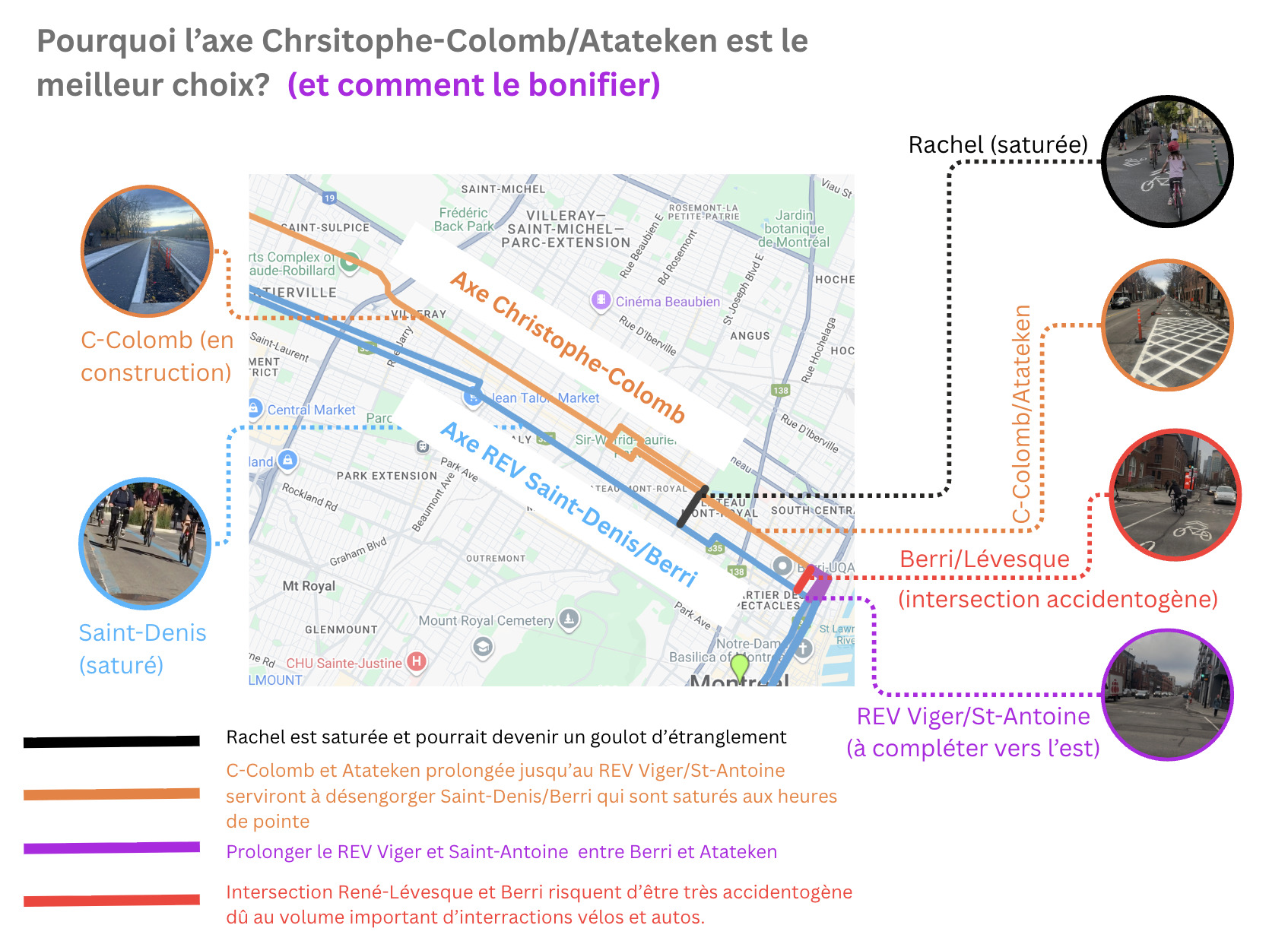 Avec le REV Saint-Denis/Berri qui se sature de plus en plus et avec l’axe Rachel qui se sature aussi, l’ouverture de Christophe-Colomb au Nord du Parc Laurier va amener un nouveau volume de cyclistes. Or sans continuité sur Atateken, les gens vont se rabattre sur Rachel pour aller chercher le REV Saint-Denis, congestionnant du coup ces 2 axes déjà achalandés.