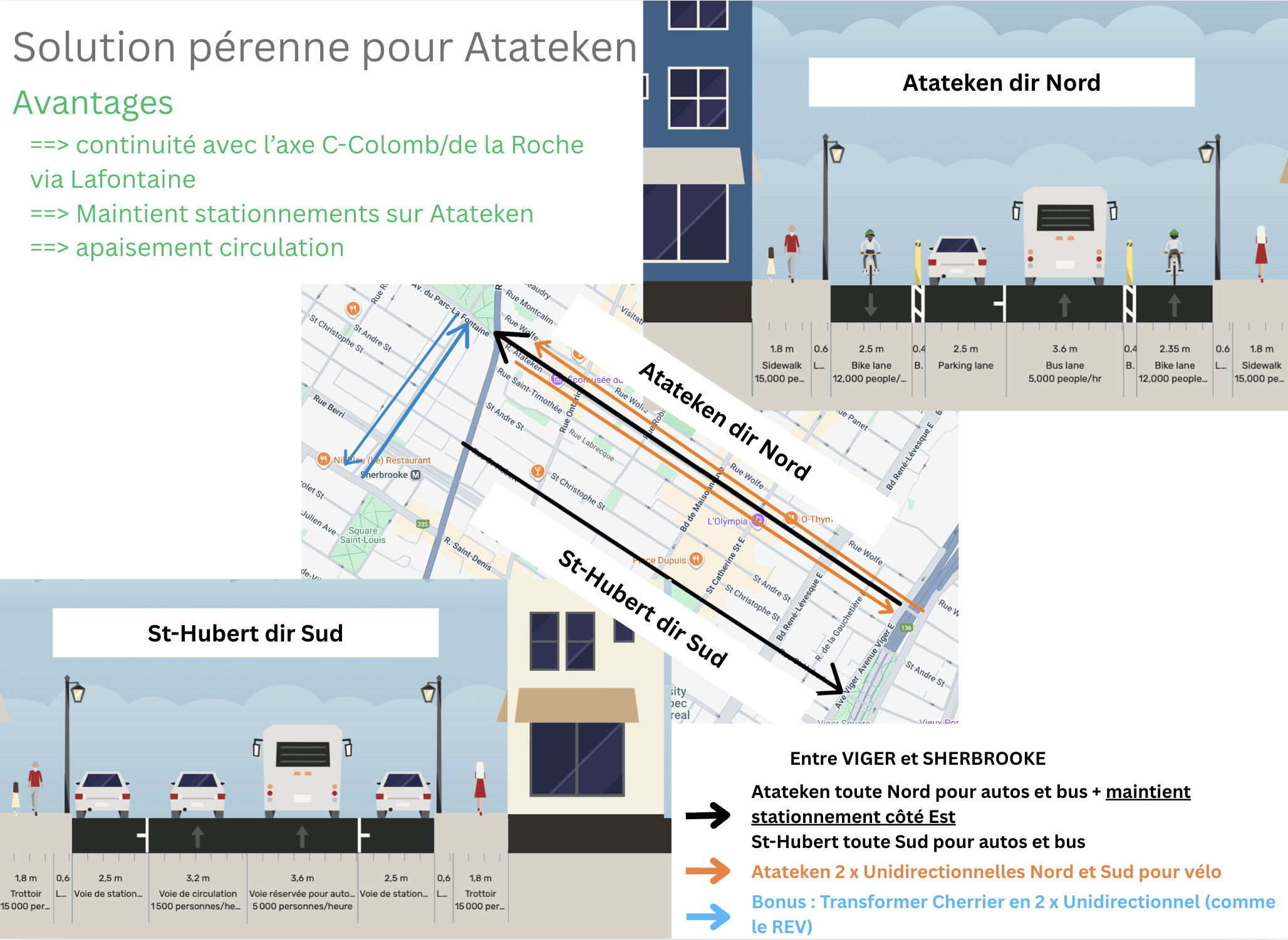 Atateken en 2 x unidirectionnelle pour les vélos viendrait sécuriser les déplacements actifs et maintient du stationnement.