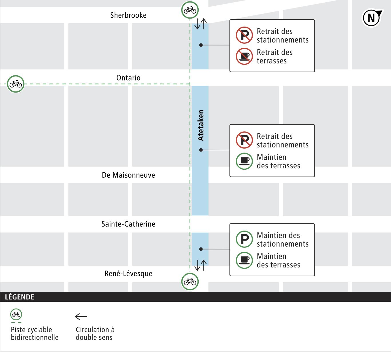 Corrige moi si je me trompe, mais je pensais que St-Hubert était prévue pour être en sens unique vers le nord dans les prochains jours. Si les commerçants tiennent tant à préserver du stationnement sur Atateken, ne serait-il pas possible de la mettre en sens unique vers le sud et rediriger la 14 Nord sur St-Hubert?