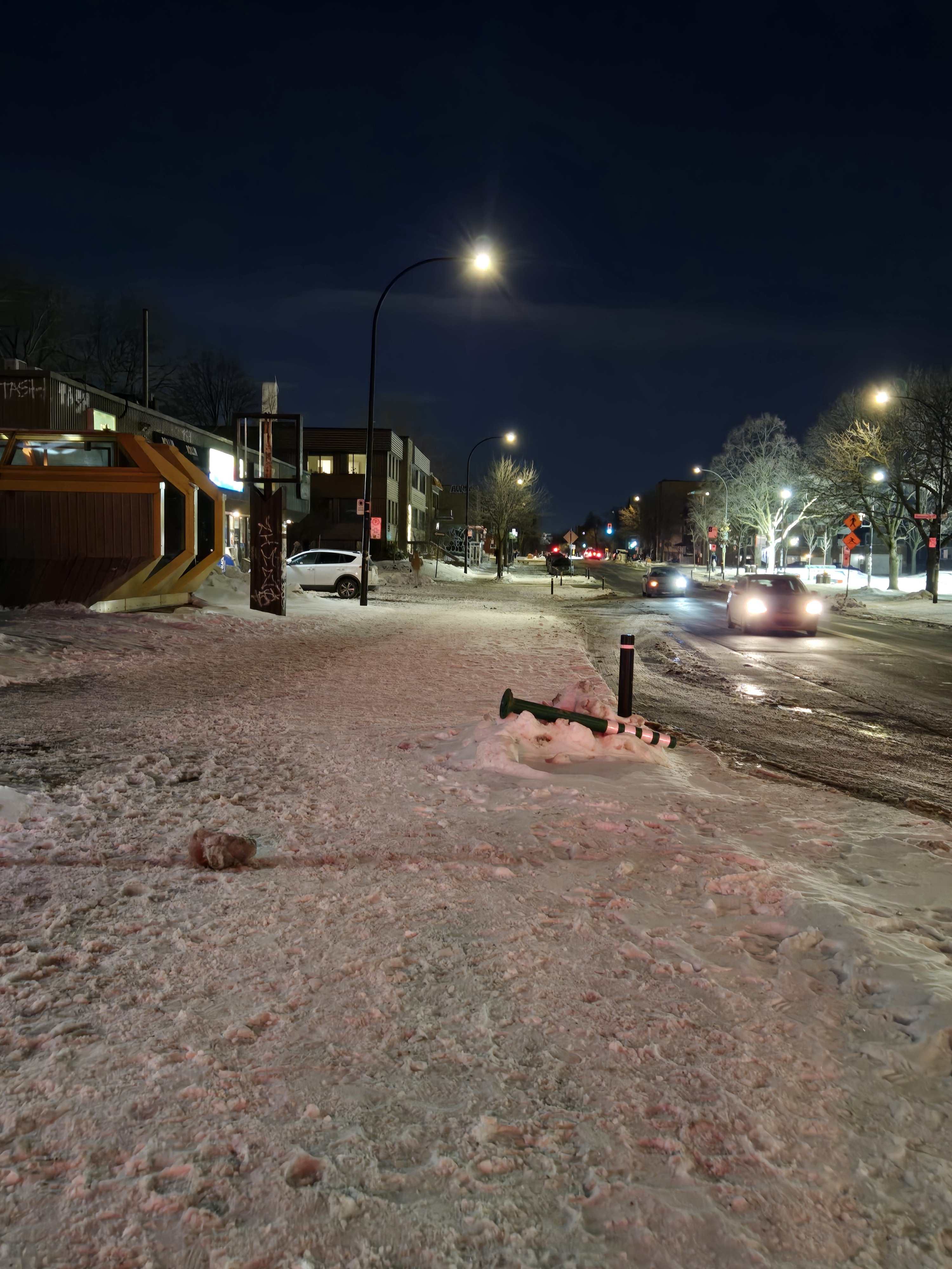 Pas trop sûr ce qui se passe ici, mais il y a encore des bollards arrachés comme ça semble être une constante dans les nouveaux aménagements utilisant ce pari résolument peu adapté au climat Montréalais.