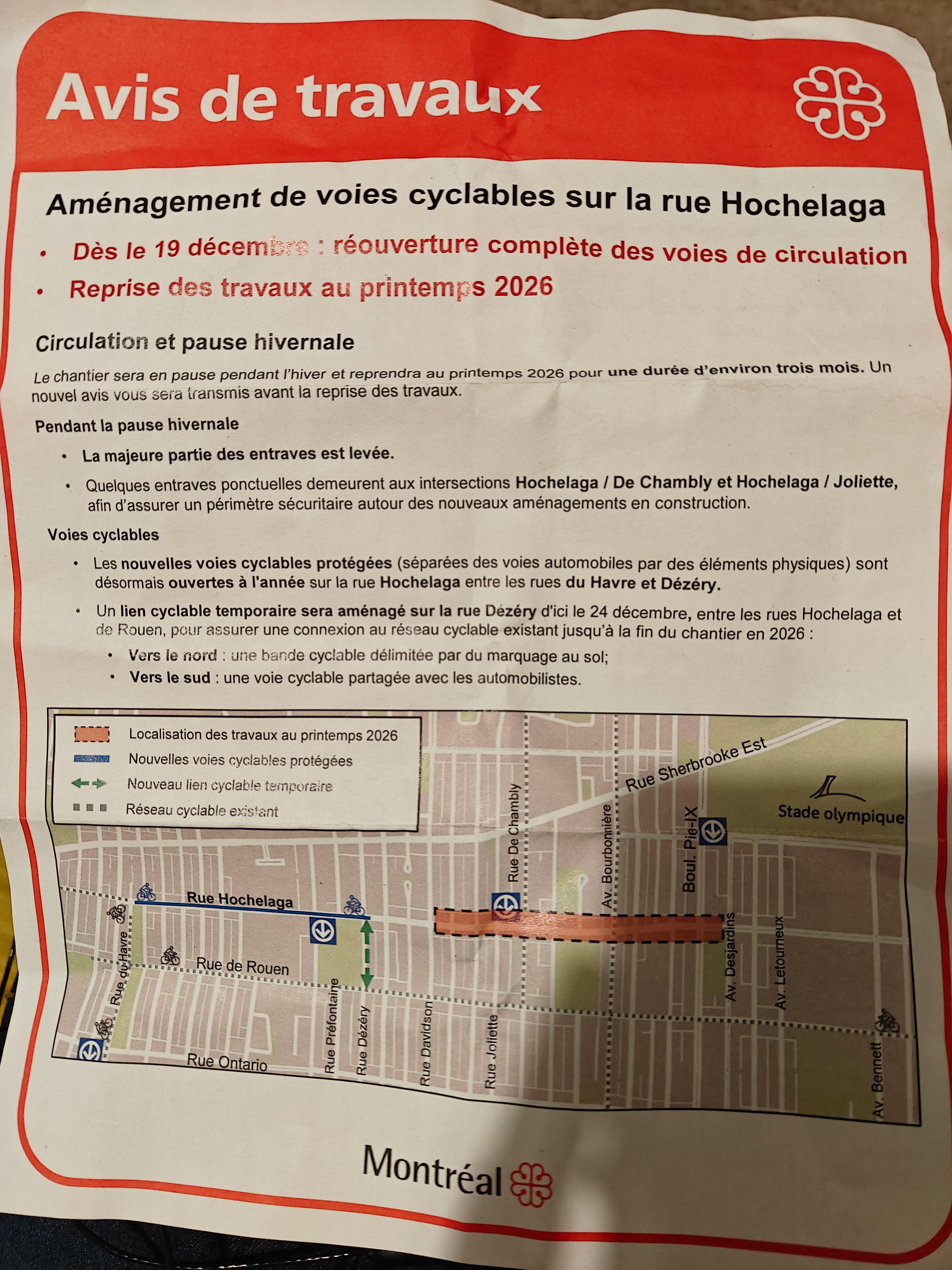 J’ai reçu l’avis pour la pause hivernale. C’est quand même étrange qu’on ne considère pas le segment entre Dézéry et Davidson comme complété, car il l’est techniquement. Tant mieux au moins qu’on ait ajouté le lien temporaire sur Dézéry.