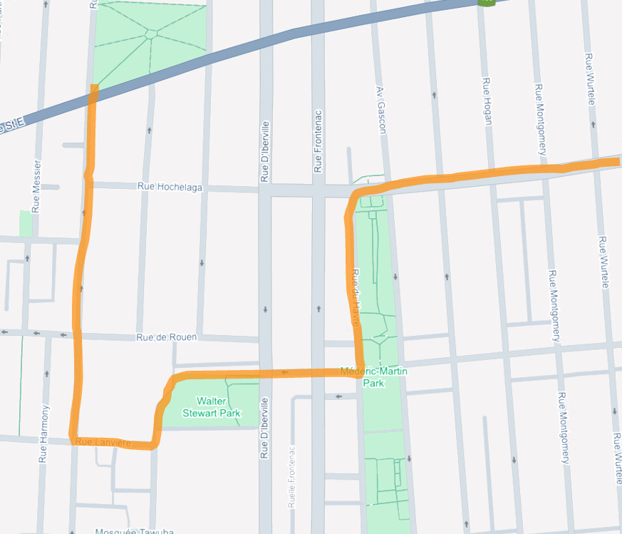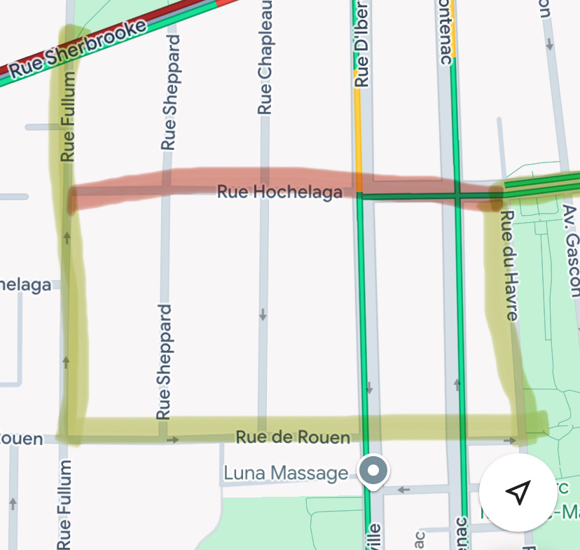 Le détour est encore plus grand, parce que la piste sur Rouen tourne sur Dufresne et Larivière avant de se connecter à Fullum. Ce sera un trajet intéressant pour les gens qui vont vers le sud/vers le centre-ville, mais effectivement pas très utile pour aller vers le Plateau.